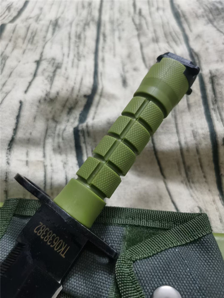 绿版M9军刺 全长:33cm 刃长:9.8cm 刃厚:6.5mm 刃材:9铬15钼钒钢 硬度:58 重量:刀470g+鞘375g 柄材:尼龙 刀鞘:尼龙 重量:745克