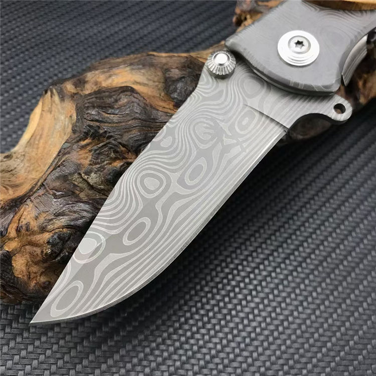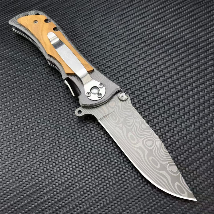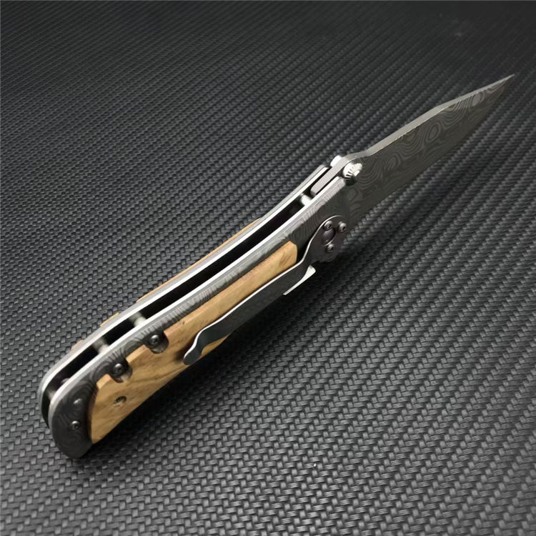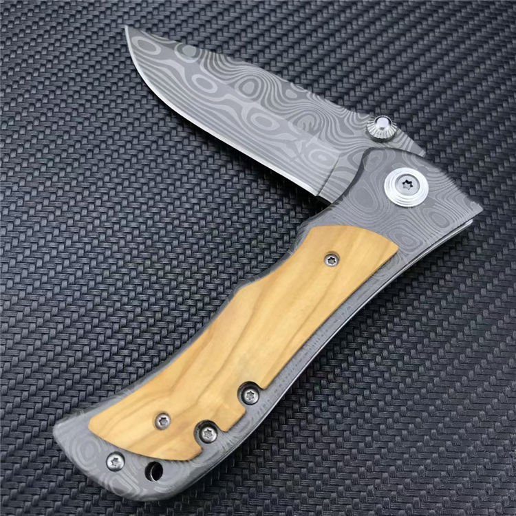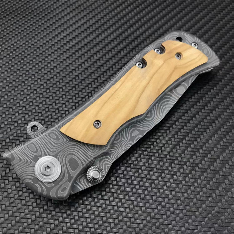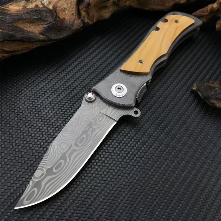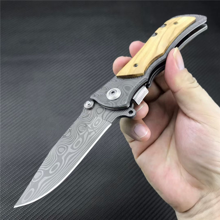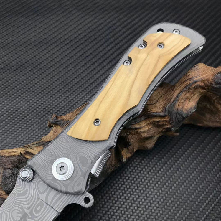 339花纹折刀 全长:20.1CM 刃长:8.7CM 刃宽:2.5CM 刃厚:2.5MM 刃材:5CR13MOV 表面:灰钛涂层激光大马士革花纹 柄长:11.4CM 手柄:不锈钢镶嵌橄榄木 重量:210G