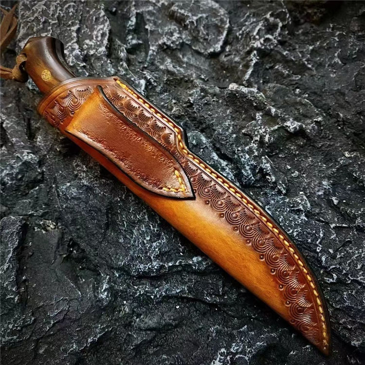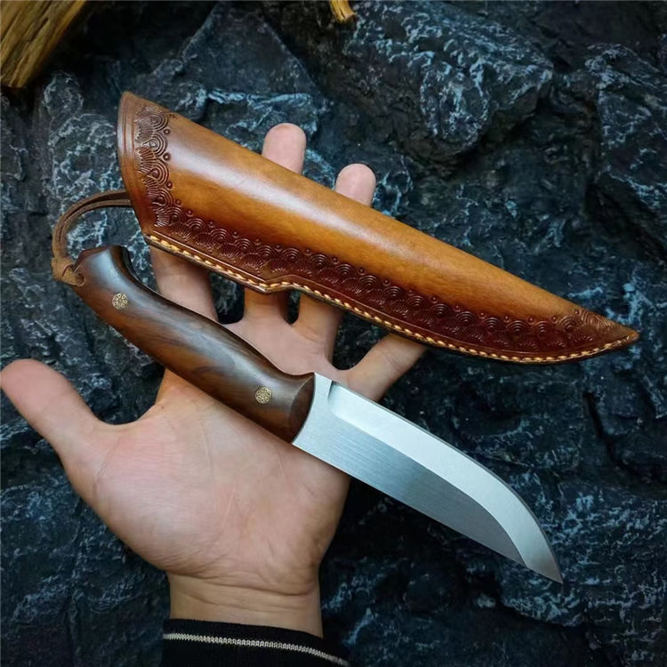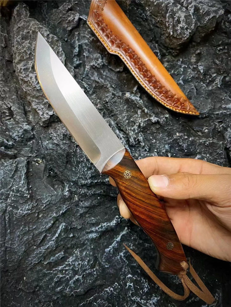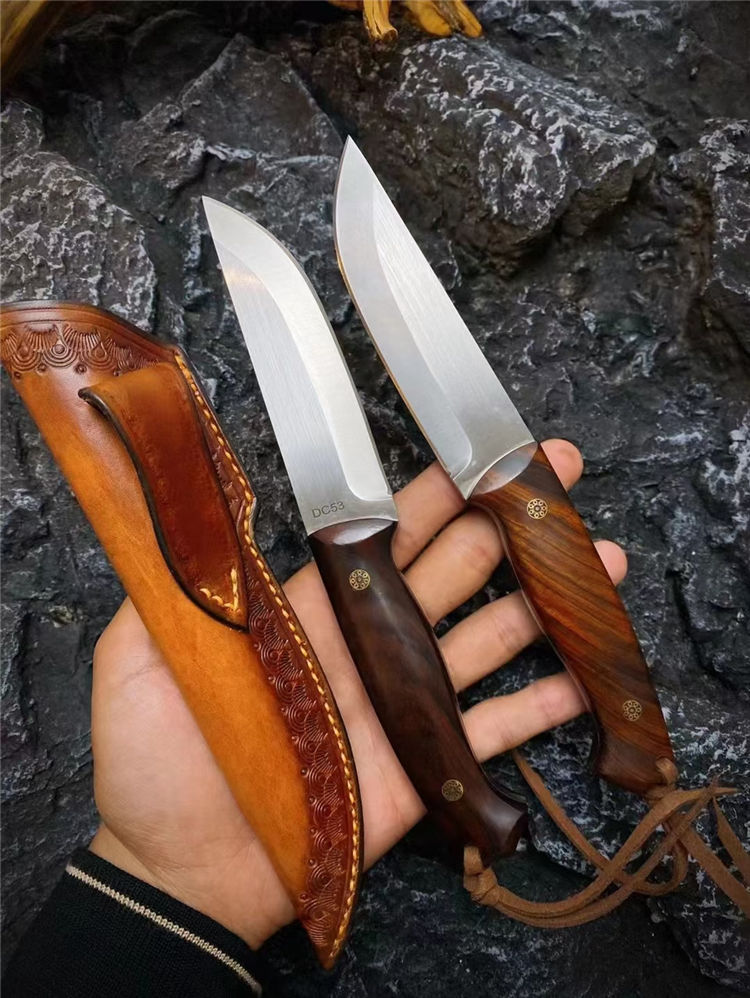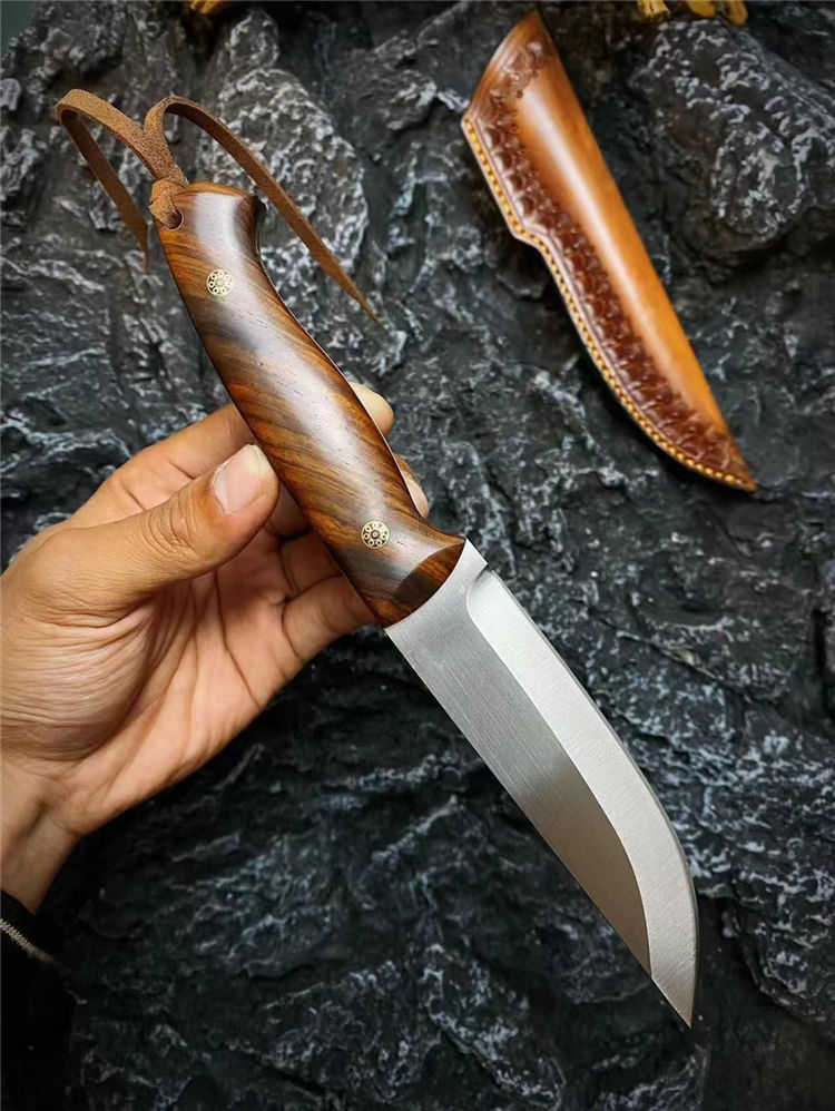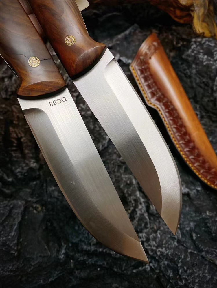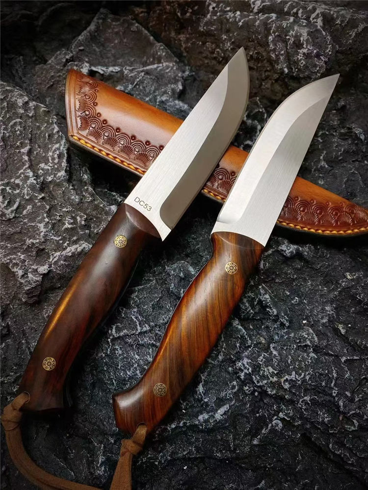 桑纳直刀 总长:22.2cm 刃长:11cm 柄长:11cm 刃宽:3cm 厚度:5MM 硬度:60HRC 刃材:DC53合金一体钢 表面:手工拉丝 柄材:微粒黄檀木制作 包装:黑色盒+手工皮套