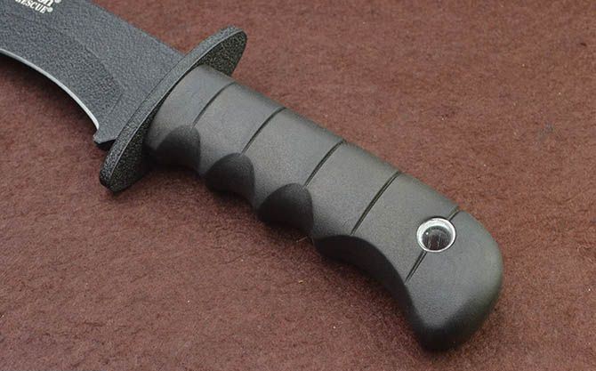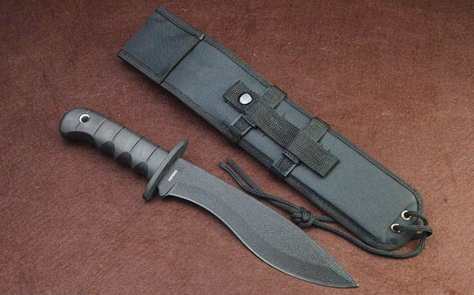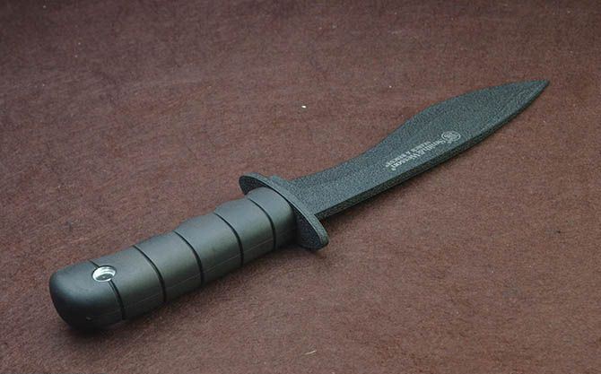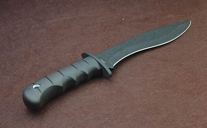 全长:35cm 刃长:20.5cm 刃宽:4.5cm 刃厚:0.58cm 刃材:440C 硬度:57HRC 表面:特氟龙 柄材:橡胶 柄长:13cm 结构:刀身贯穿刀柄,铜钉固定,非常牢固。 毛重:720克 附件:专用战术尼龙套 品质:OEM代工正品 产地:中外合资