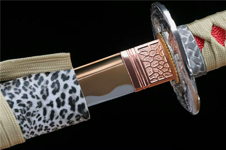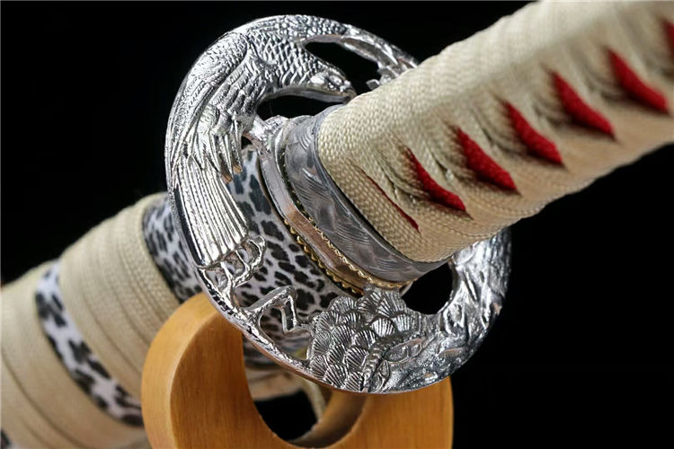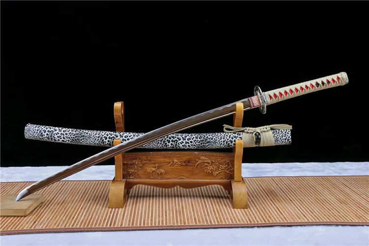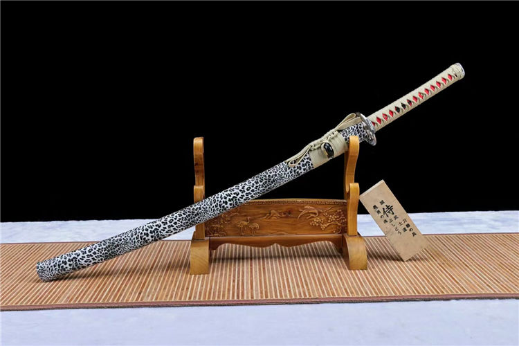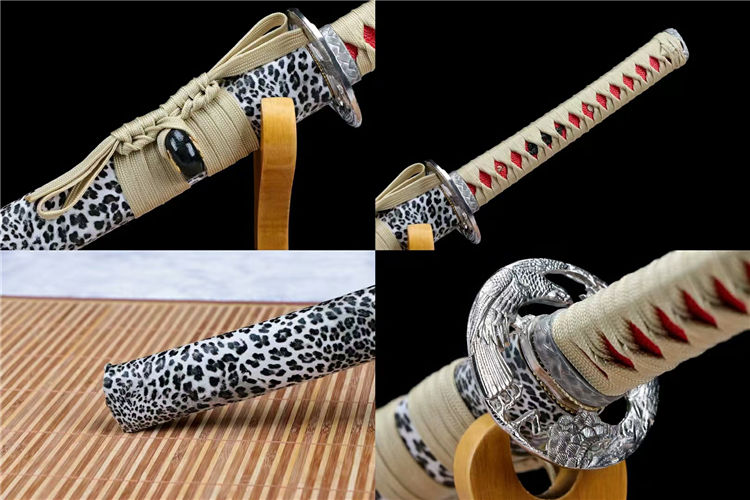 雪豹武士刀 刃材:手工高碳钢锻造、烤金工艺 装具:合金镀金飞鹰刀镡 鞘材:实木鞘外包雪豹皮革 柄材:实木绕绳 适合:收藏 防身 情侣配送 乔迁送礼 武术健身 精美摆设 赠品:精美锦盒、护理油 性能:锋利度达到极致、过水、劈竹切菜似的 工艺:刀身千锤百炼、经打胚、热锻、铲、锉、磨、热处理(淬火)回火、初修、精修、等龙泉古法数十道手工制作而成