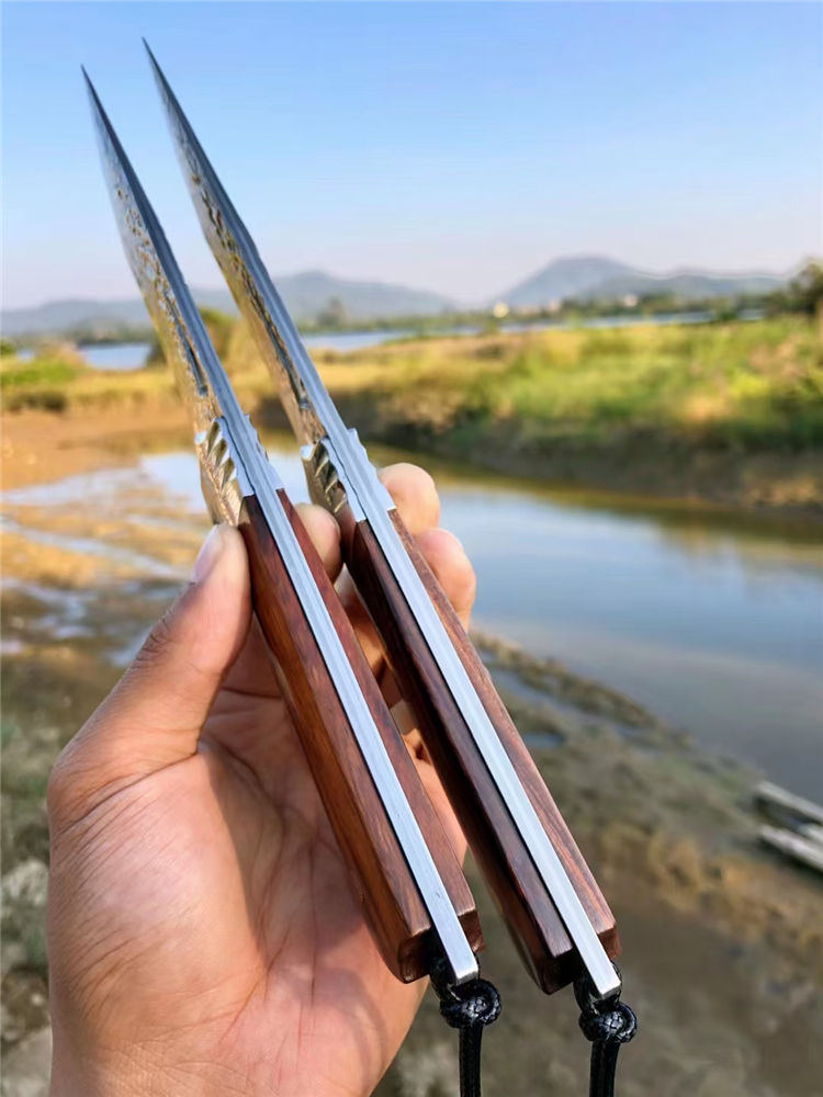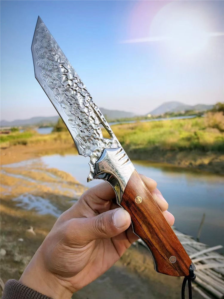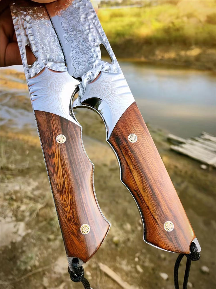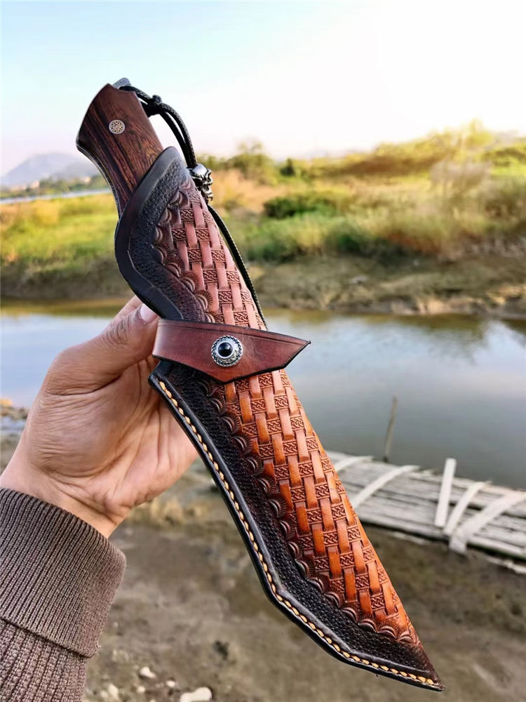 大马士革天翼直刀 总长:26.3cm 刃长:12.2cm 手柄:13.5cm 刃厚:4.8MM 刃宽:3.5cm 钢材:进口锻造一体大马士革钢 硬度:60-61HRC 热处理:真空热处理 柄材:美国砂铁木 皮套:意大利进口植鞣皮、手工棕色雕花皮套 包装:复古手工盒子