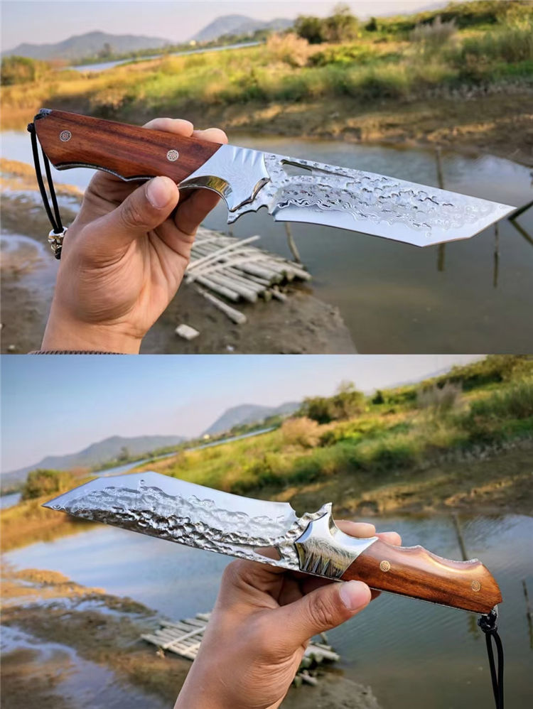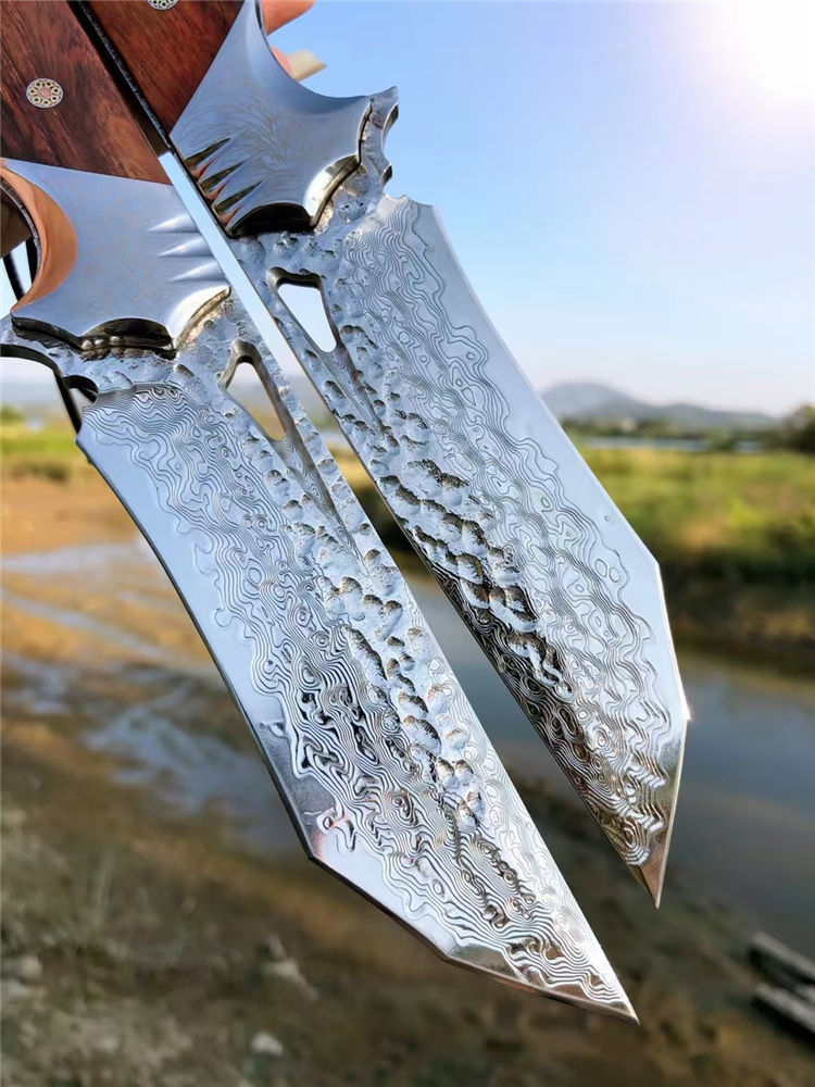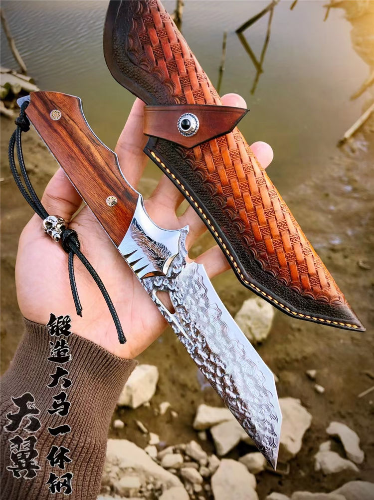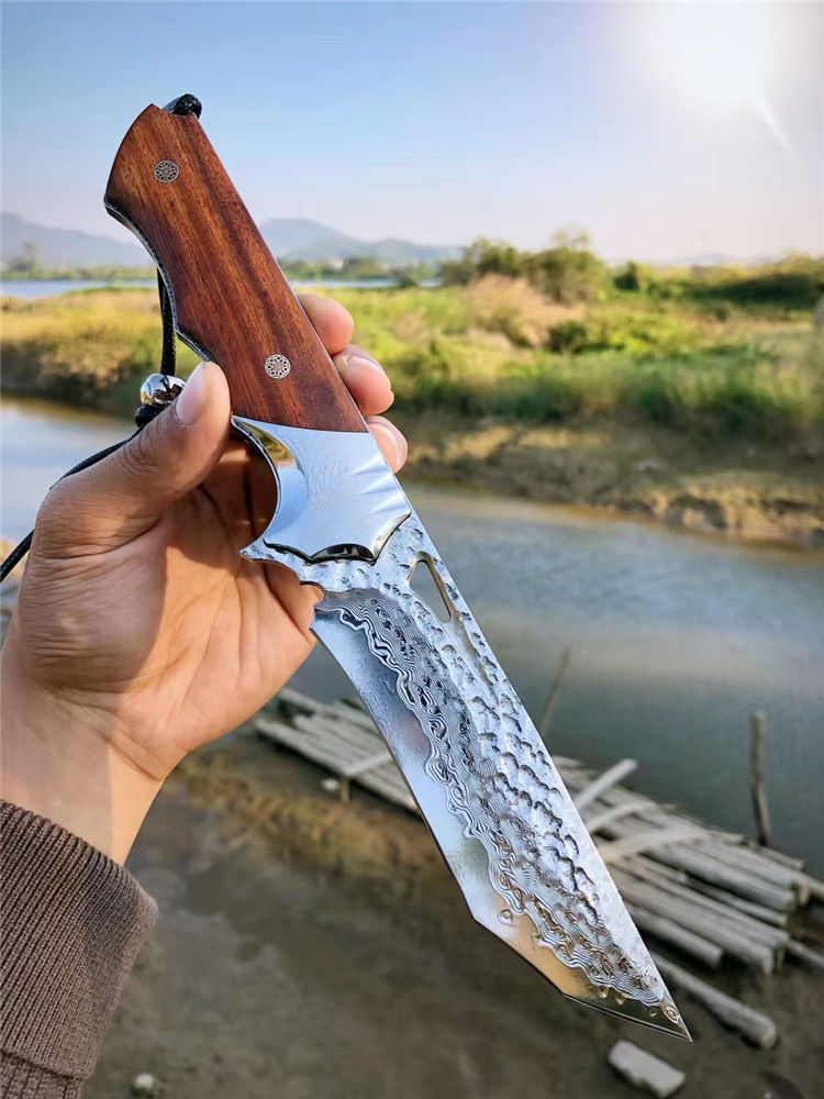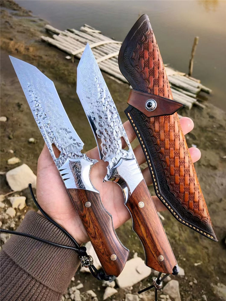 大马士革天翼直刀 总长:26.3cm 刃长:12.2cm 手柄:13.5cm 刃厚:4.8MM 刃宽:3.5cm 钢材:进口锻造一体大马士革钢 硬度:60-61HRC 热处理:真空热处理 柄材:美国砂铁木 皮套:意大利进口植鞣皮、手工棕色雕花皮套 包装:复古手工盒子
