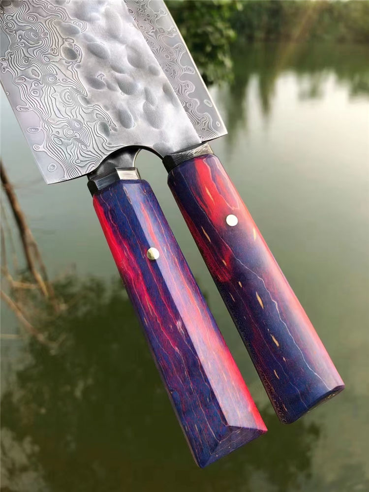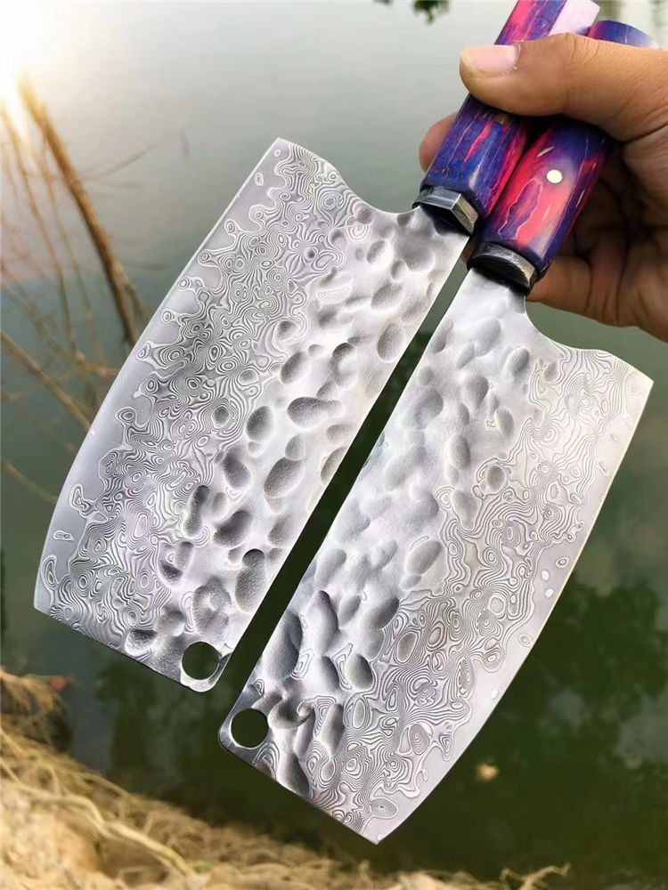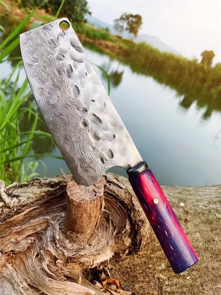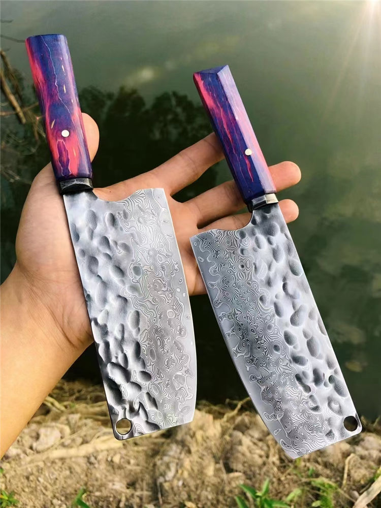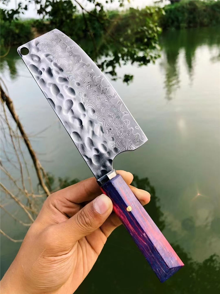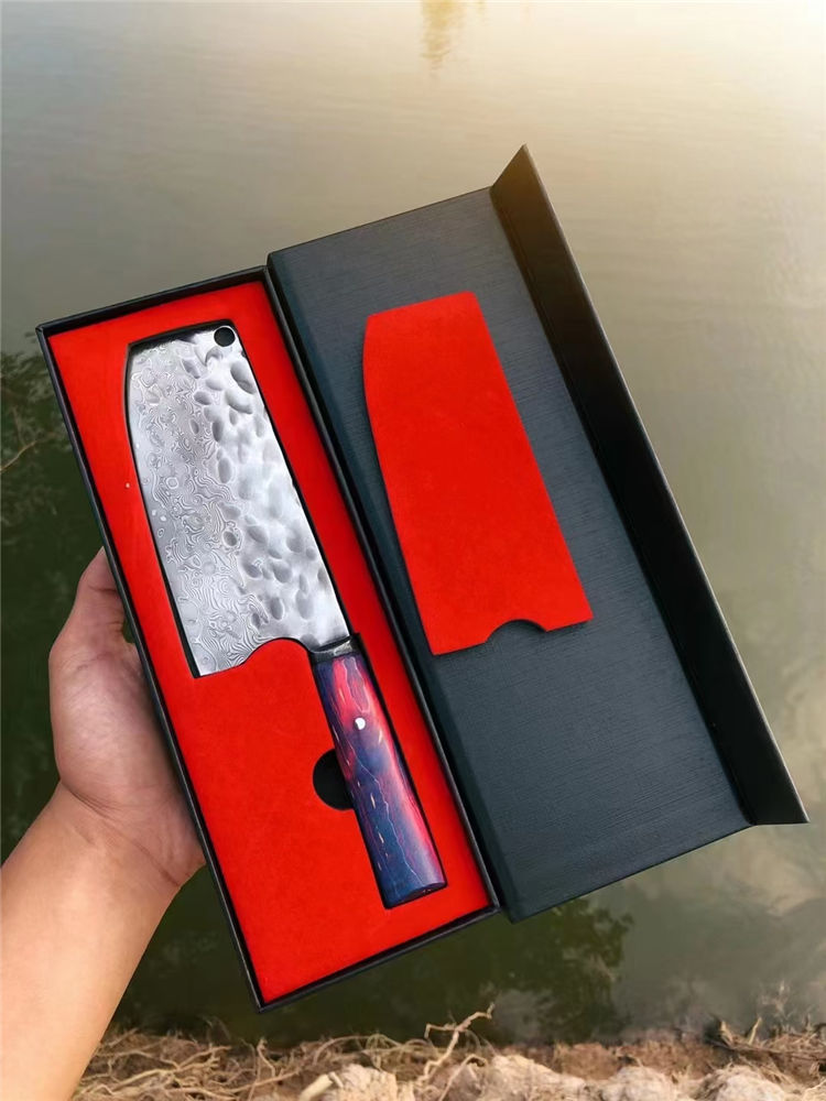 简师傅幻影小菜刀 总长:24.5cm 刀片:13.5cm 手柄:10.3cm 厚度:2.9MM 宽度:6cm 材质:进口锻造大马士革钢 硬度:60HRC 柄材:进口固化稳定木材 重量:170g(净重) 包装:礼品手工盒