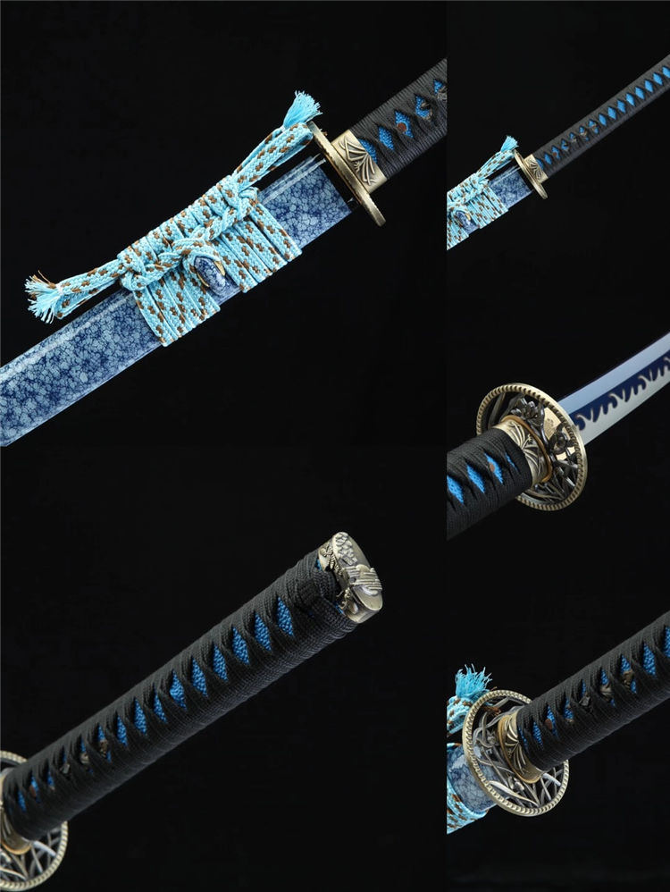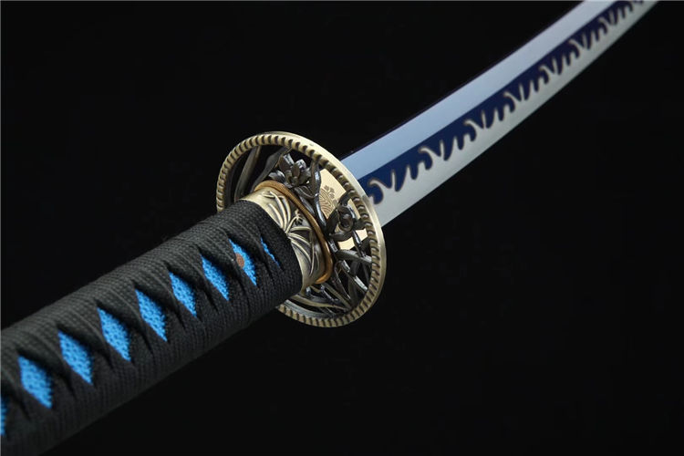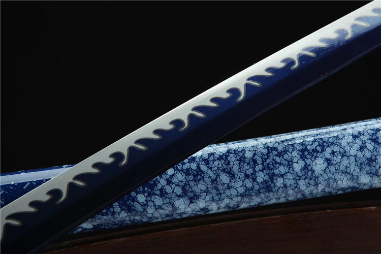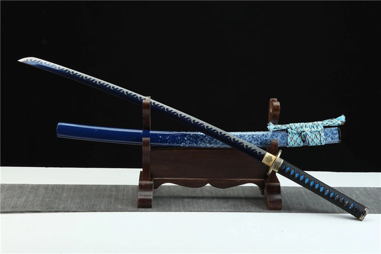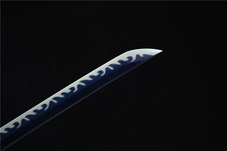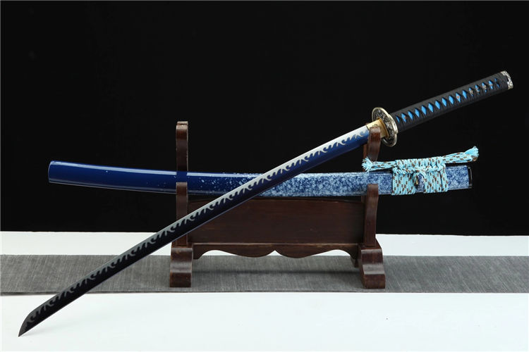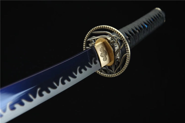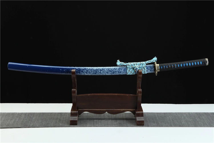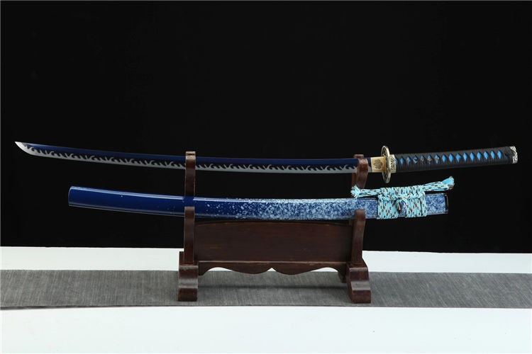 烤蓝菊武士刀 总长:103cm 刃长:71cm 柄长:27cm 刃宽:3.2cm 刃材:锋钢 工艺:高温烤蓝 手柄:仿鱼皮 装具:合金 刀鞘:高端实木油漆鞘 配置:锦盒、油、布