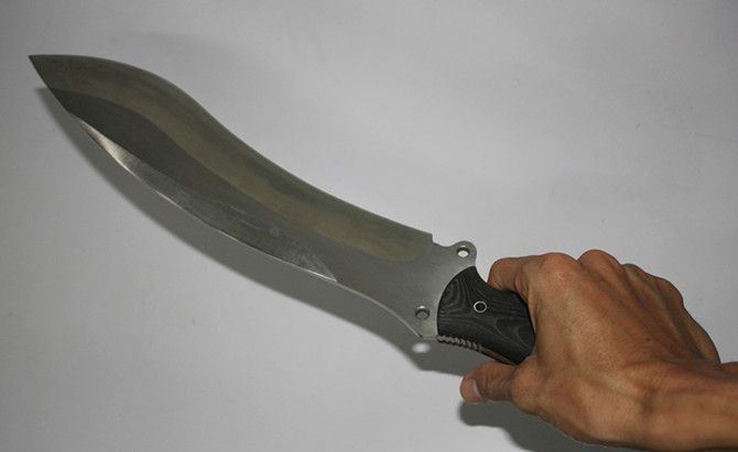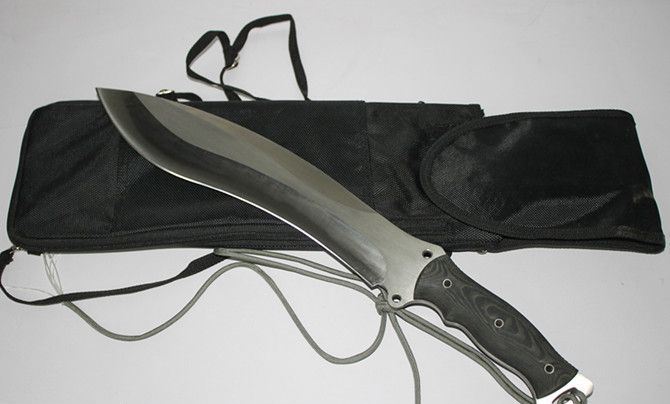 刀驴之友-新柳月 全 长:458mm 刃 长:320mm 刃 宽:60mm(最宽) 刃 厚:6.0mm 刃 材:440C 硬 度:59-60HRC{真空热处理) 表 面:钢本色(精细砂光,拉丝处理) 柄 材:黑白米卡塔,CNC 3D成型 刀 鞘:黑色尼龙背包式鞘(内衬硬胶鞘) 净 重: 1000克