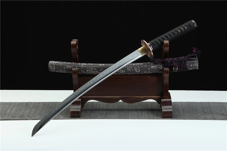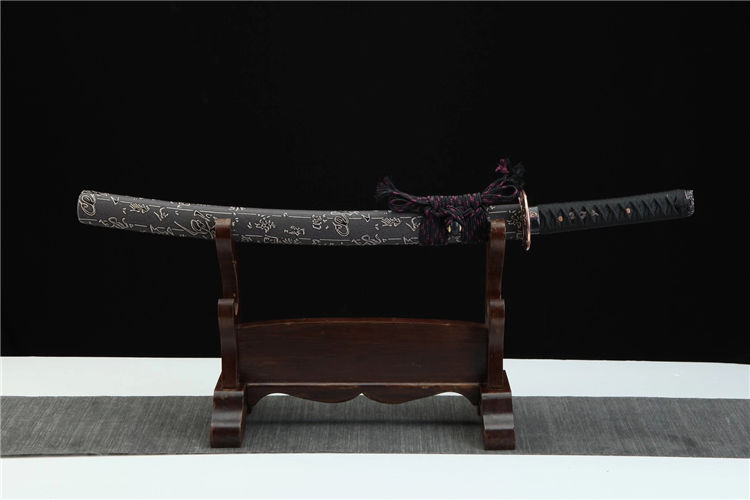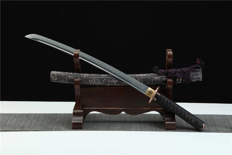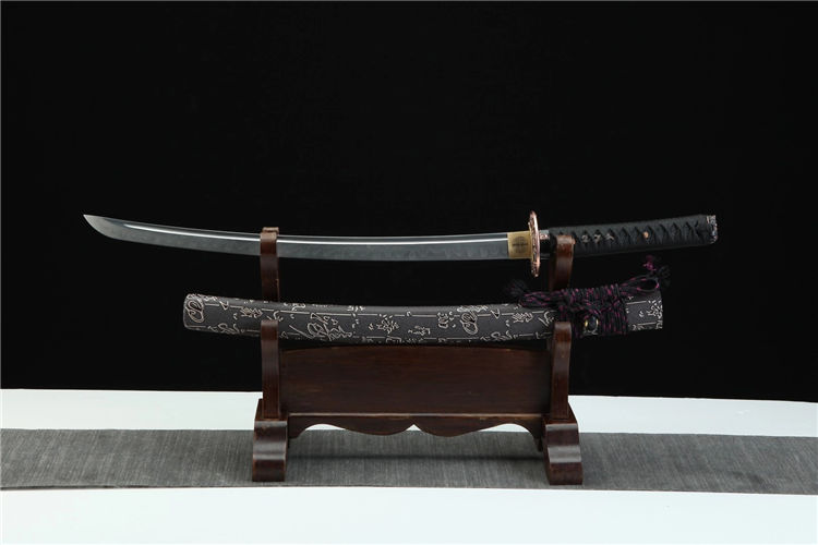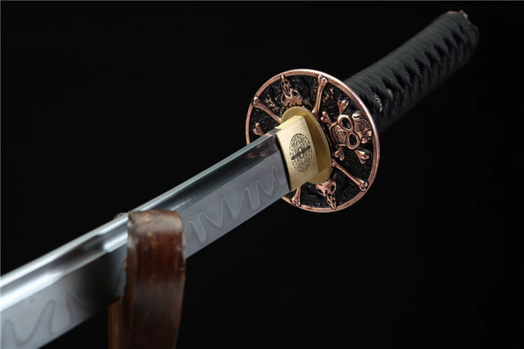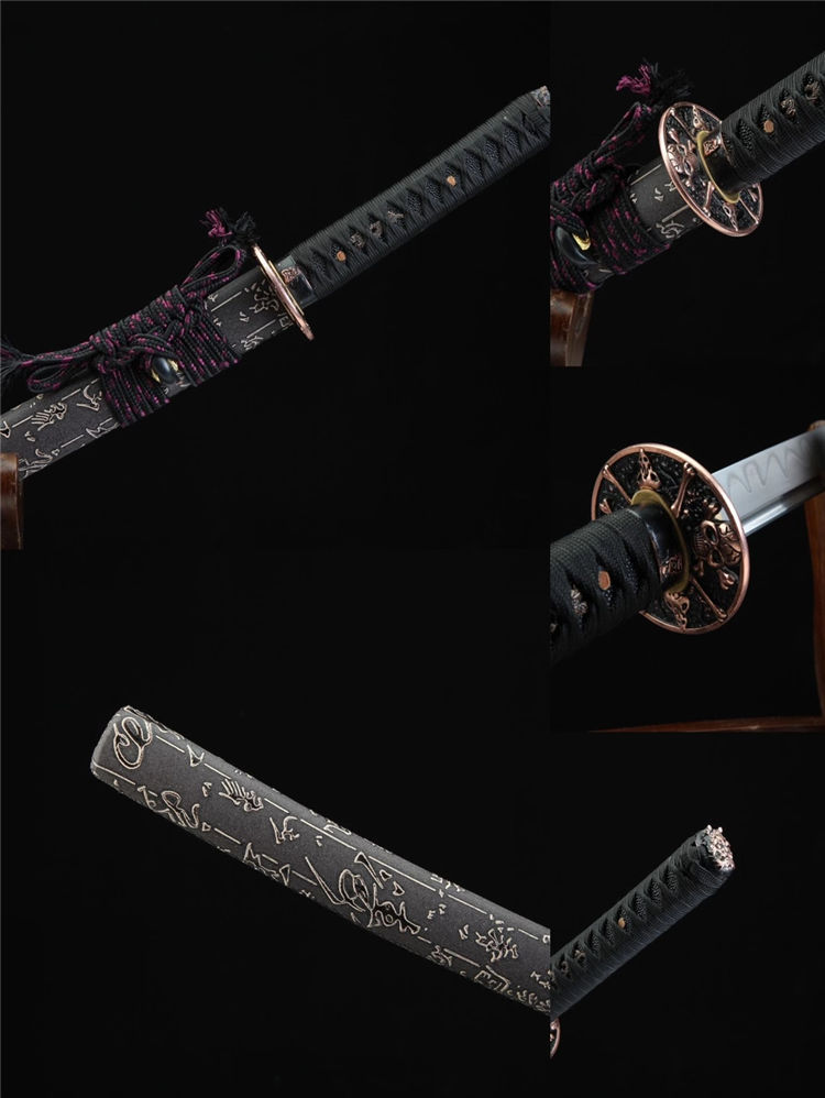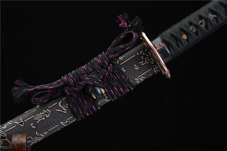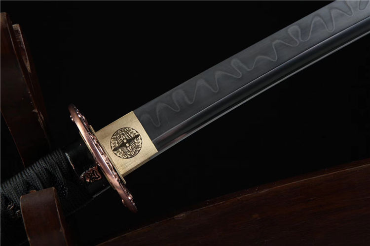 金鑫武士刀 总长:78cm 刃长:51cm 柄长:21cm 刃宽:3.2cm 刃材:T8 工艺:覆土烧刃,研磨灰 鞘材:皮套鞘 装具:合金仿紫铜 刀柄:仿鱼皮 配置:锦盒,刀油,刀布