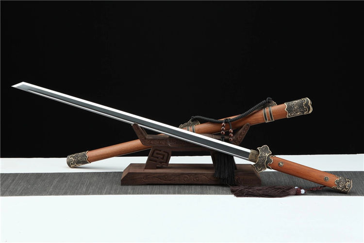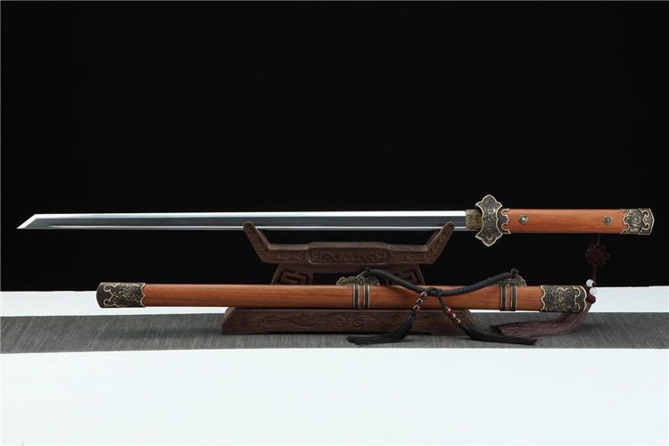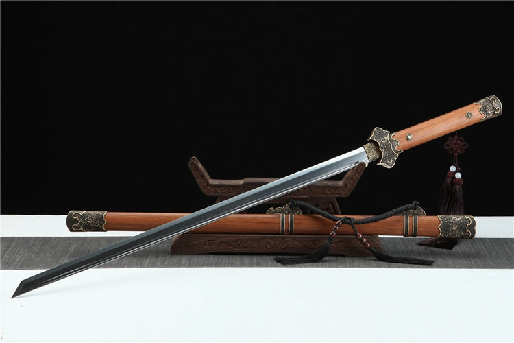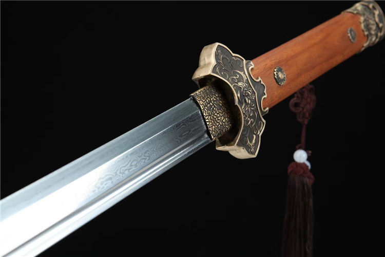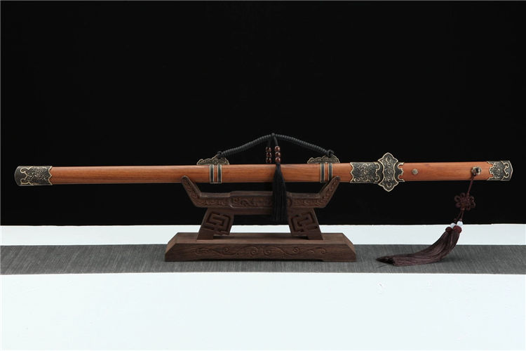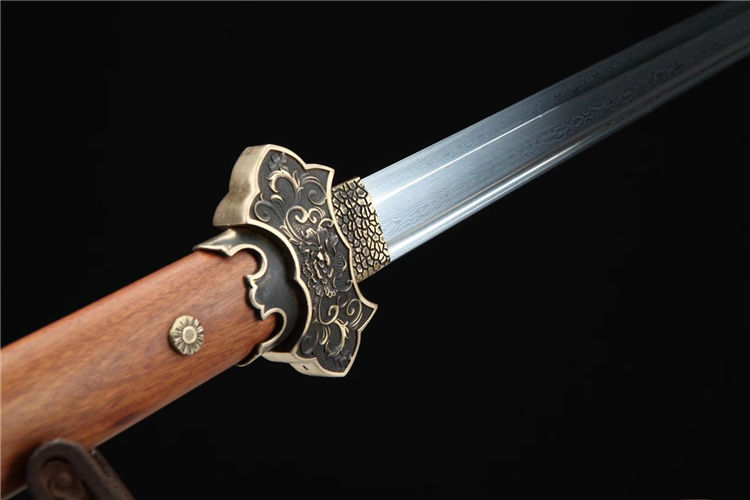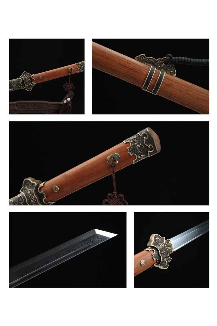 牡丹唐横刀 总长:103cm 刃长:71cm 柄长:27cm 刃宽:3.2cm 刃材:百炼钢 工艺:油淬/精磨 鞘材:酸枝木 装具:纯铜 配置:高端锦盒/油/布