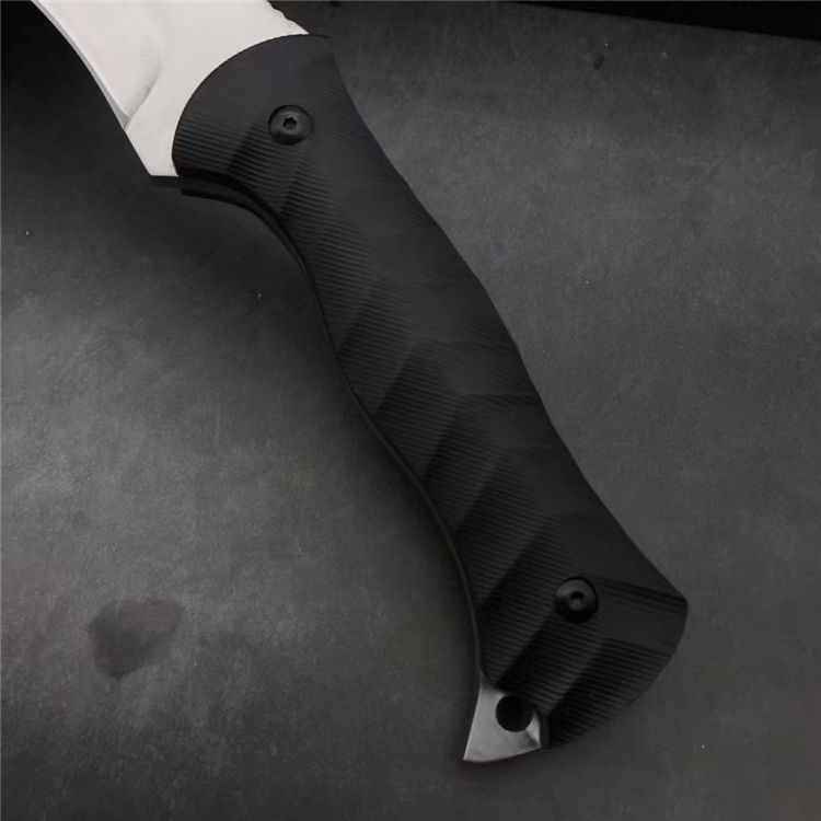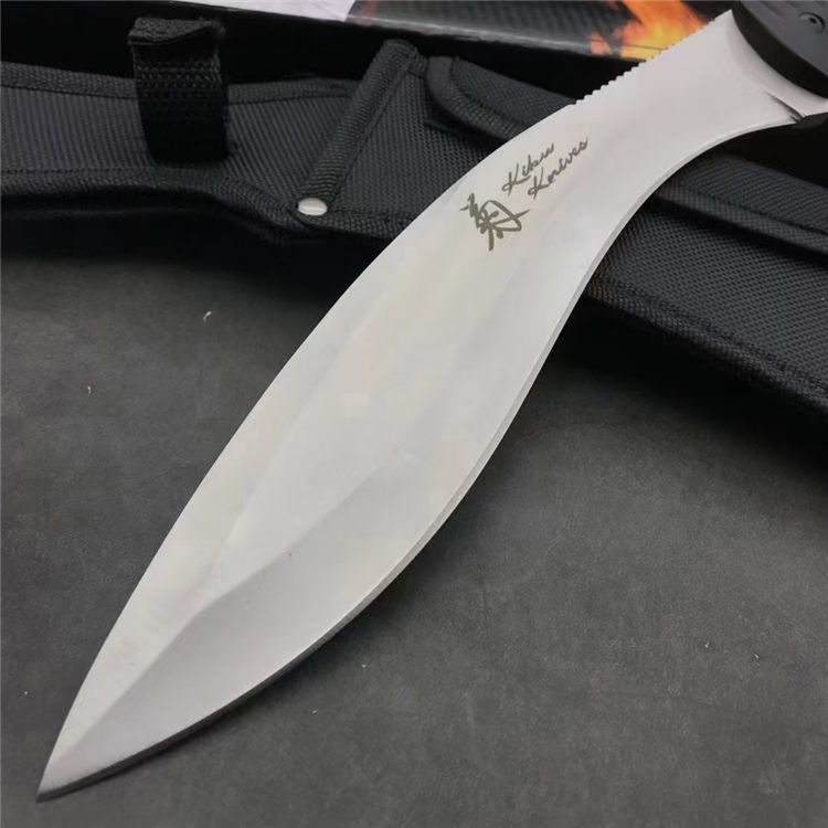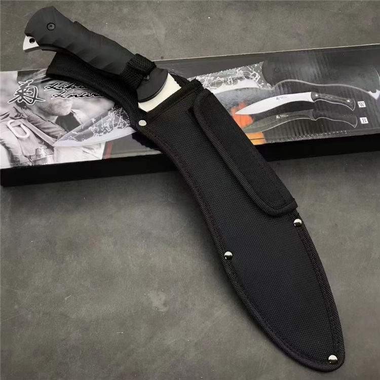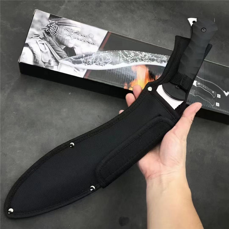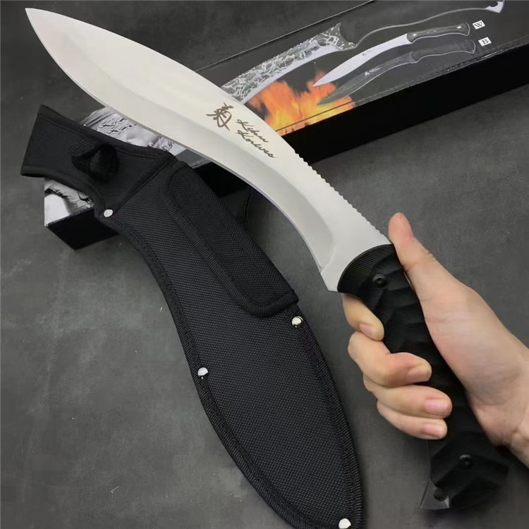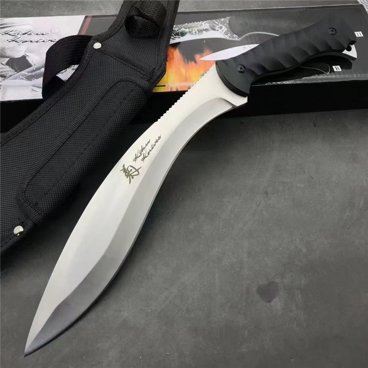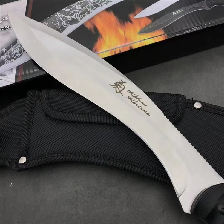 菊字狗腿弯刀 品牌:菊字 全长:39.5cm 刃长:25cm 柄长:14cm 刃厚:6.5mm 刃宽:4.5cm 刃材:7Cr17MOV 柄材: 黑G10 硬度:59HRC 净重:615克 毛重:778克(含包装物) 表面处:砂光 包装:配尼龙套+包装盒