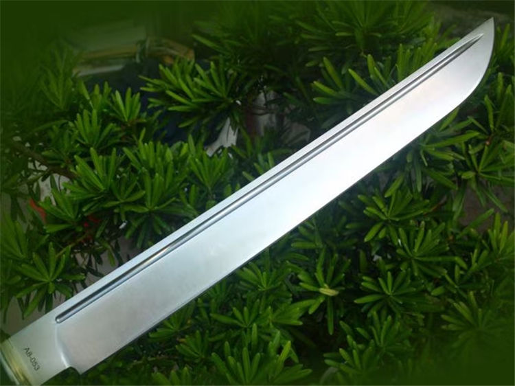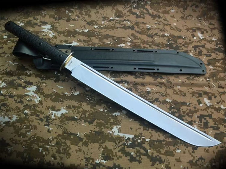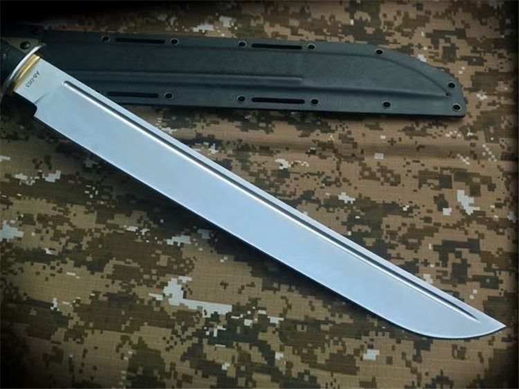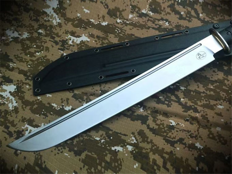野马征途II开山刀 全长:669mm 刃长:430mm 刃宽:46mm 刃厚:6.2mm 柄长:220mm 刃材:A8 柄材:G10包柄 一体龙骨 硬度:60-61HRC 热处理:真空油淬热处理 表面处理:数控V磨,精细砂光 刀鞘:2.0美产K鞘 刀重:860克