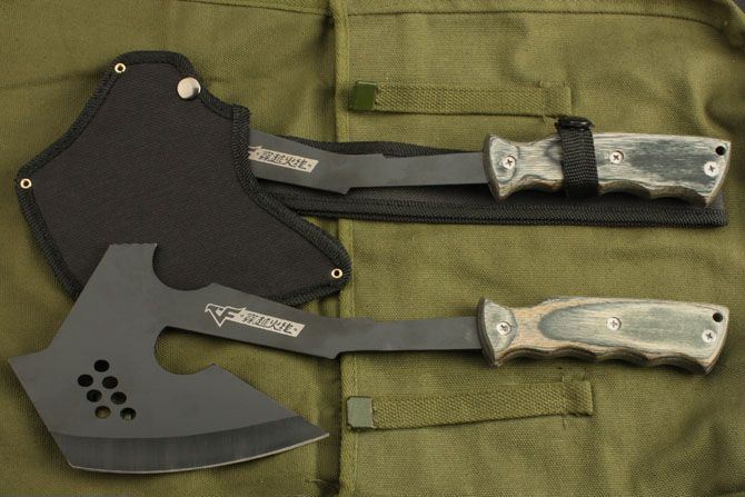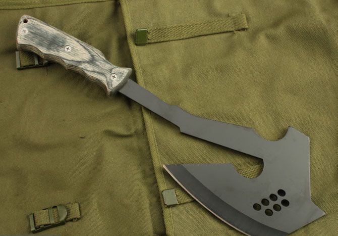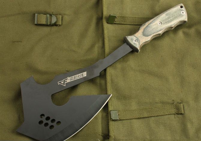 穿越火线斧头 全长:35cm 刃宽:12cm 刃厚:3cm 刃材:3CR13 硬度:53HRC 表面:氧化黑 柄材:彩木 柄长:12CM 净重:395克 毛重:440克 刀鞘:尼龙套