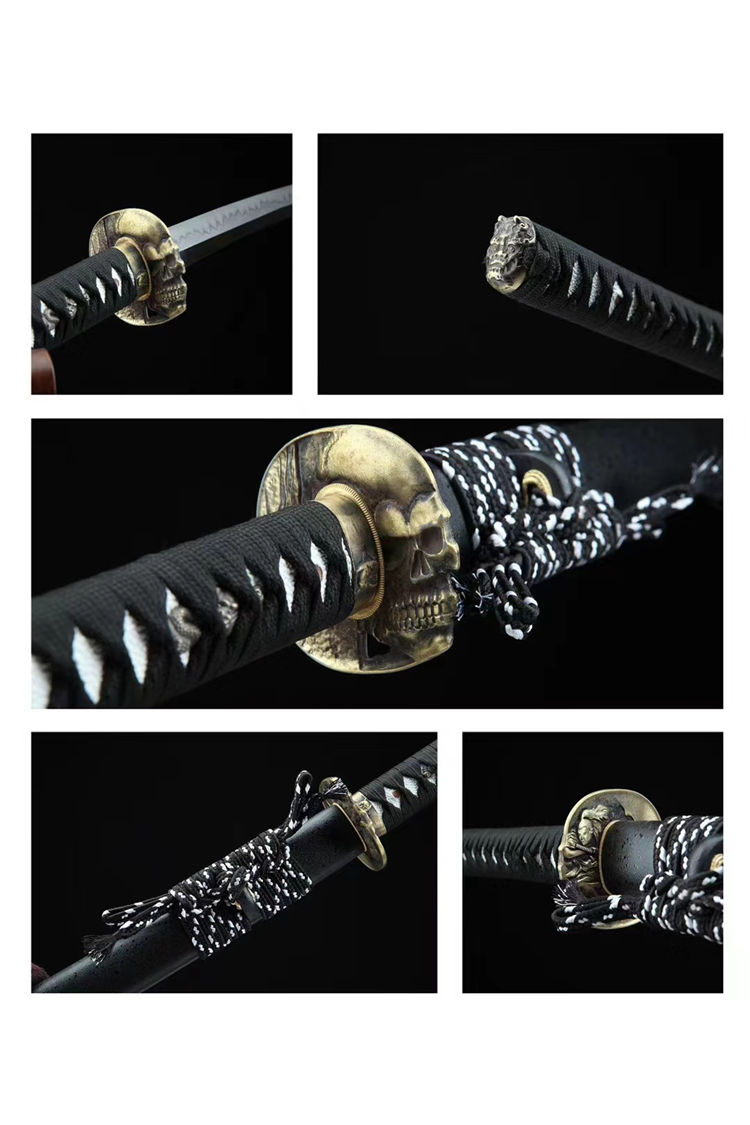 魔骷武士刀 总长:103cm 刃长:71cm 柄长:27cm 刃宽:3.2cm 刃材:特殊钢 工艺:覆土烧刃,手工研灰 鞘材:黑色点漆鞘 装具:合金 配置:锦盒,刀油,刀布