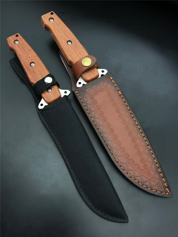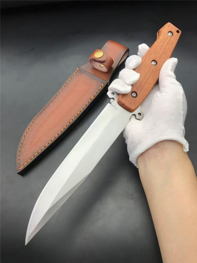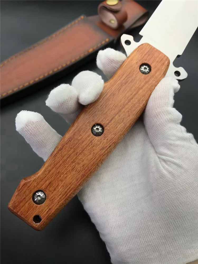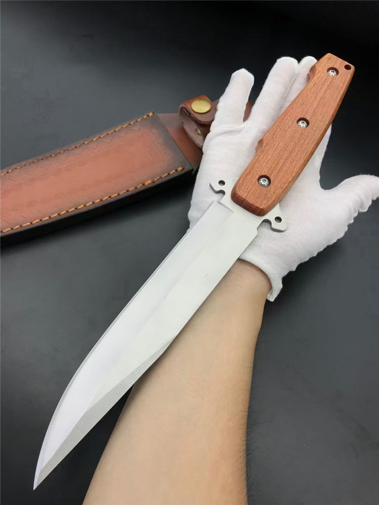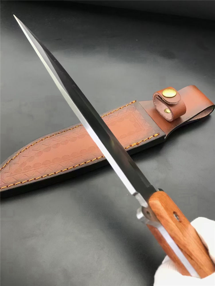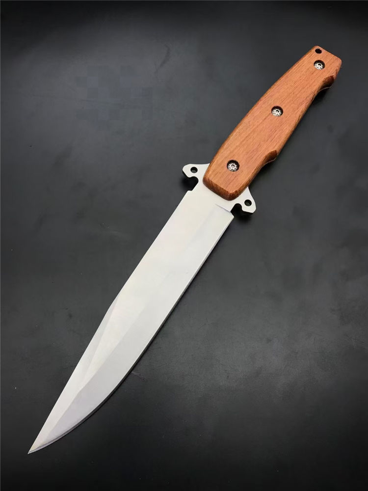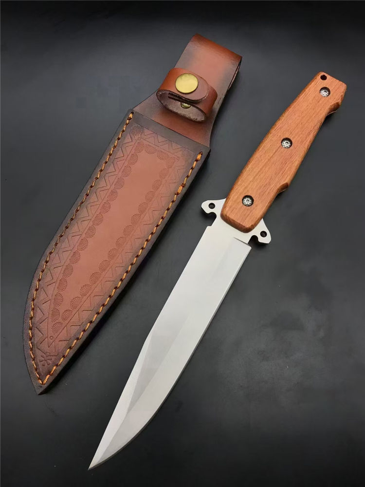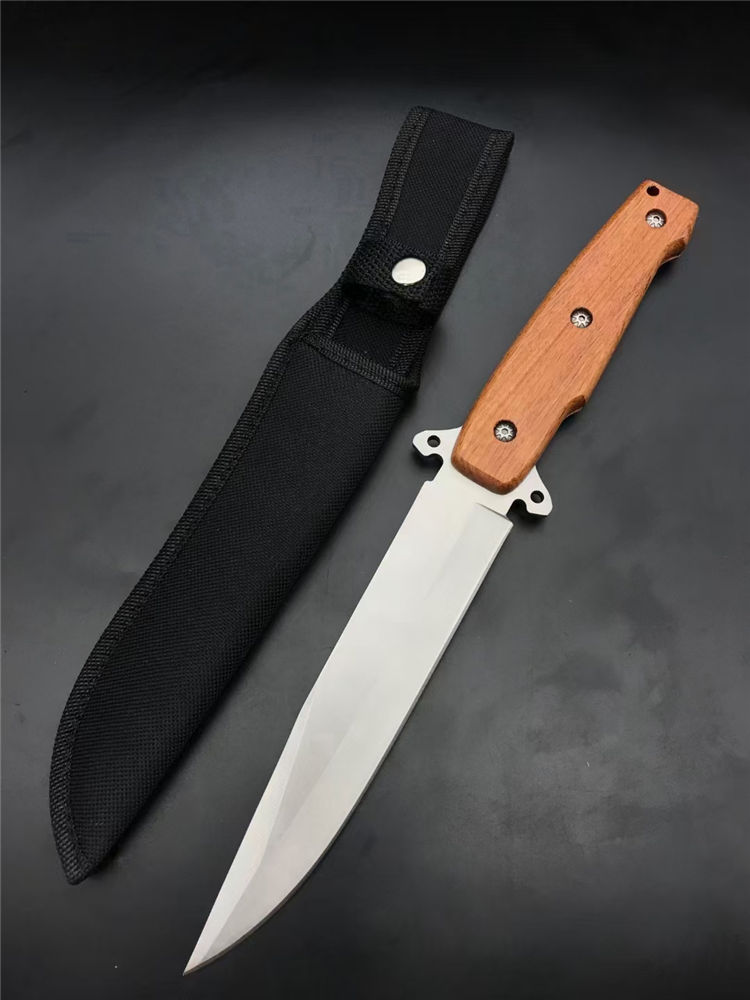 夺刺猎刀 全长:315MM 刃长:170MM 刃厚:4.0MM 手宽: 30MM 护手厚度:15MM 柄长:135MM 刃材:7Cr15MoV 硬度:57度(真空深冷热处理) 柄材:实木 刀套:尼龙刀套/皮套 刃材:刃面砂光处理,表面拉丝 重量:272g