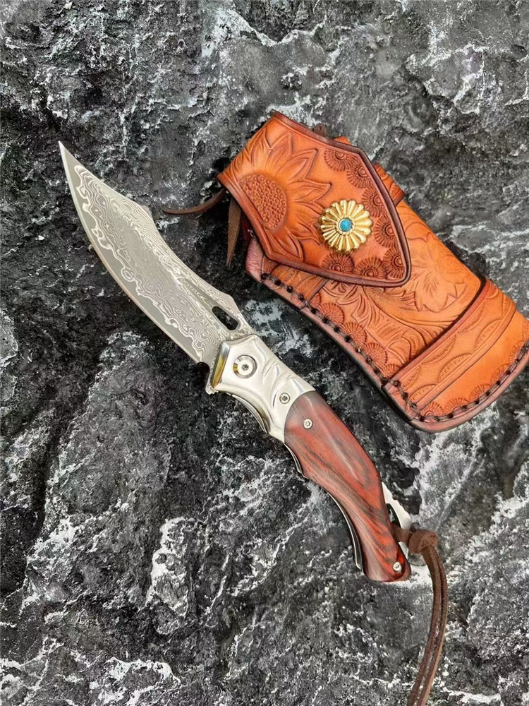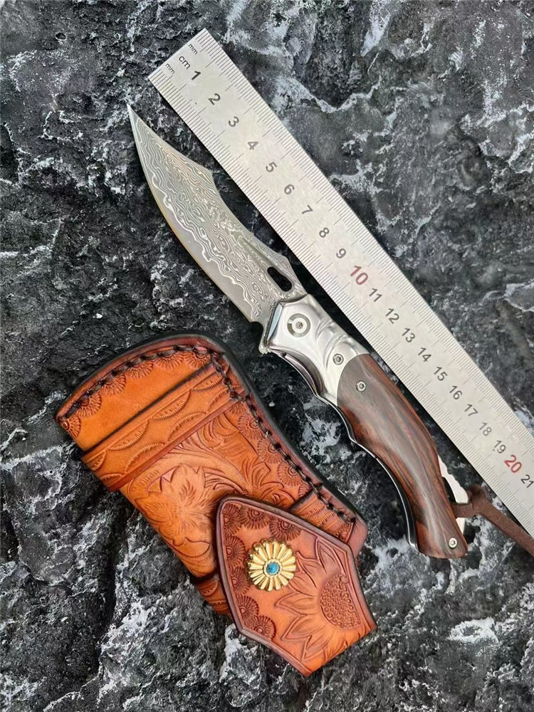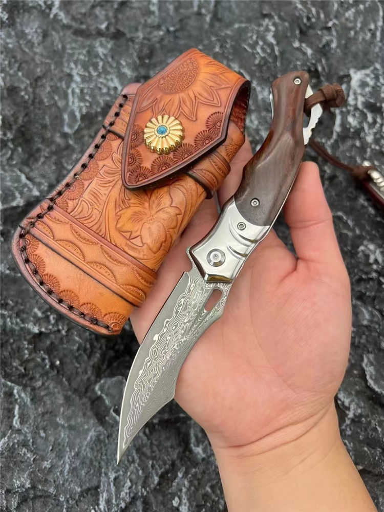 大马士革箭鲨轴承快开折刀 全长:19.8cm 刃长:8.3cm 柄长:11.3cm 刃宽:2.5cm 刃厚:2.9mm 刃材:VG10 108层大马 刀重:118g 总重:180g (含包装物) 硬度:58-60HRC 表面:刀刃真空处理 ,大马原有纹露 柄材:钢头+天然黄檀木 锁型:边锁 螺丝:有螺丝420不锈钢硬度HRC45,全CNC精雕加工 其他:整刀全是CNC做工,意大利头层皮套装
