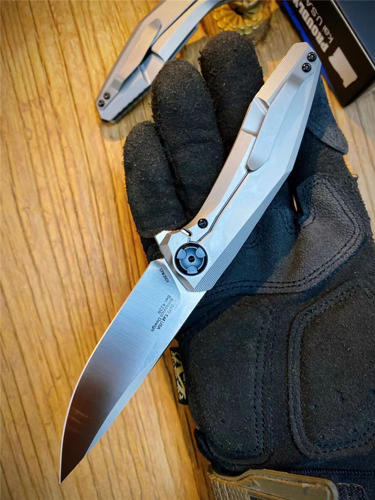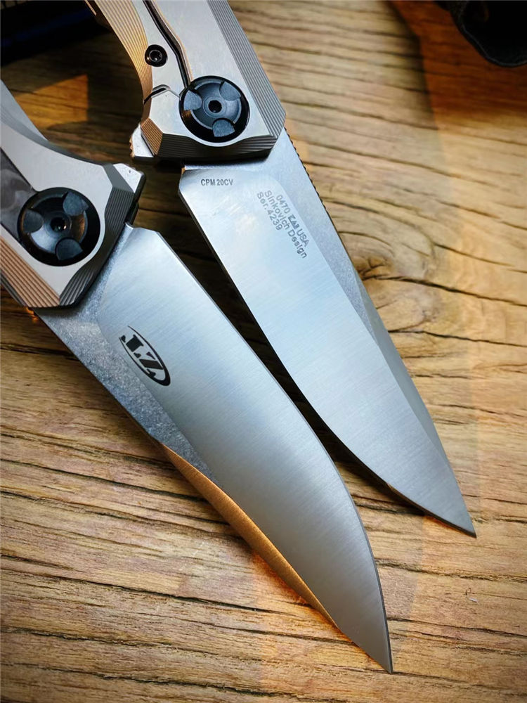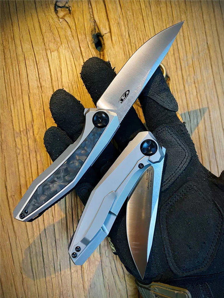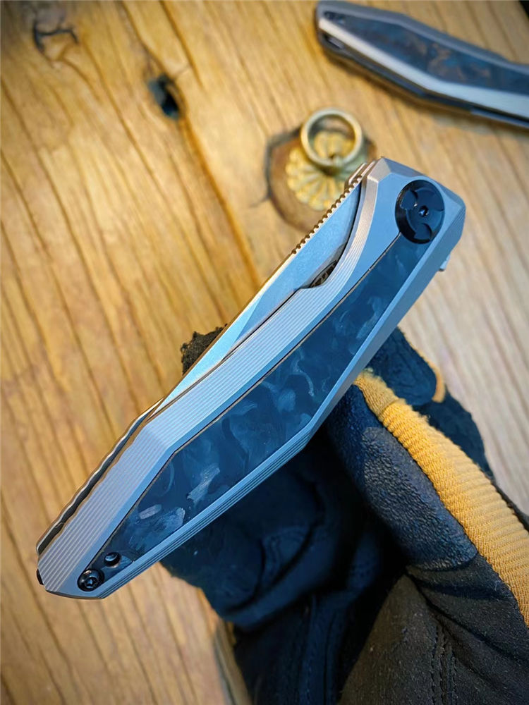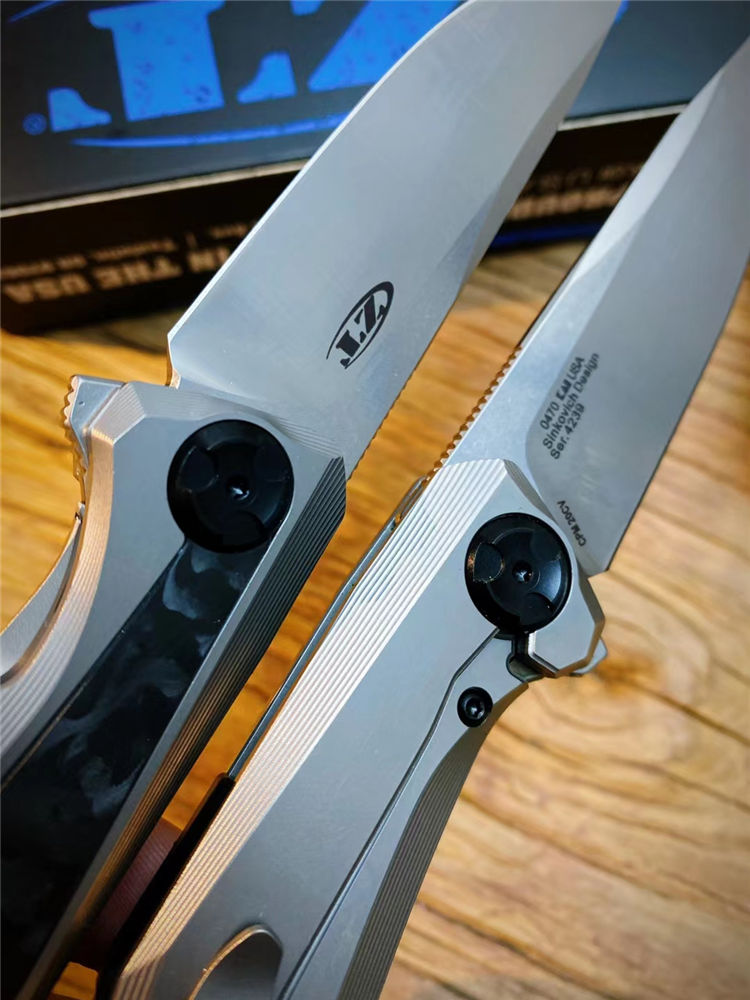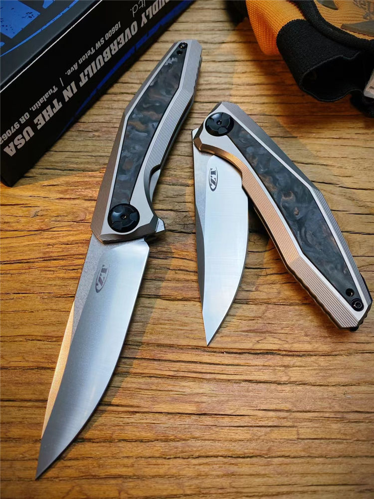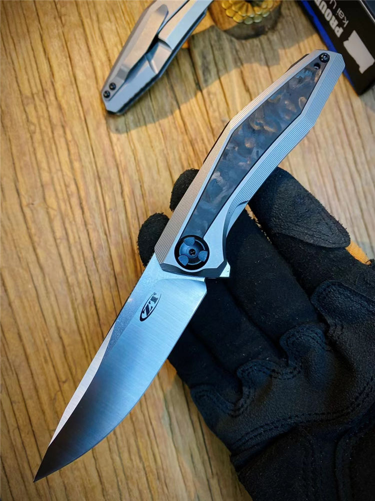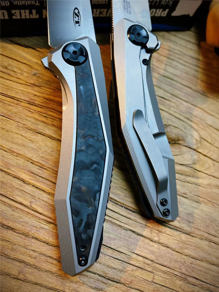 ZT零公差0470折刀 总长:19.5cm 刀刃:8.5cm 手柄:11cm 刃厚:3.1MM 刃宽:2.4cm 材质:CPM 20CV 柄材:TC4钛合金+碳纤 系统:滚珠轴承 包装:原厂包装盒