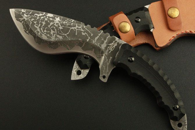 菊男—狗腿(原色.抛光) 全长:27.5cm 刃长:15cm 柄长:13cm 刃厚:5.8mm 刃宽:6cm 刃材:5Cr13 柄材:黑G10 硬度:57HRC 毛重:580克(含包装物) 表面处理:电脑加工