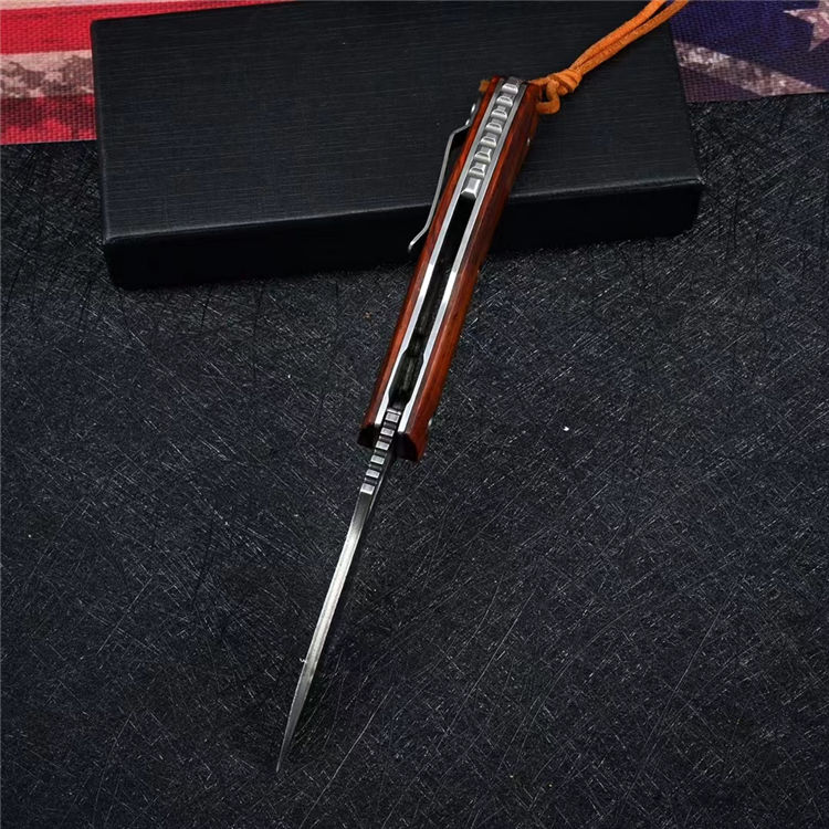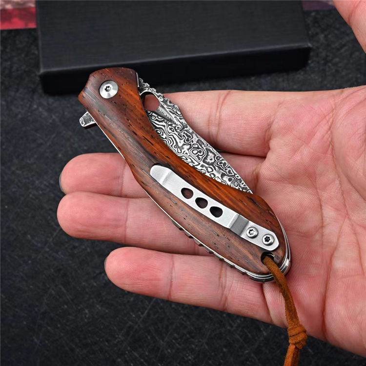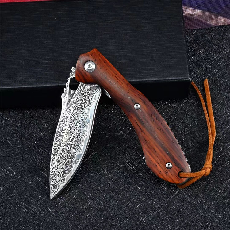大马士革比目鱼折刀 全长:177mm 刃长:75mm 柄长:101mm 钢材:VG10大马士革 柄材:微粒黄檀木 刀厚:2.8mm 刃宽:22.6mm 硬度:60-61HRC 净重:87.6g 毛重:133g 包装:黑色礼品盒