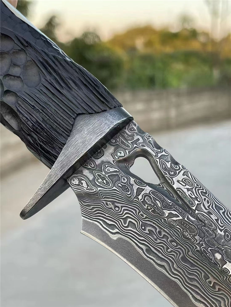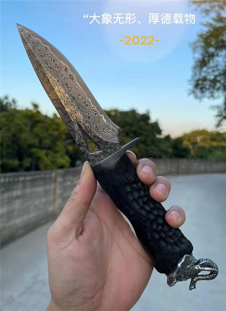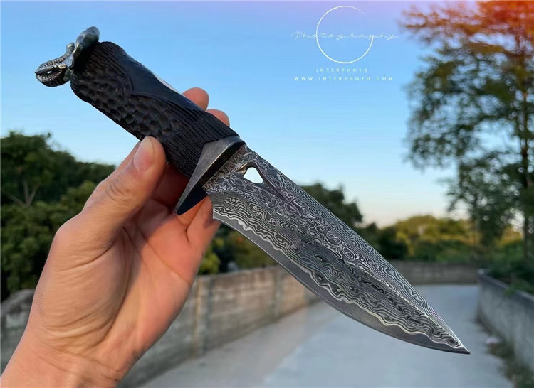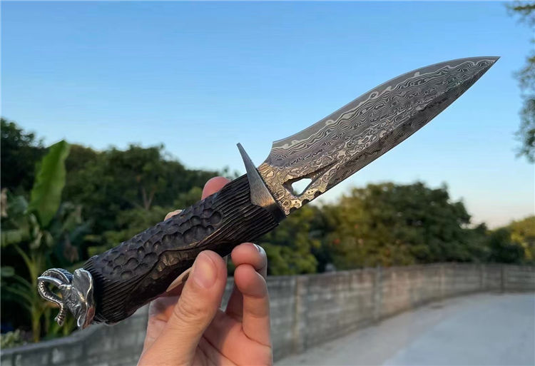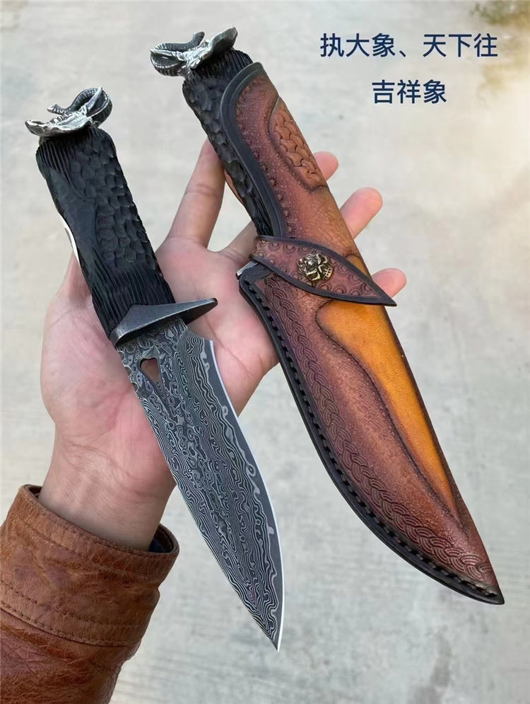 大马士革吉祥象直刀 总长:27CM 刃长:12CM 刃厚:4.5MM 刃宽:3.8CM 钢材:公司提供进口锻造大马士革钢VG10钢芯103层 工艺:复古怀旧工艺,表面保留锻造捶打凹凸纹理 热处理:专业真空热处理,淬火回火 硬度:60-62HRC,开刃方式,水冷多次开刃,设计以锋利度为主,保持性较好 重量:269G 手柄:黑檀木手工搓花刮花,大象不锈钢形体+复古旧效果 皮套:意大利手工大师手作,纯手工雕花缝线,复古棕色工艺 包装:复古手工盒子包装