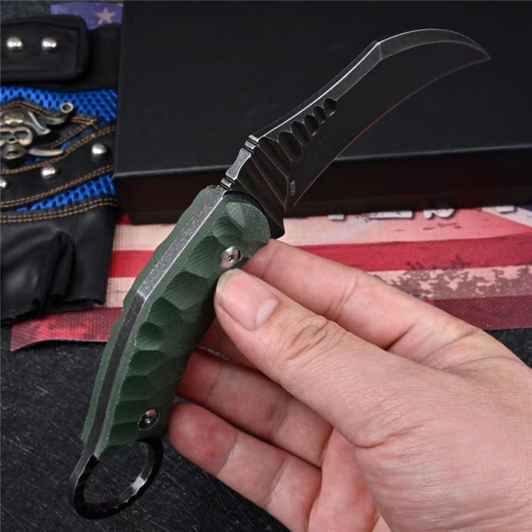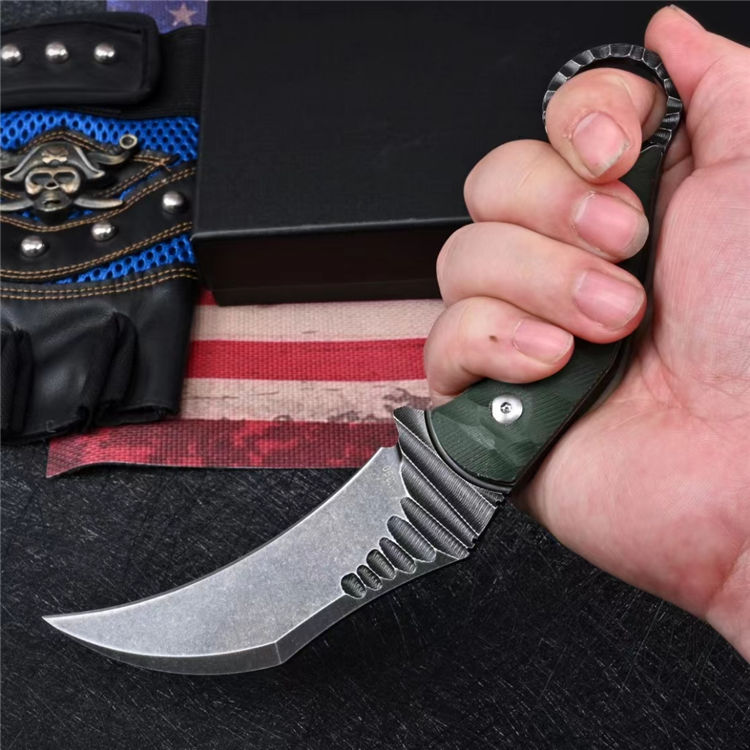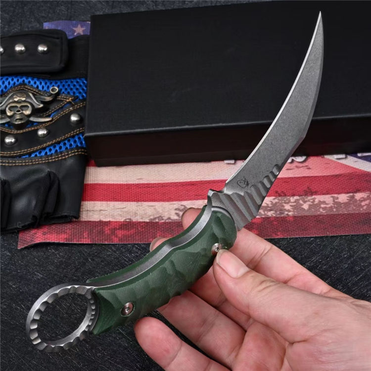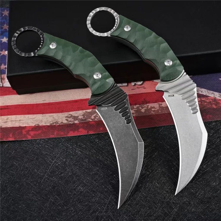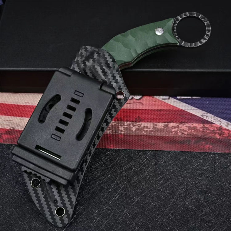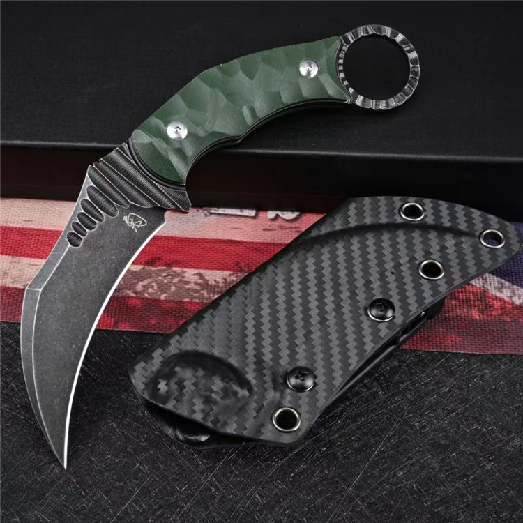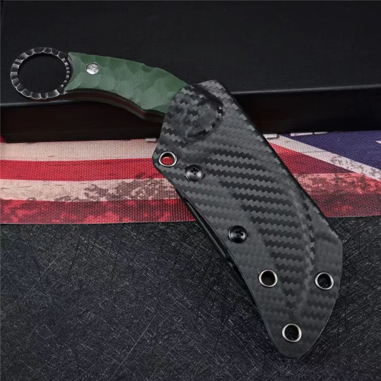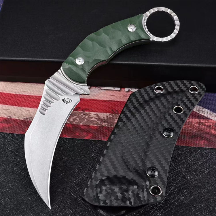 M390松田菊男君爪刀 总长:196mm 刃长:90mm 柄长:85mm 刃厚:4.5mm 刃宽:33mm 刀重:141g 毛重:331g(包含刀套和盒子) 钢材:m390(线切割开料) 柄材:高密度绿色纯锦布板(专供出口材料) 硬度:60-61 HRC 热处理:真空油淬深冷热处理 开刃方式:二次开刃 刀鞘:进口kydex鞘 表面磨刀:CNC数控磨 表面处理:石洗或沧桑石洗 包装:黑色盒子