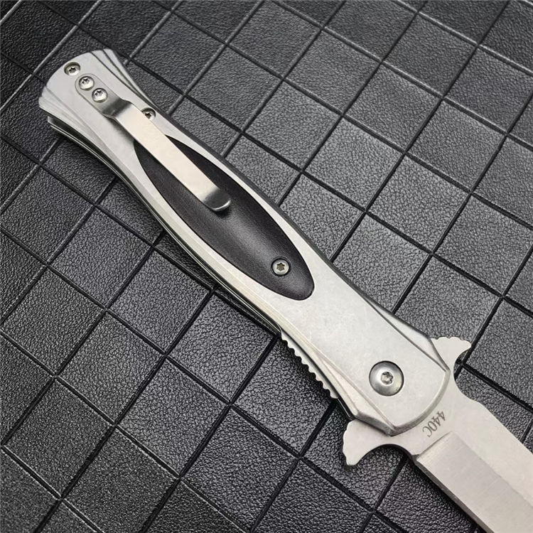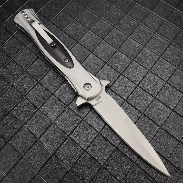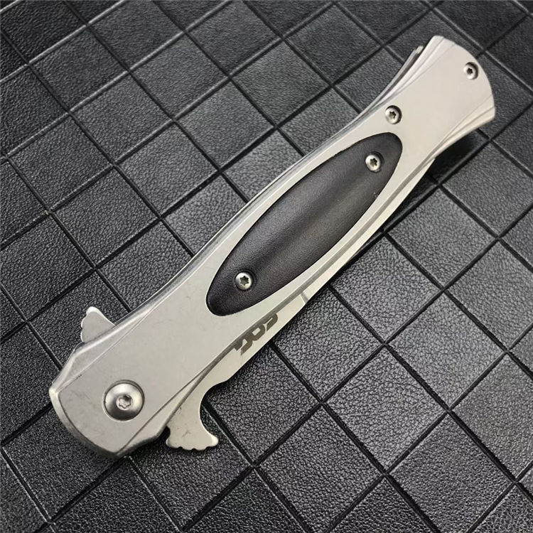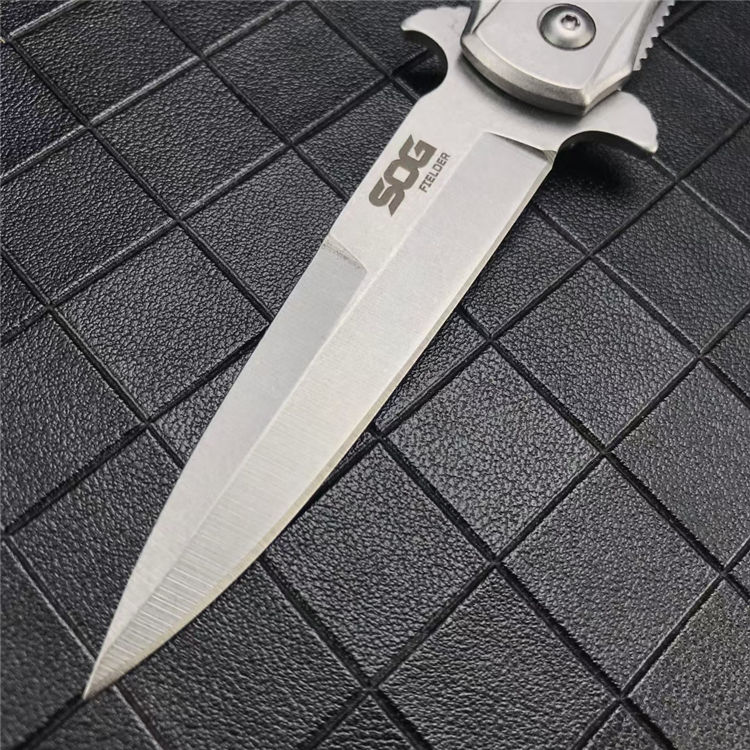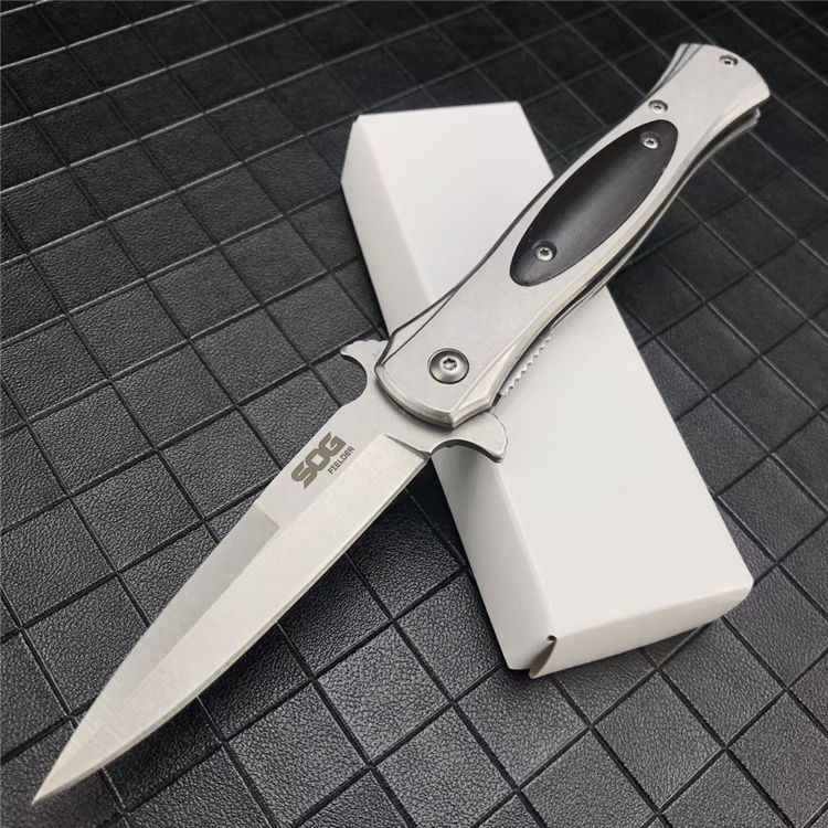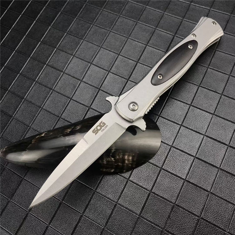 SOG快开折刀 全长:20.7CM 刃长:8.7CM 刃宽:1.8CM 刃厚:2.5MM 刃材:440C 柄长:12CM 手柄:420不锈钢镶嵌黑檀木 重量:140G