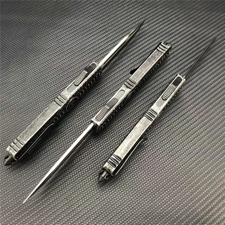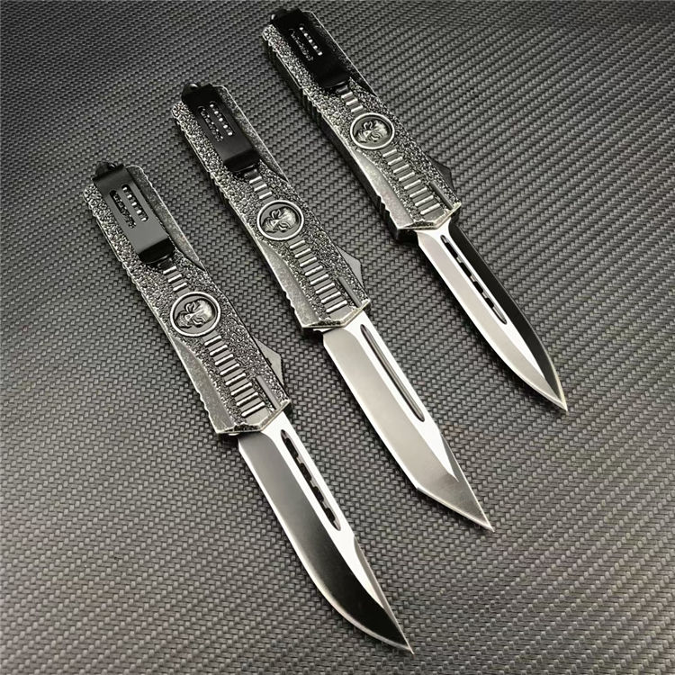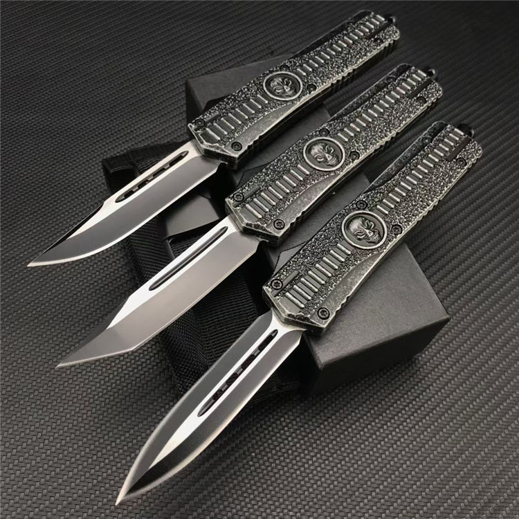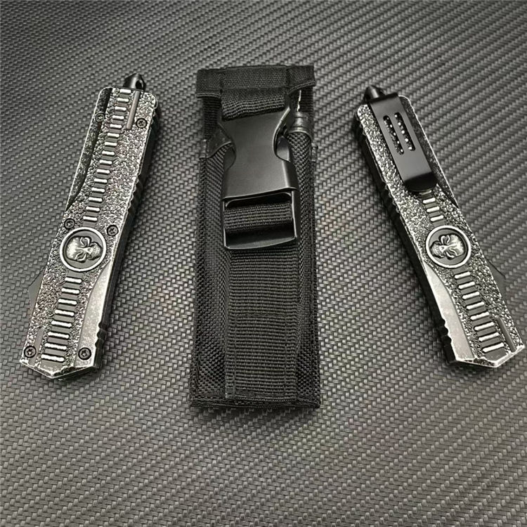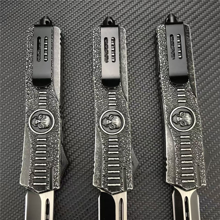 骷髅直出跳刀 全长:23.1CM 刃长:9.1CM 刃宽:2CM 刃厚:3MM 刃材:440C 柄长:14CM 柄材:锌合金 净重:220G