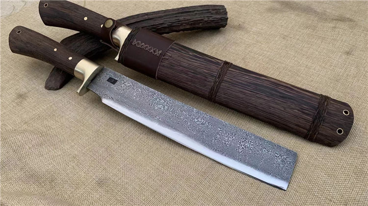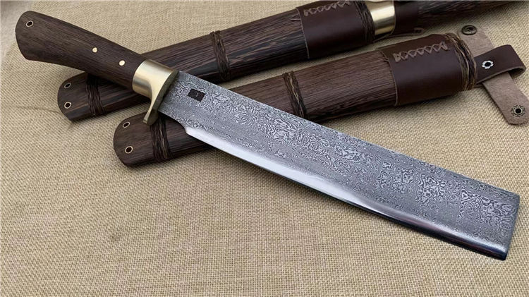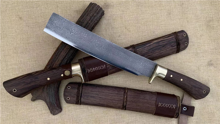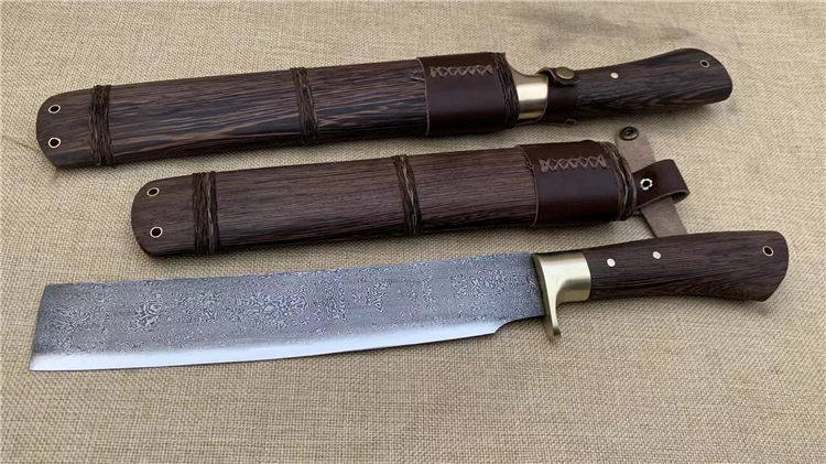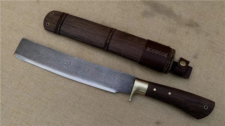 正品户撒刀柴刀 全长:43cm 刃长:23cm 刀宽:4.5cm 重量:600克 刃材:纯手工锻打百炼钢 刀柄:鸡翅木加纯铜护手防滑保护 刀壳:进口鸡翅木,手工综丝牛皮扣,刀体美观大方 是一把不错的家用小砍刀户外开山垂钓,防身,不错之选 手工缝制牛皮扣背带设计,非常结实耐用携带方便