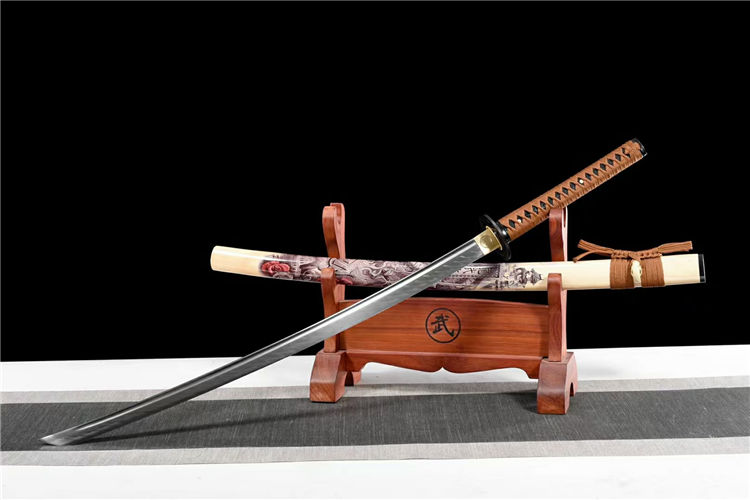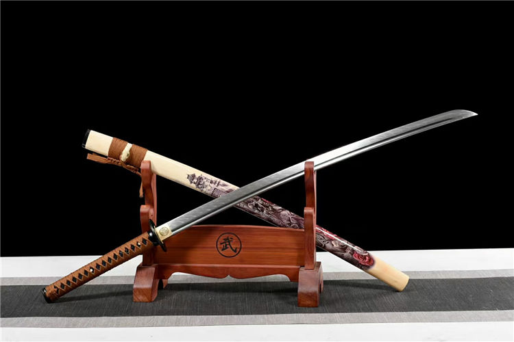 狂龙武士刀 全长:103cm 刃长:71cm 柄长:26cm 刃宽:3.2cm 刀鞘:实木漆鞘彩绘龍武士、搭配精美粗下绪 赠:高端锦盒 钉字纹武士刀《狂龙武士》:性能:手工18道研磨纯锋利,镜面研磨工艺