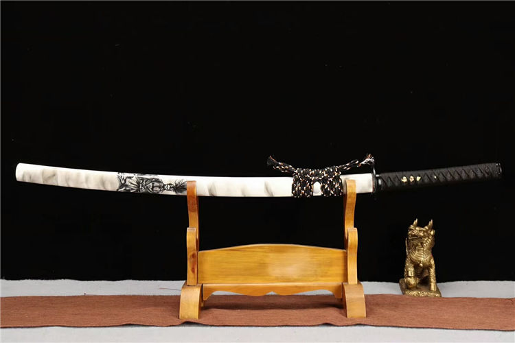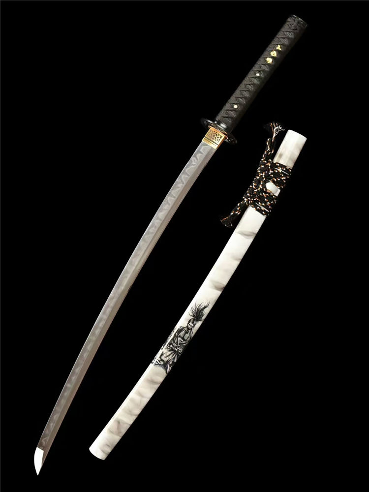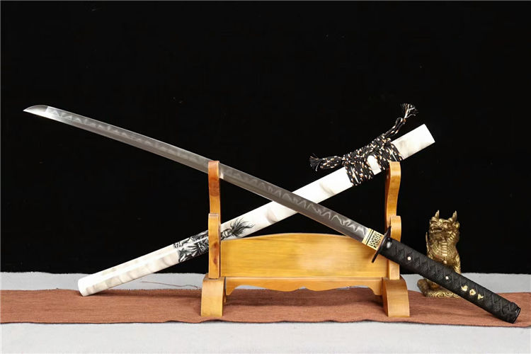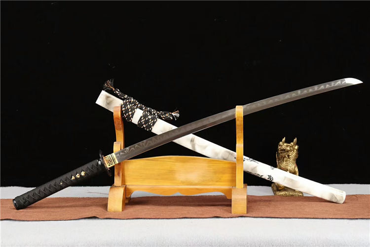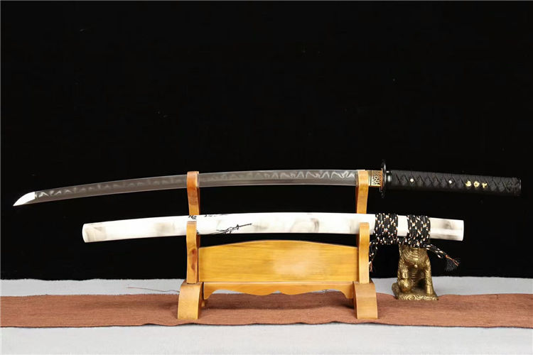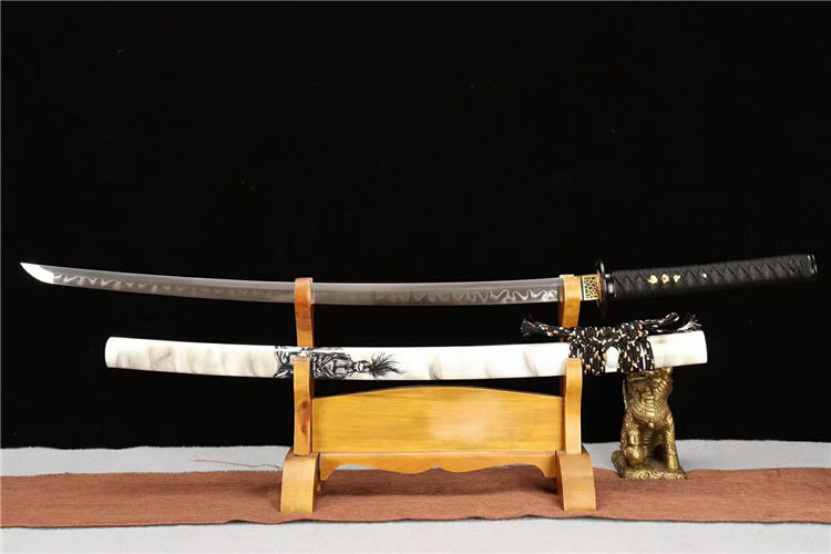 宫本武士刀 总长:103cm 柄长:26cm 刃长:74cm 刃纹:乱涛纹 硬度:60.HRC 鞘材:实木油漆鞘 装具:合金装 总重:1.4Kg 净重:1.1Kg 工艺:刃身手工锻造,经过打坯、热煅、铲、锉、研磨、粹火,回火、手工研磨等龙泉刀剑古法制造工序制作而成 用途:收藏 把玩 赠礼
