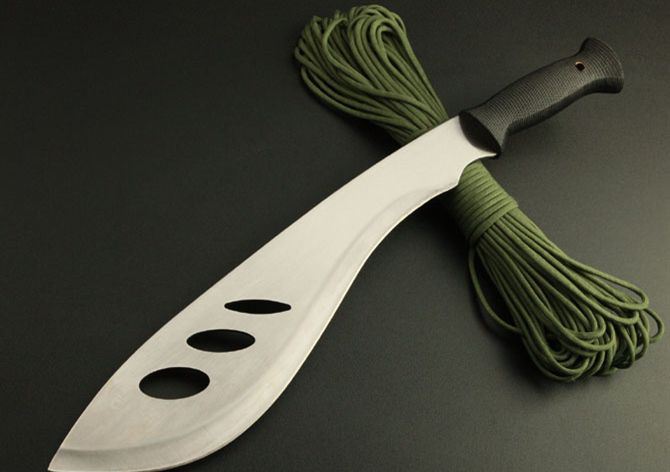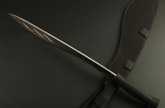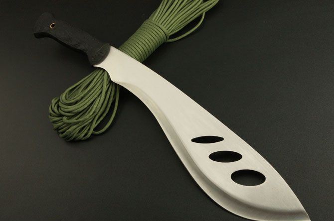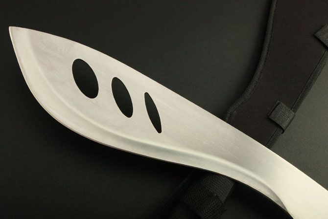 全长: 49CM 刃长: 36CM 刃宽: 8CM (最宽处) 刃厚: 0.31CM 硬度: 55HRC 重量: 600克(含套) 材质: 420不锈钢 涂层: 砂光 柄材: ABS 刀鞘: 尼龙套