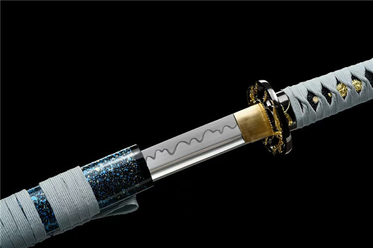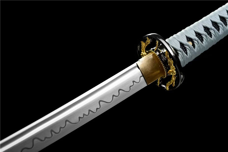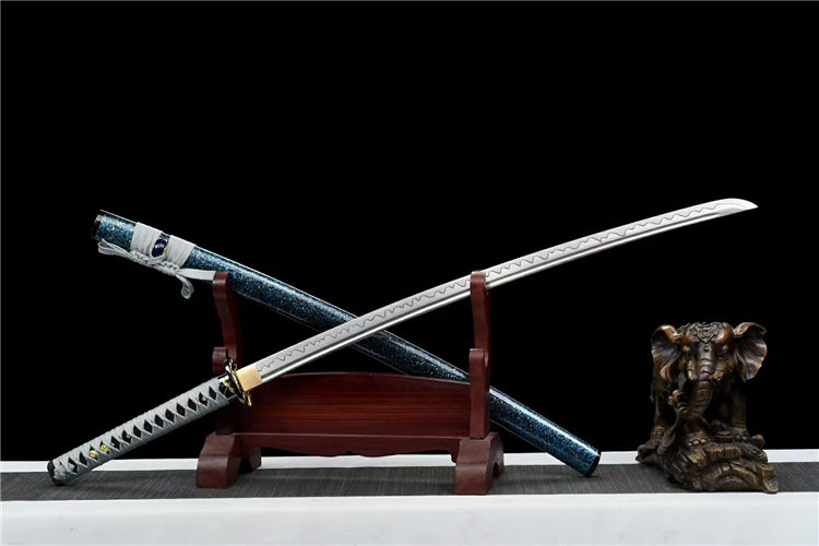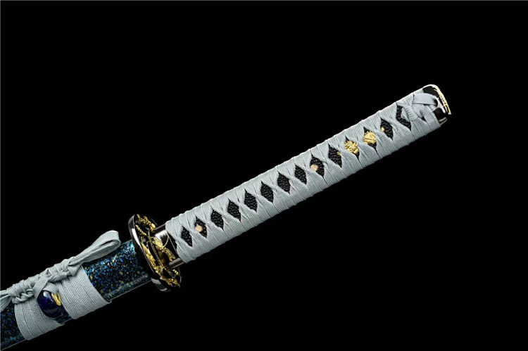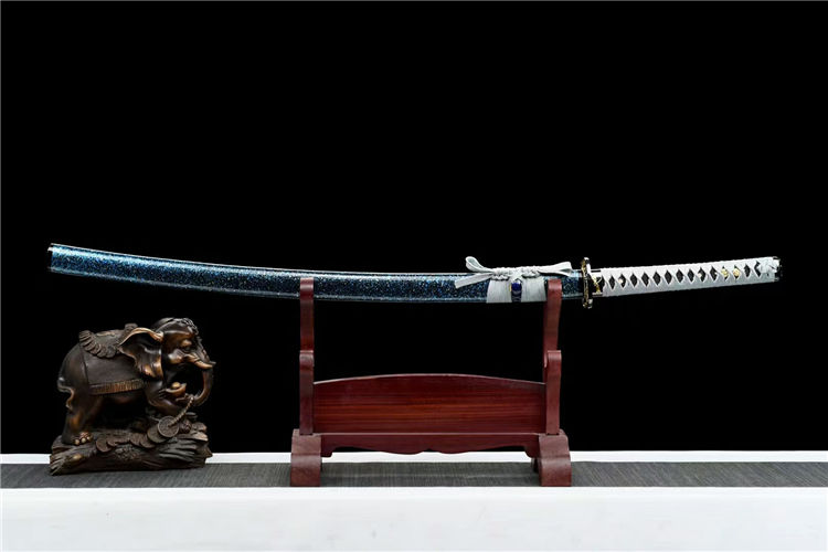 凝冰武士刀 全长:103cm 刃长:72cm 柄长:26cm 刃宽:3.2cm 刃厚:0.7cm 重量:1.1KG 刃材:高碳钢手工锻打 装具:合金刀镡 鞘材:实木油漆 柄材:实木绕绳 下续:金皮下续 适合:收藏 防身 情侣配送 乔迁送礼 武术健身 精美摆设 赠品:高端锦盒、护理油 性能:锋利、劈竹、削A4 无压力、一体老虎尾锻造 工艺:刀身千锤百炼、经打胚、热锻、铲、锉、磨、热处理(淬火)回火、初修、精修、等龙泉古法数十道手工制作而成