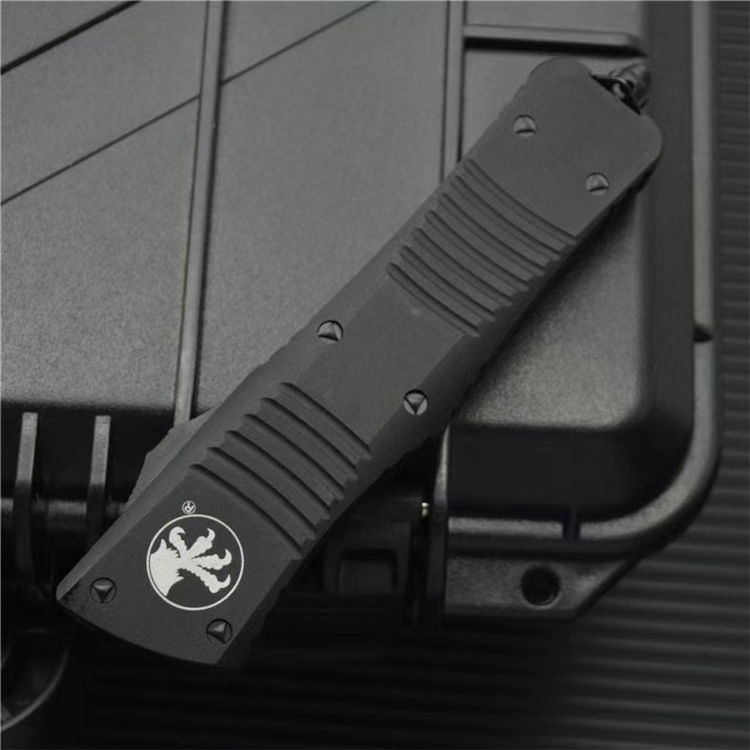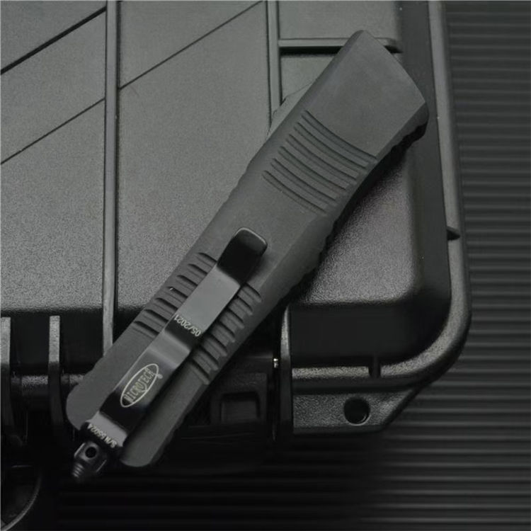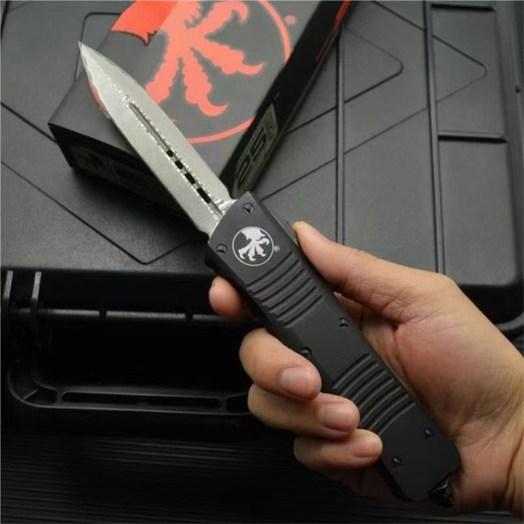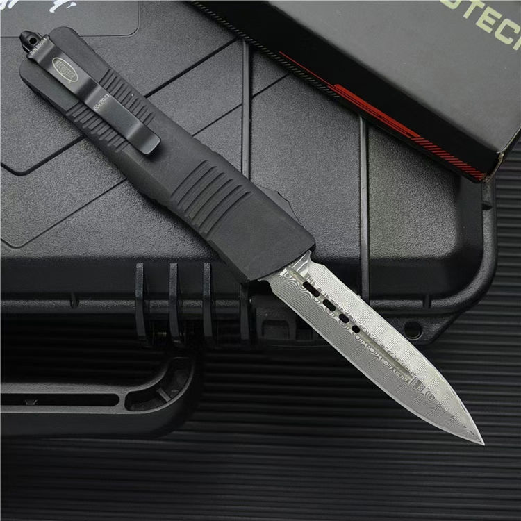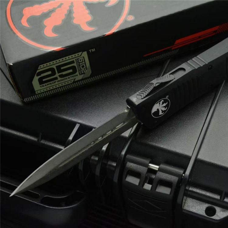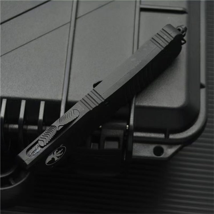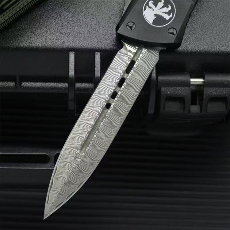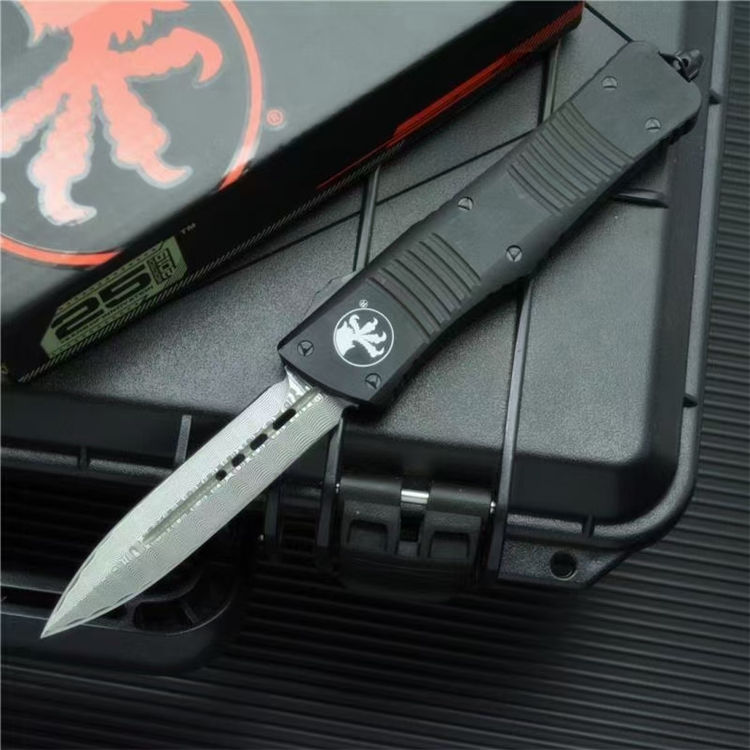 大马士革微技术大龙直出跳刀 全长:24cm 刃长:9.5cm 柄长:14.5cm 刃宽:2.1cm(最宽处) 刃厚:0.32cm 硬度:59-60HRC 刃材:大马士革钢 手柄:航空铝 表面:精细石洗 重量:139g/222g(含包装) 包装:彩盒 这种战斗恐龙自动刀的特点是一个大马士革双刃刀片和黑色阳极氧化6061-T6铝处理,与青铜硬化的硬件螺丝等。 Microtech最大的OTF生产刀是以恐龙命名的。战斗恐龙是真正的恐龙系列的大号版本。尽管有这么大的尺寸,手柄还是感觉纤细舒适。动作很精彩