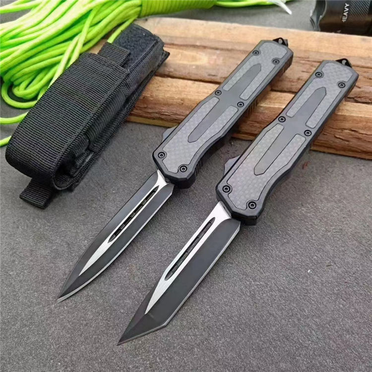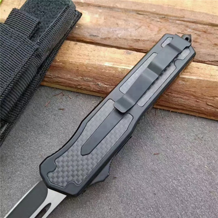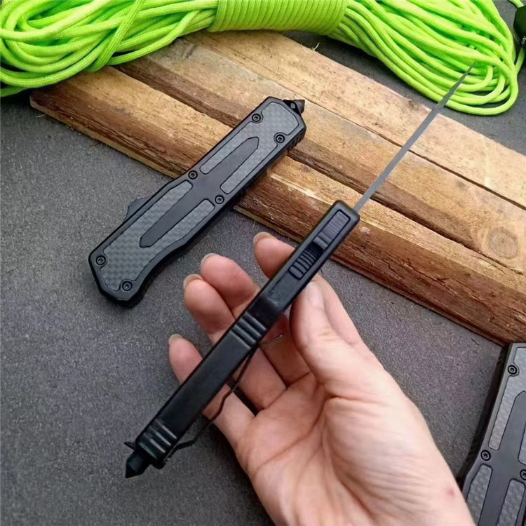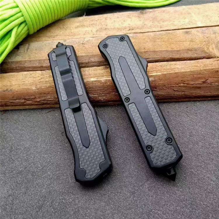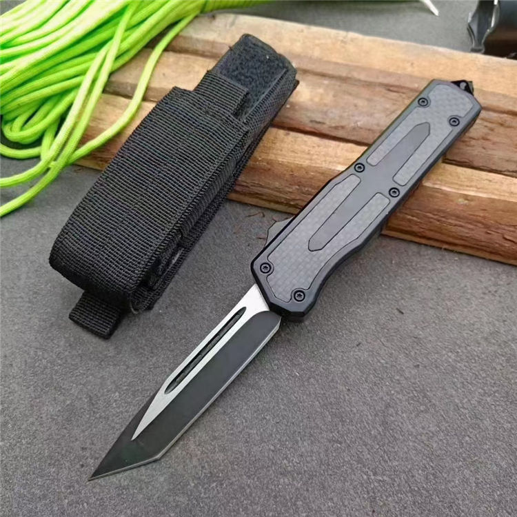伤齿龙碳纤直出跳刀 全长:17.5cm 刃长:7cm 刃厚:2.8mm 刃材:440 硬度:57HRC 刀重:134g 毛重:183g含包装 表面:氧化黑 柄材:锌铝合金+碳纤 刀鞘:尼龙 锁闭:直出弹簧刀