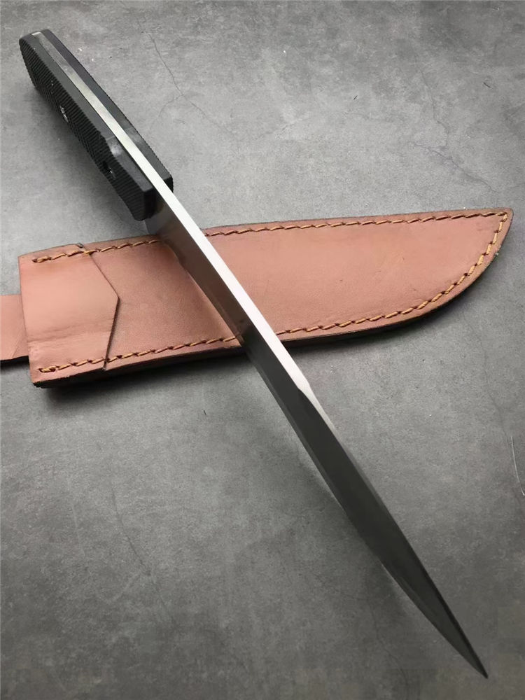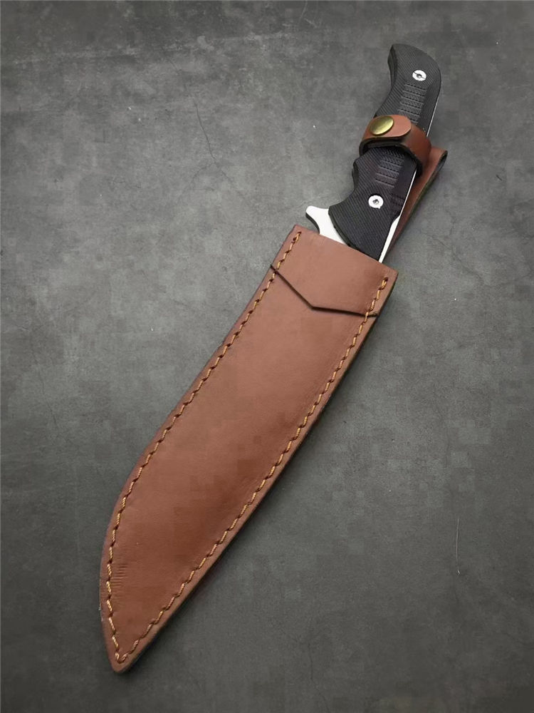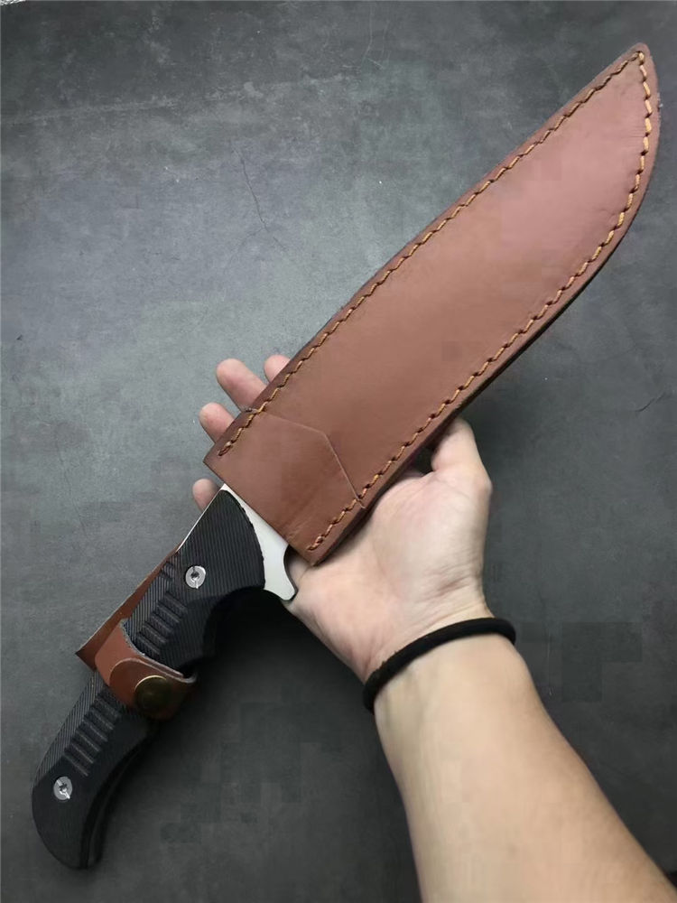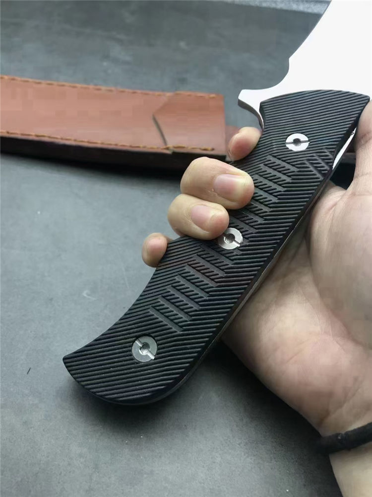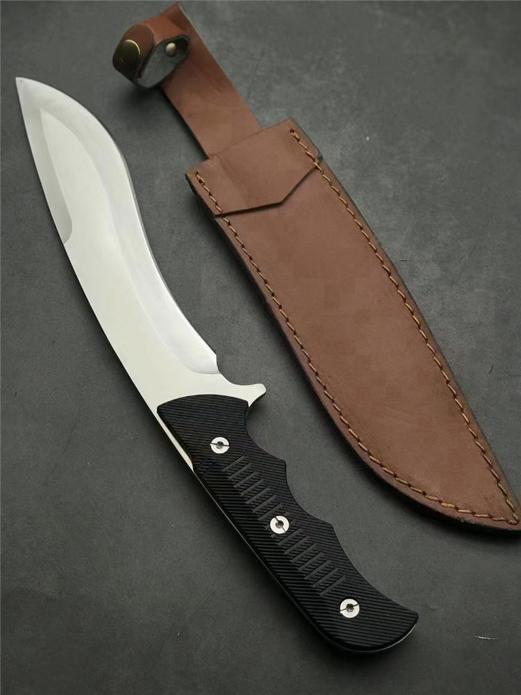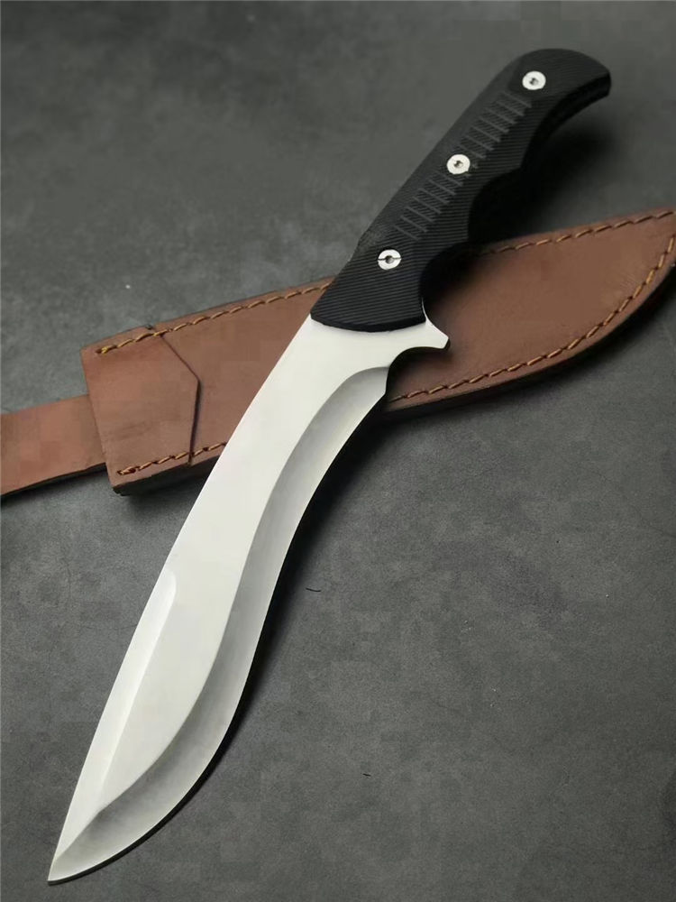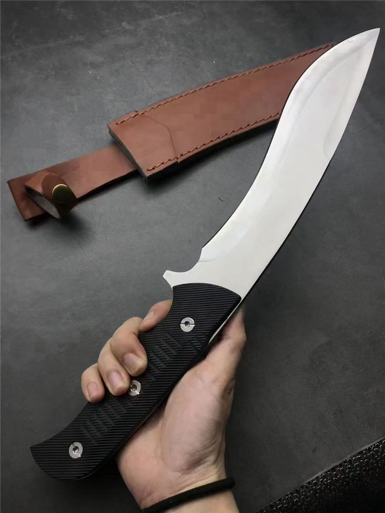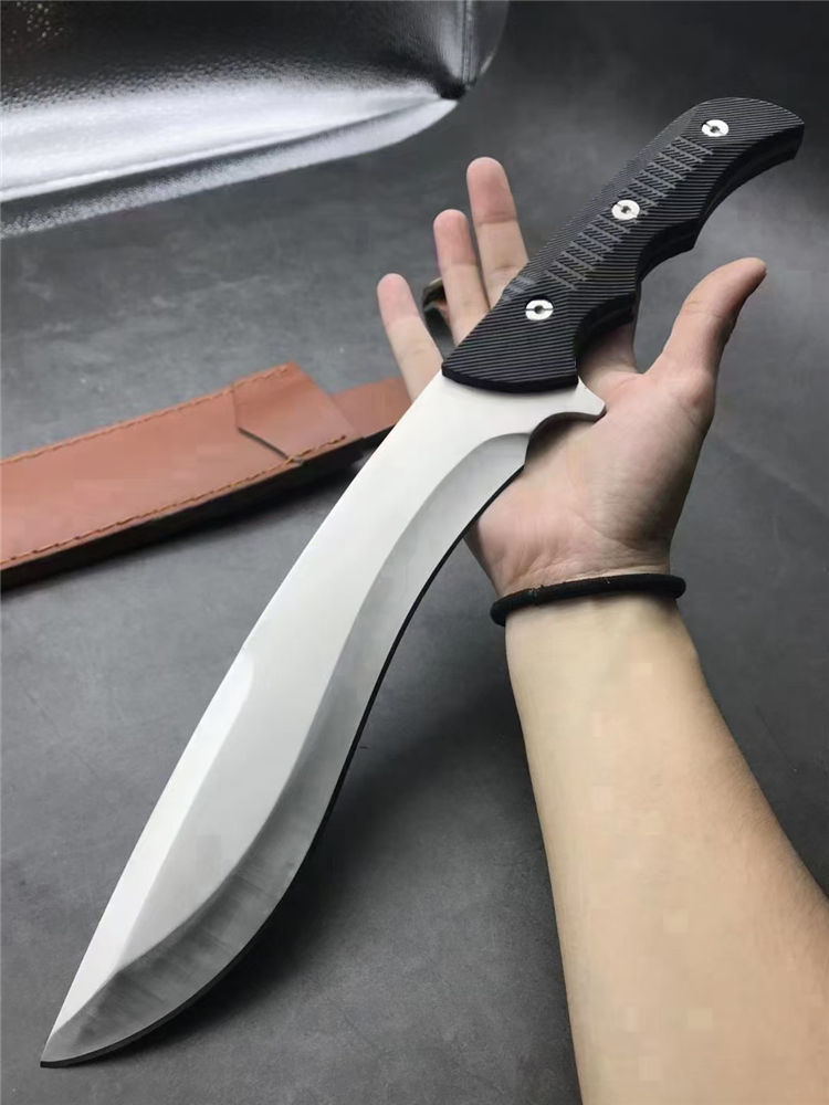 刀奴神龙G10柄狗腿弯刀 全长:38cm 刃长:22.5cm 刃宽:4.7cm(最宽处) 柄长:16cm 刃厚:5mm 刃材:440 硬度: 57RHC 表面:丝光 柄材: G10 净重:574克 其他:一体龙骨结构