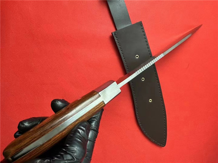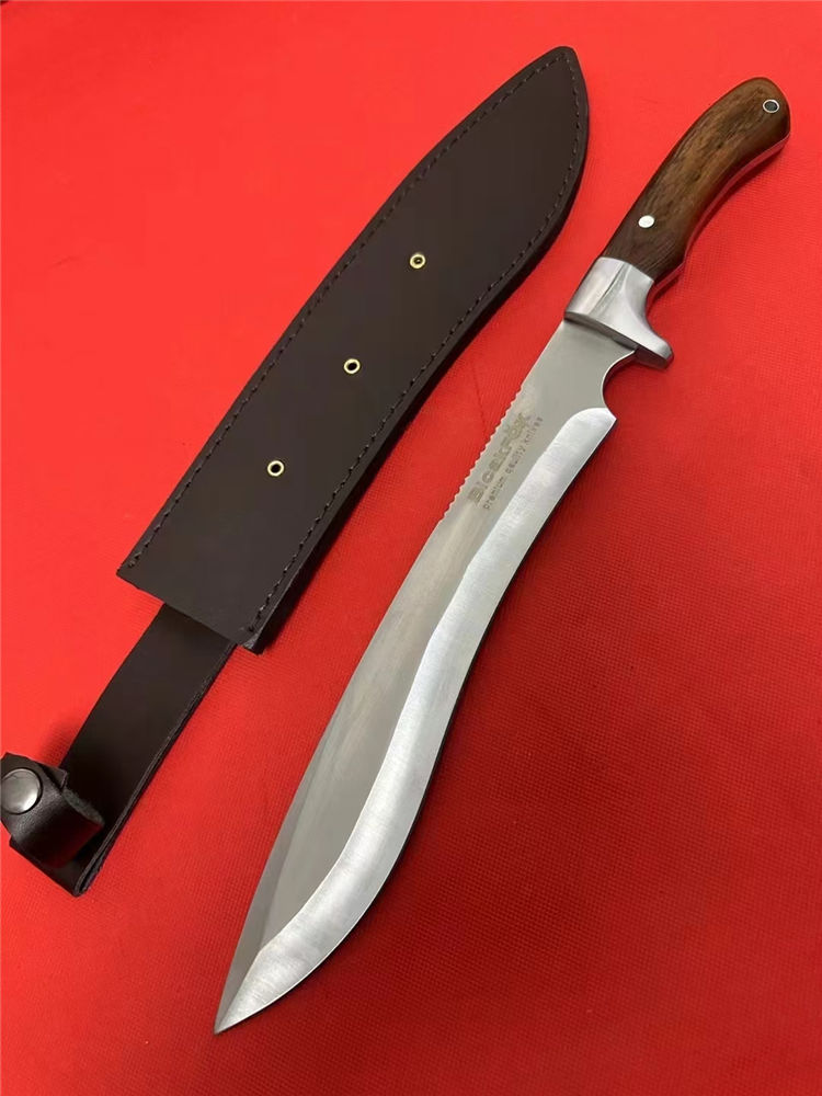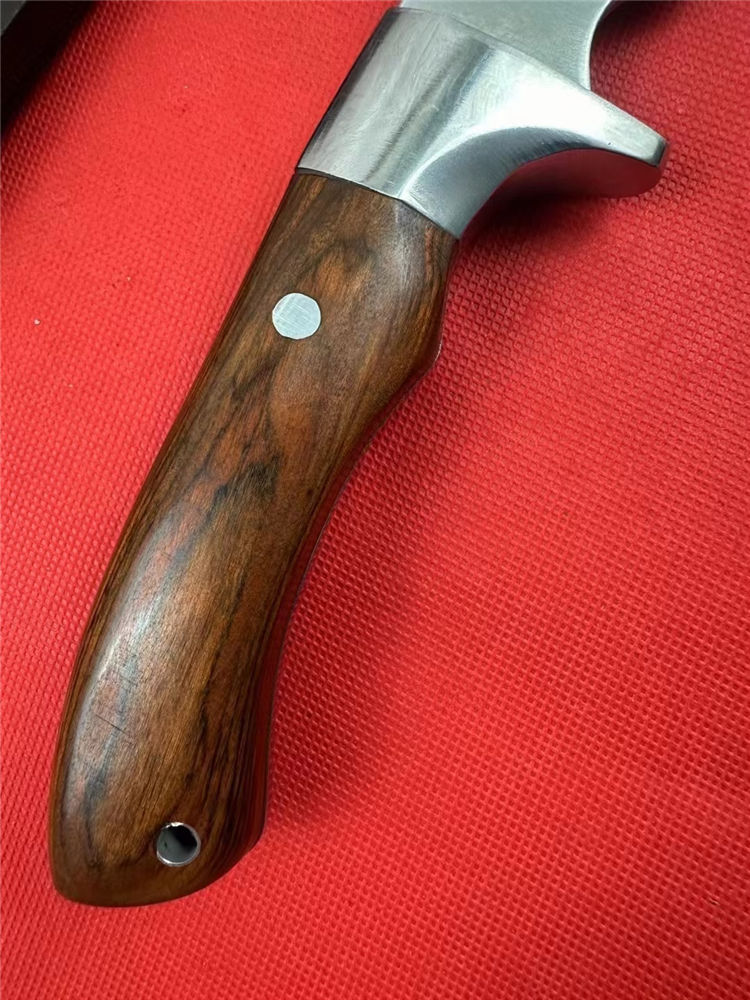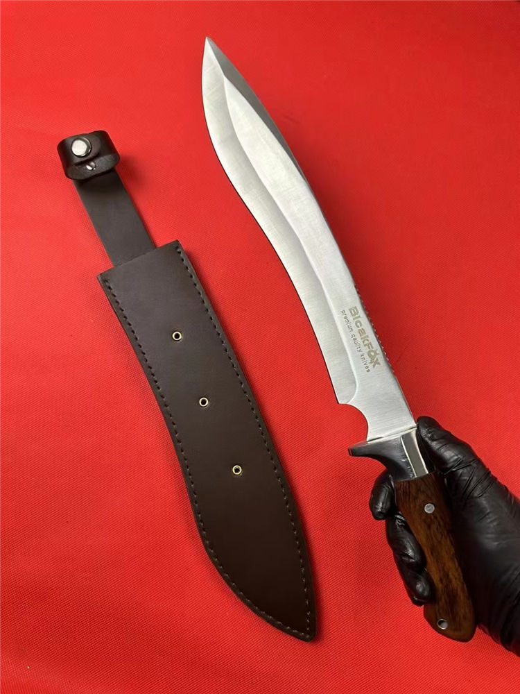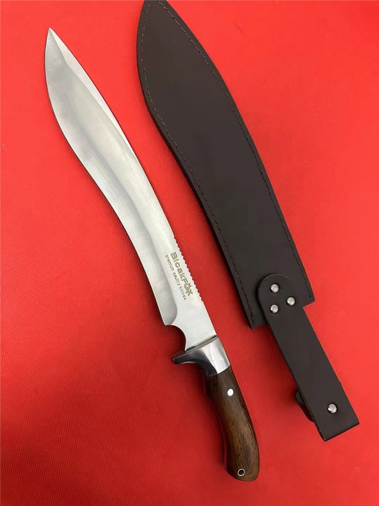 狐狸—佼佼者(加长版) 全长:42.5cm 刃长:26.5cm 柄长:13.5cm 刃厚:5.1mm 刃宽: 4.6cm 刃材: 5Cr13 柄材: 进口彩木+精铸钢头再线切割(使刀更完美) 硬度: 57HRC 净重:600克 毛重:930克 表面处理: 纯手工激光纹 结构:龙骨结构,刀身贯穿刀柄,非常牢固 其他:不管从外观看或实用型,它都是狐狸中的佼佼者