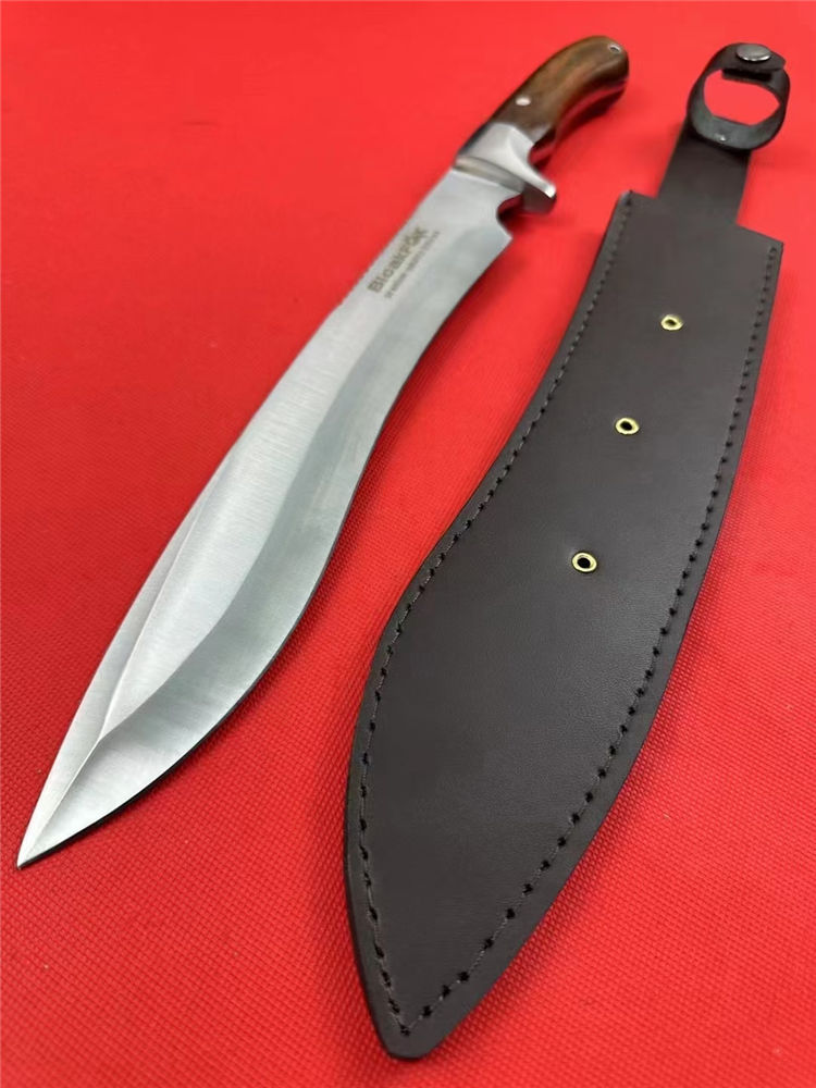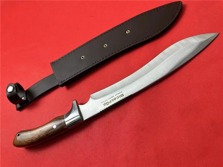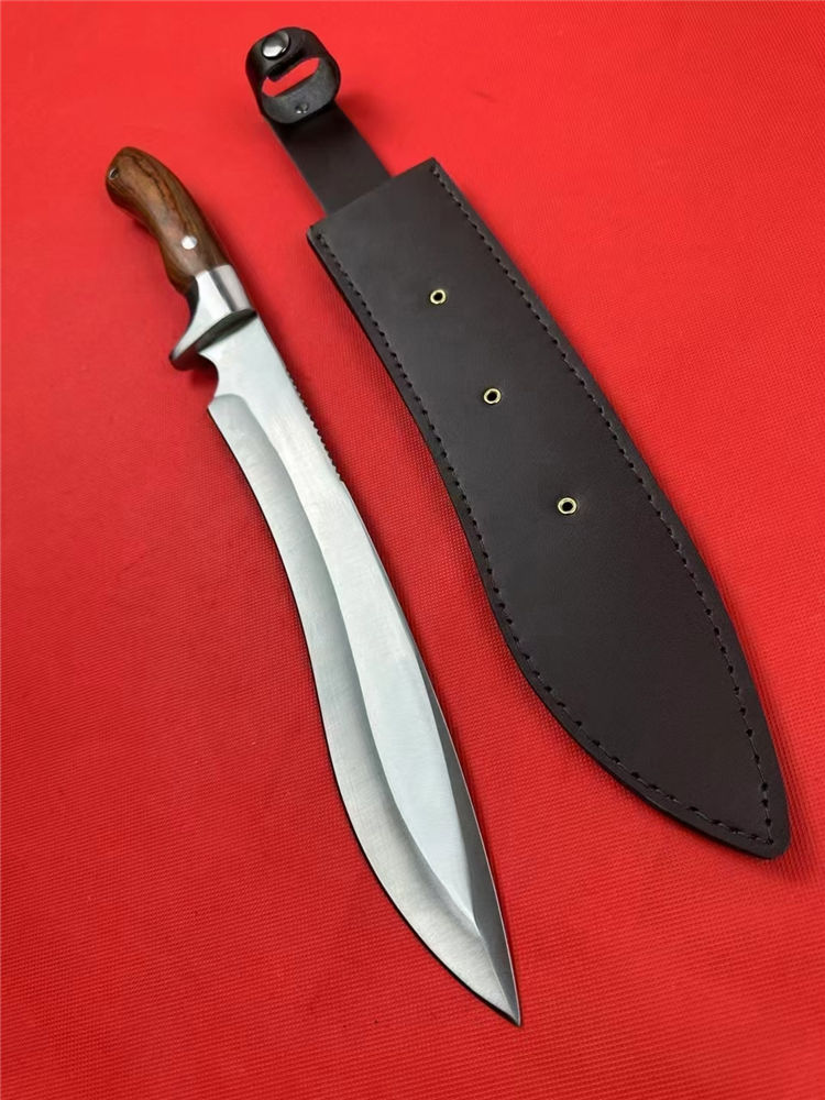 全长:42.5cm 刃长:26.5cm 柄长:13.5cm 刃厚:5.1mm 刃宽: 4.6cm 刃材: 5Cr13 柄材: 进口彩木+精铸钢头再线切割(使刀更完美) 硬度: 57HRC 净重:600克 毛重:930克 表面处理: 纯手工激光纹 结构:龙骨结构,刀身贯穿刀柄,非常牢固