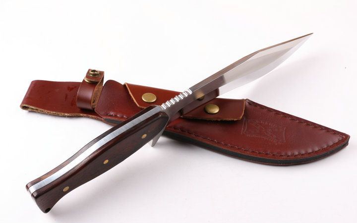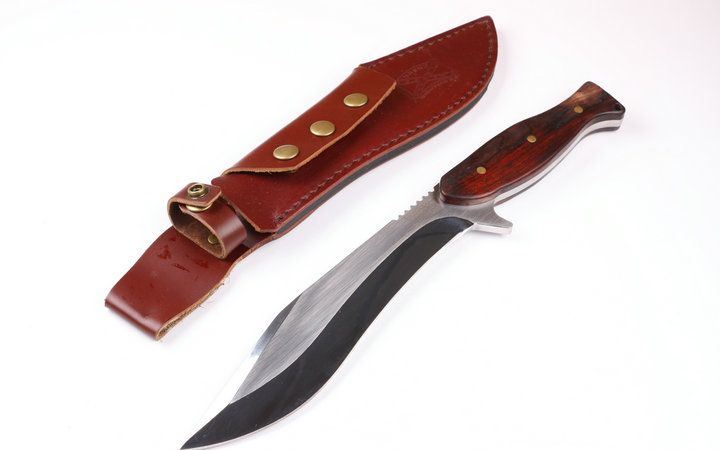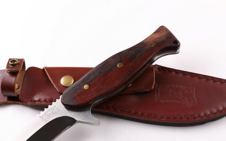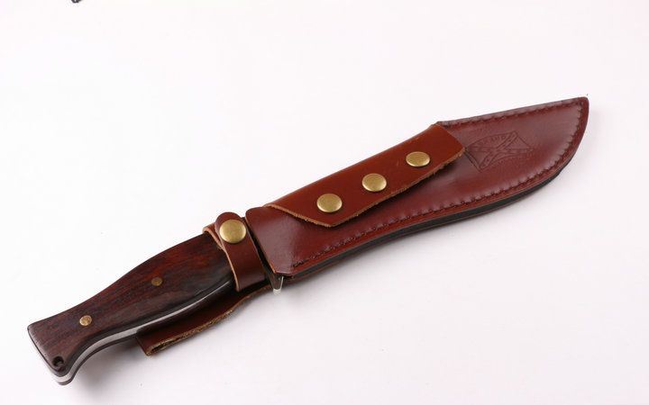 布兰登—狗腿刀 全长:360mm 刃长:210mm 刃宽:41mm 刃厚:6.2mm 刀重:580g 毛重:700g 刃材:5CR15MOV 硬度:58HRC{真空热处理) 表面:精细拉丝伴镜光 柄材:花梨木 刀鞘:真牛皮套