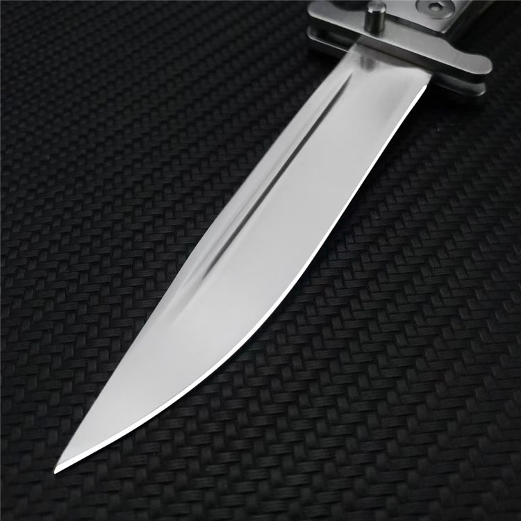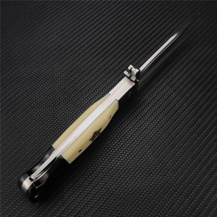 皮套版爱国者折刀 全长:21.4CM 刃长:9.6CM 刃宽:1.7CM 刃厚:2.5MM 刃材:440C 柄长:11.8CM 柄材:树脂 重量:134G 刀鞘:牛皮刀鞘