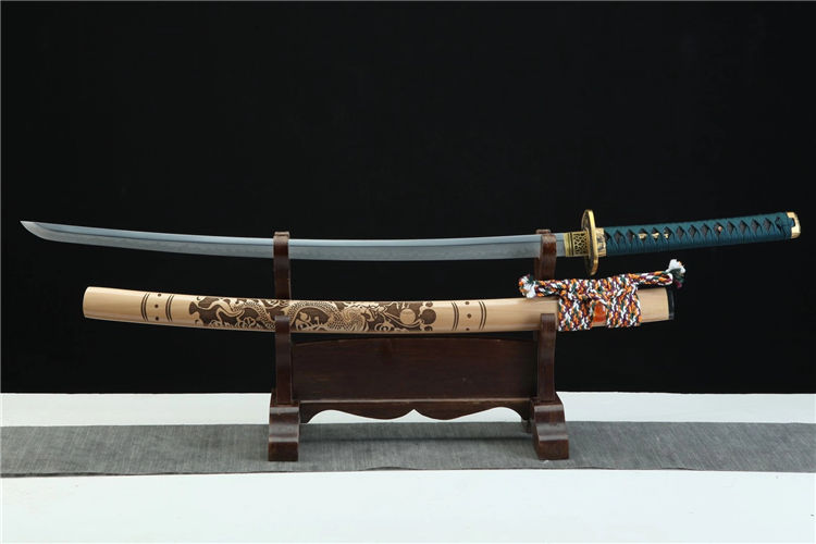 辰龙武士刀 总长:103cm 刃长:71cm 柄长:27cm 刃宽:3.2cm 刃材:t10钢 工艺:覆土烧刃,研磨灰 柄:仿鱼皮 鞘:原木刻龙鞘 装具:纯铜做旧 配置:锦盒/油/布(可拆卸)