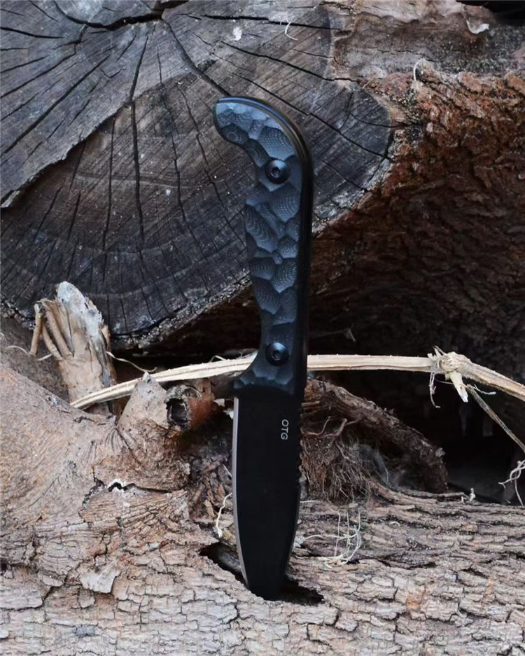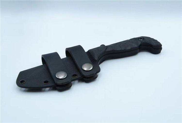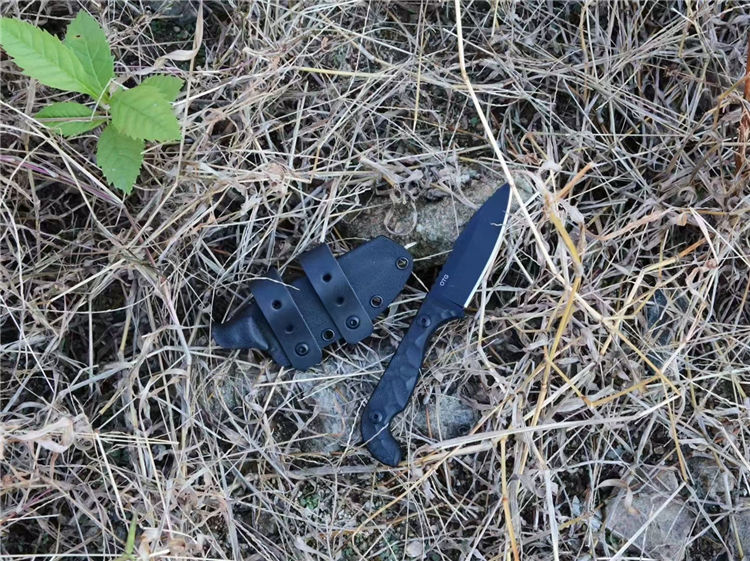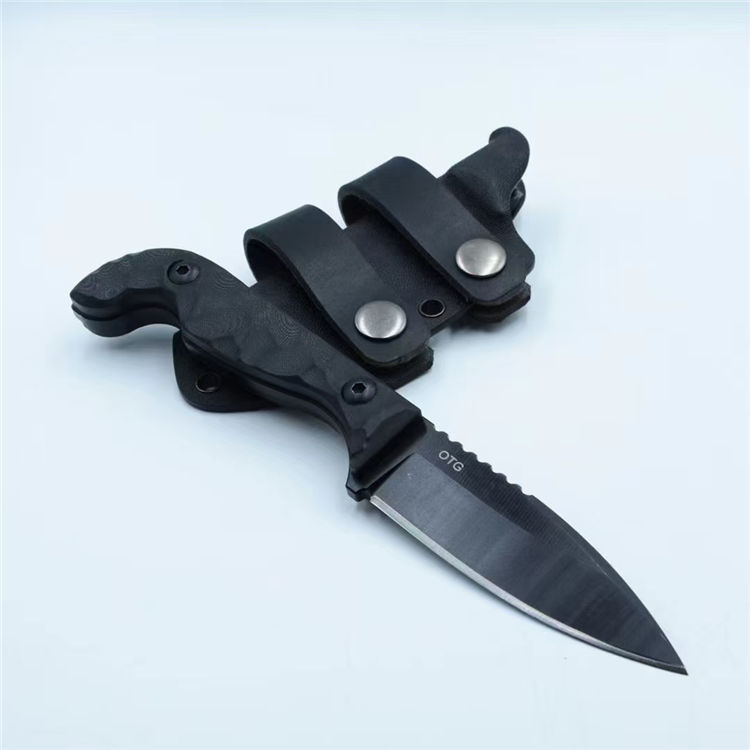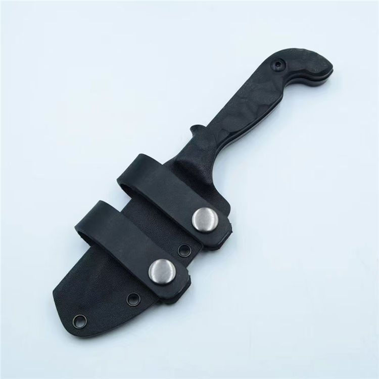 表面发黑处理,G10手柄,配K鞘+皮质腰带环2个,可实现双腰带环横挂或单腰带环隐蔽携带,气孔距离通用其他各类背夹