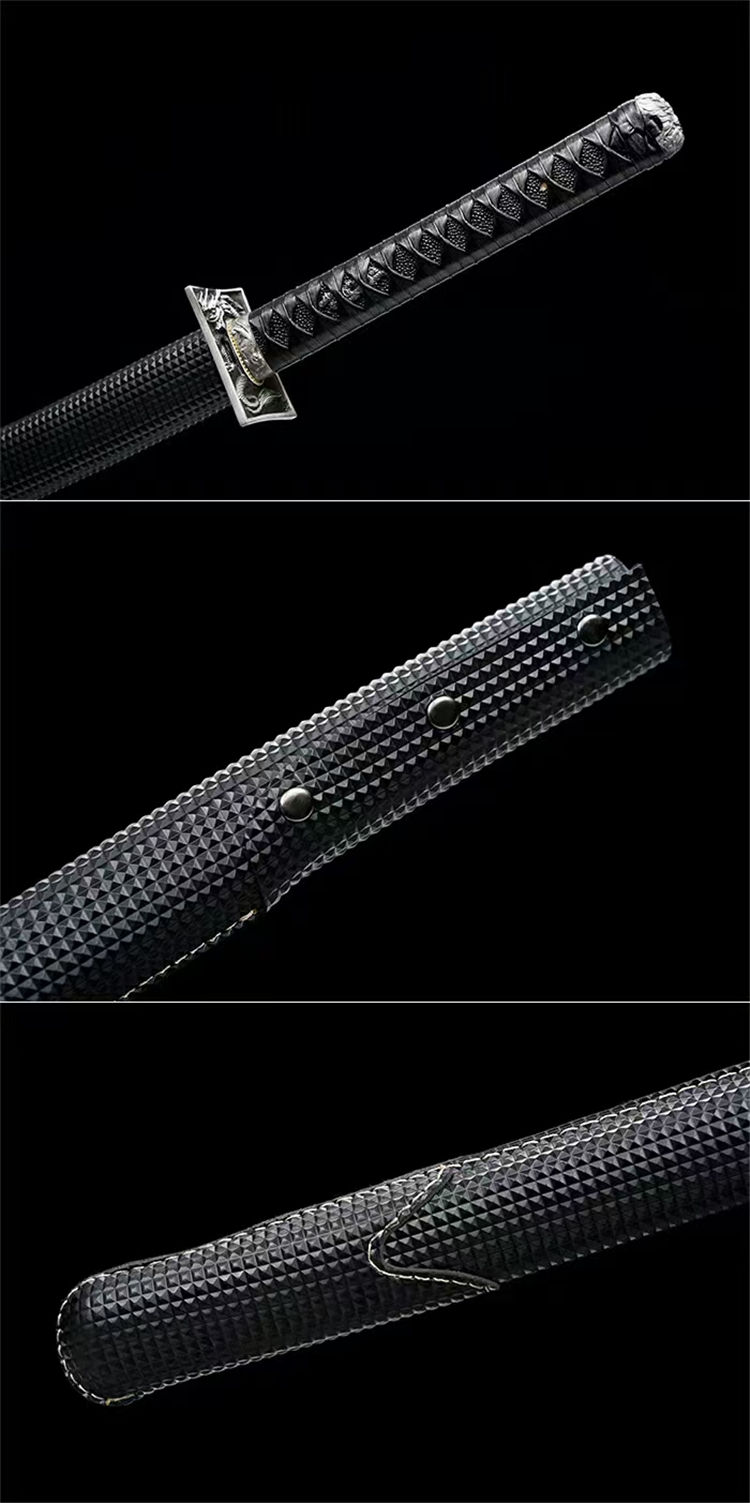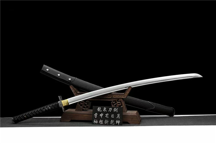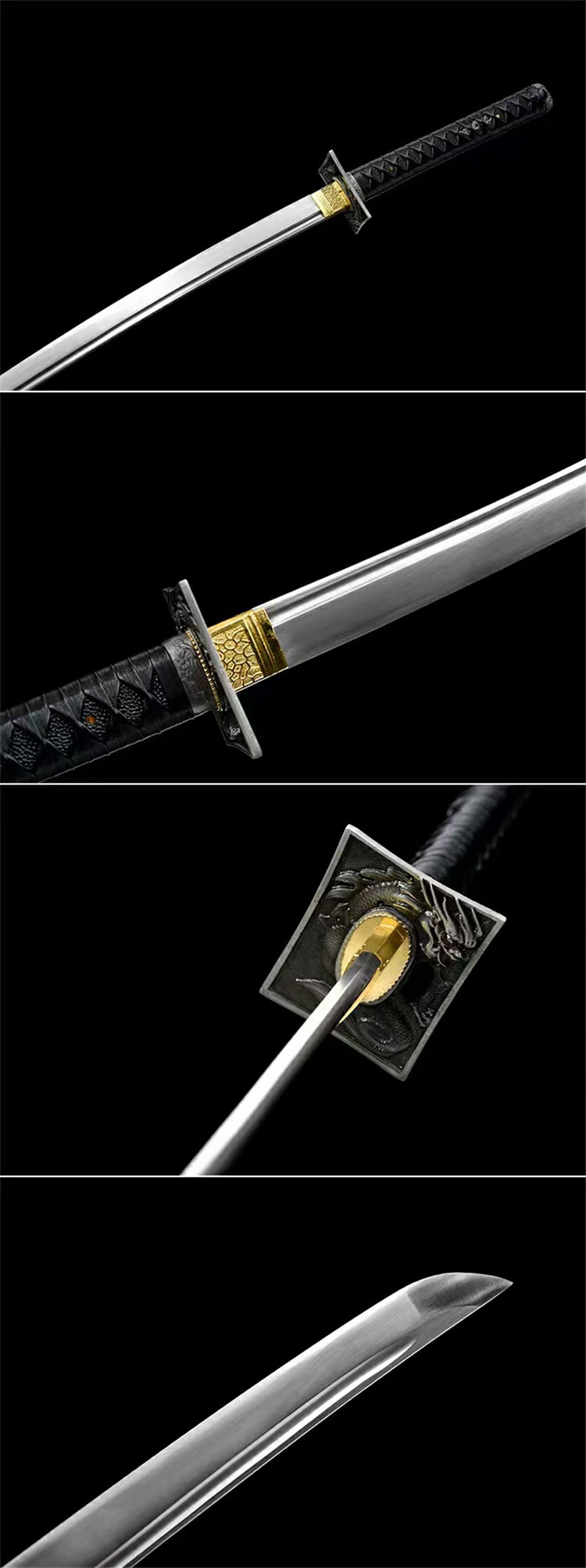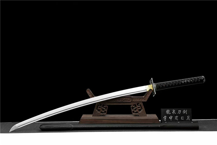 亿龙武士刀 全长:105cm 刃长:70cm 柄长:27cm 刃宽:3.2cm 刃厚:0.8cm 重约:1.45kg 刀鞘:皮革包实木 配件:砂银合金 刃材:弹簧钢