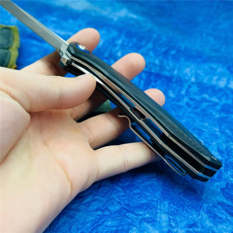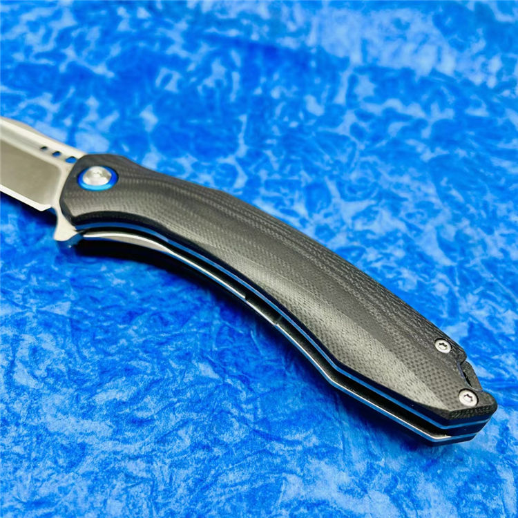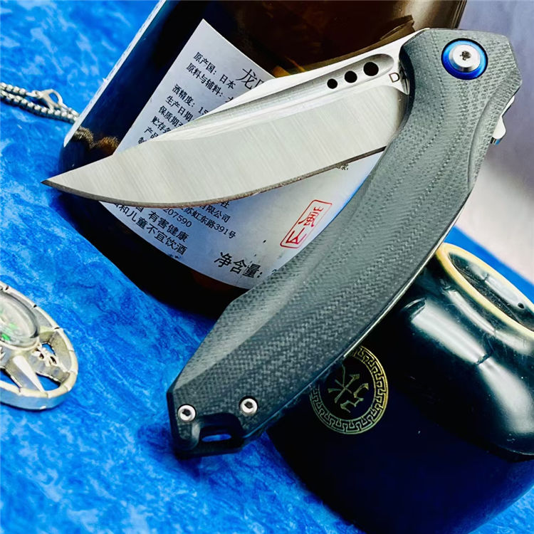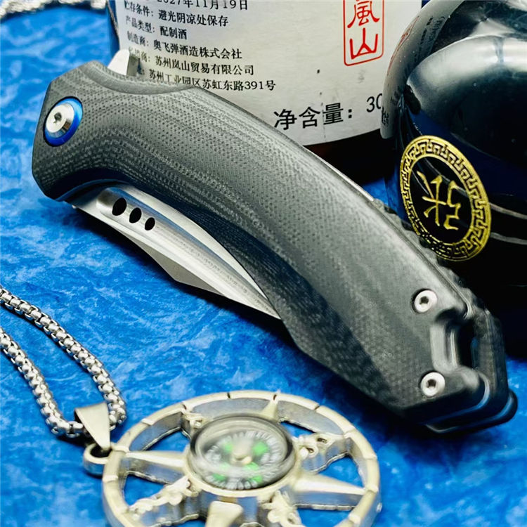 该刀采用高品质D2钢材打造,真空热处理后硬度达58-60HRC,柄材不锈钢底骨+碳纤维贴片,整刀线条流畅,蓝狐风格,实用与颜值兼备