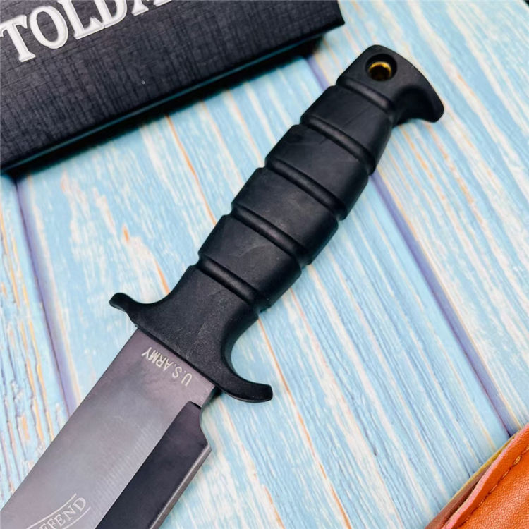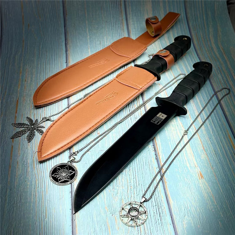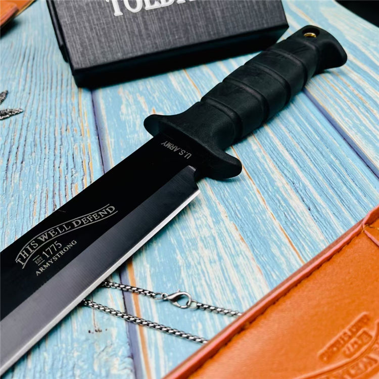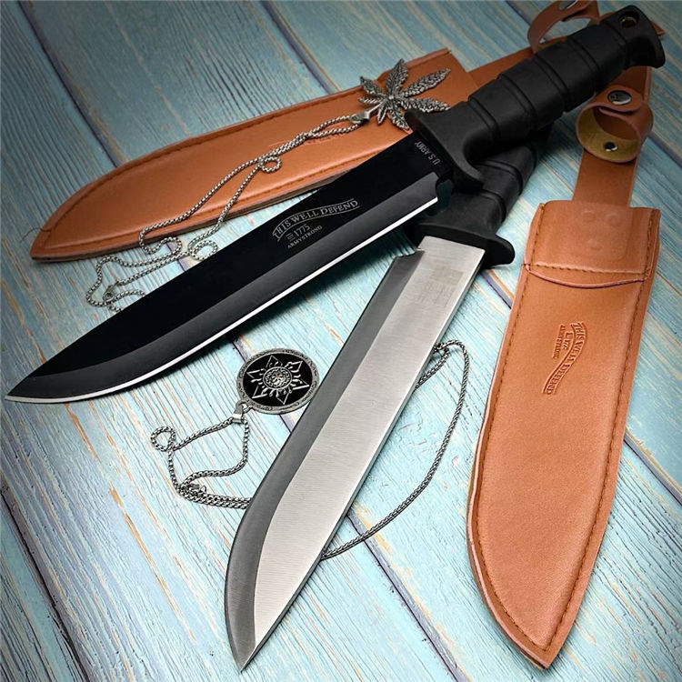 直杠重者直刀 全长:34cm 刃长:22cm 柄长:11.5cm 刃宽:1.3cm 刃厚:0.5cm 刃材:5cr13 硬度:58HRC 重量:550g含皮套 颜色:质感黑/本钢白