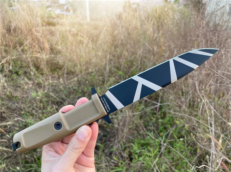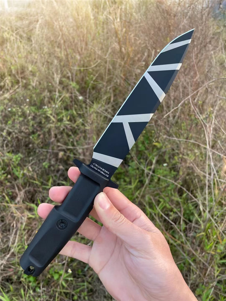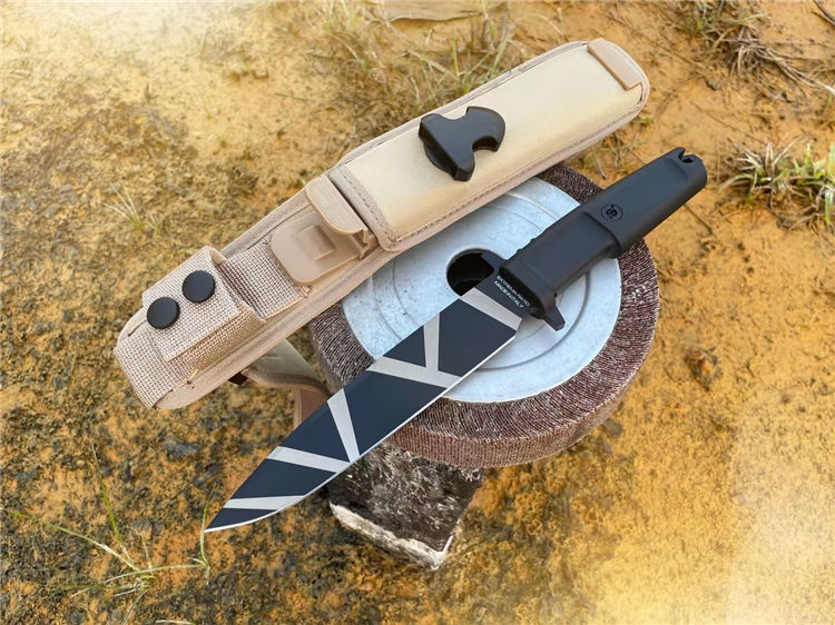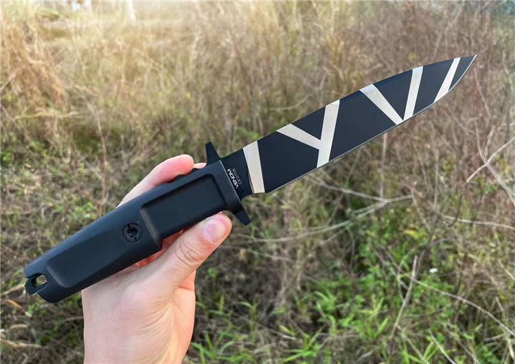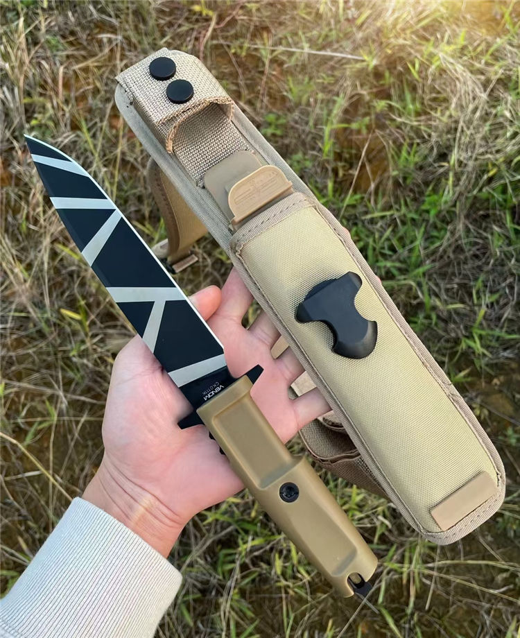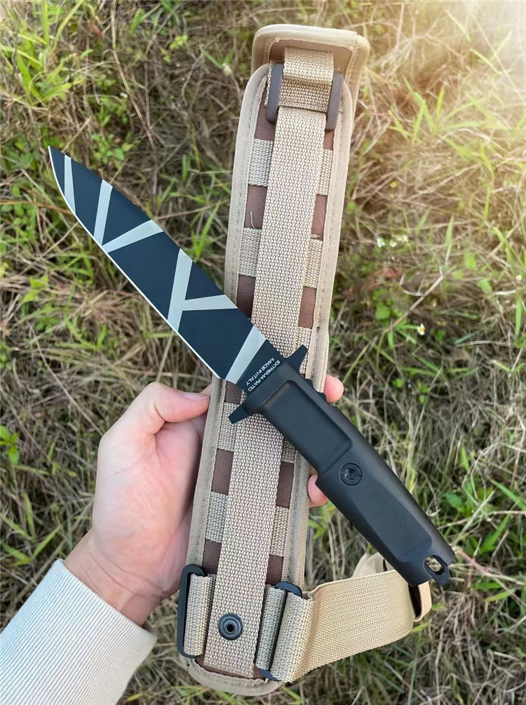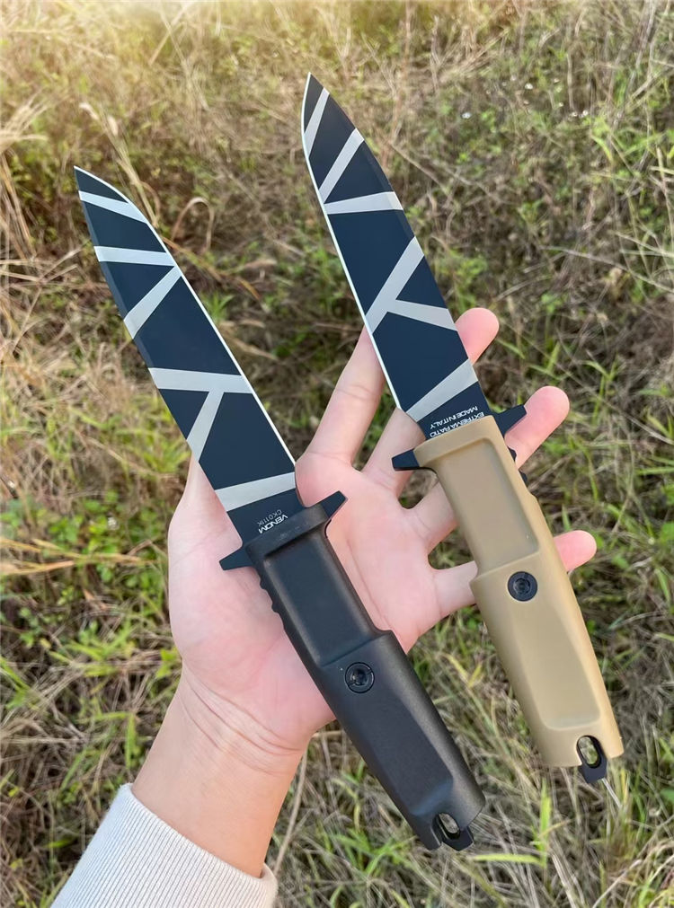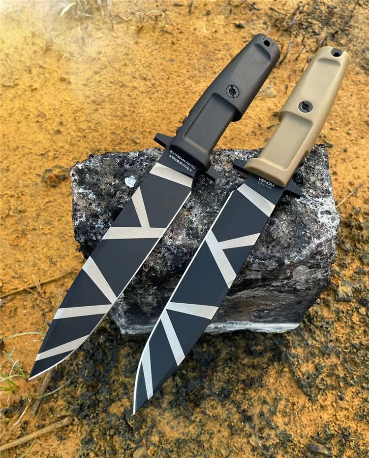 外贸版极端武力毒液直刀 全长:310MM 柄长:130MM 刃厚:6MM 刃宽:32.5MM 最宽:54.5MM 材质:进口N690钢 硬度:58-60HRC 热处理:专业真空深冷油淬 结构:一体龙骨设计 净重:约282G 手柄:克拉通手柄有两种颜色选择(沙漠色和黑色) 刀鞘:配高品质尼龙袋鞘内带ABS硬固定鞘锁定 包装:高品质手工盒子配说明书,签名标签