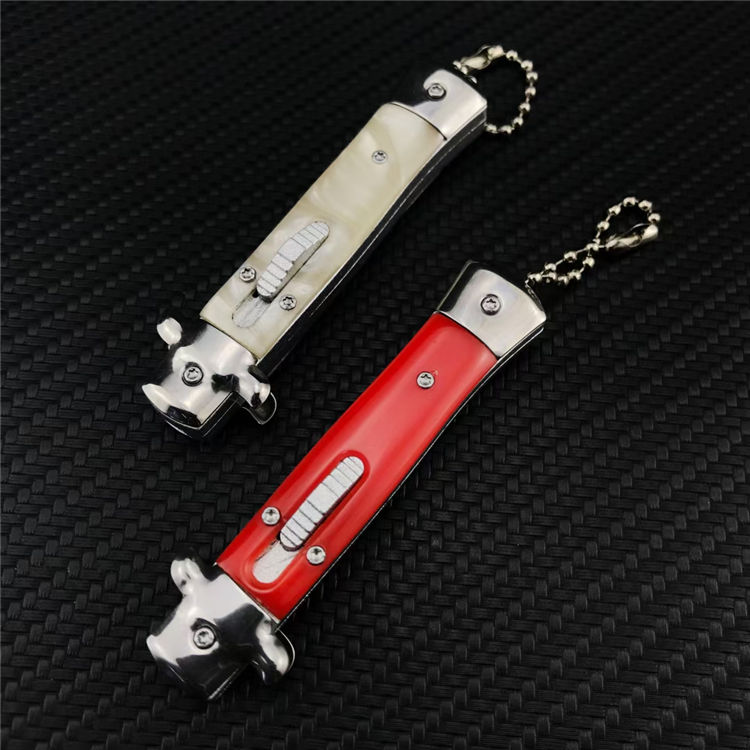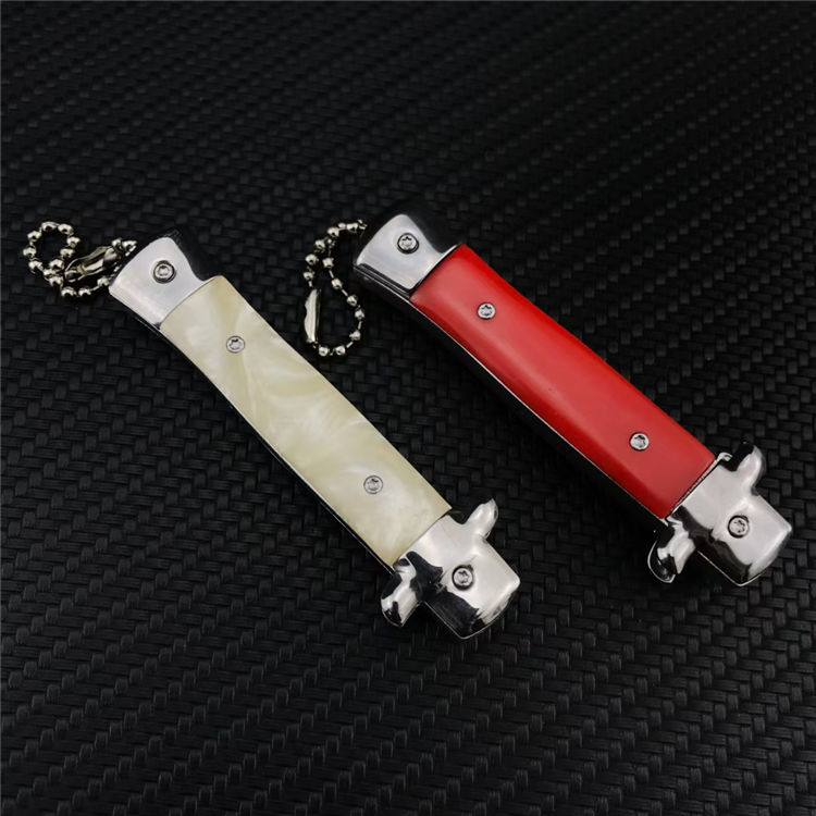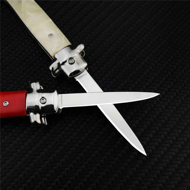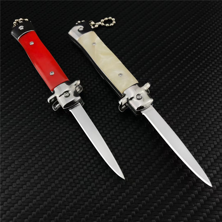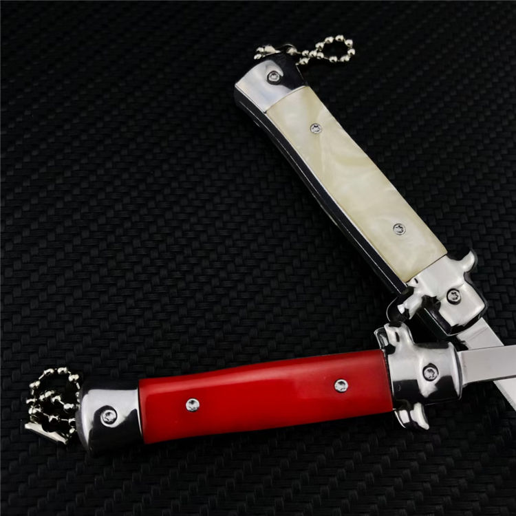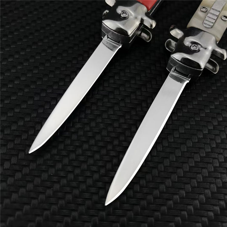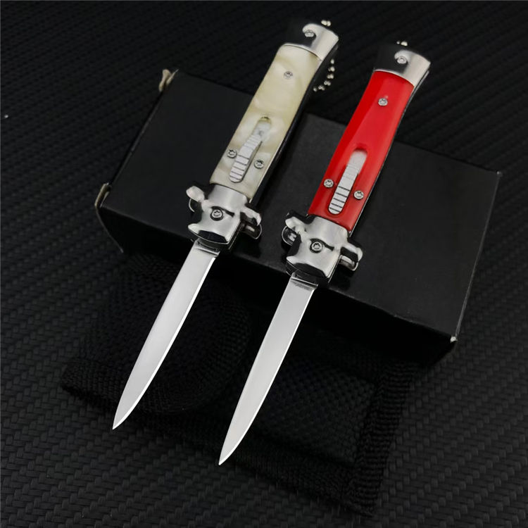 意大利5寸AKC直出跳刀 总长:12CM 刃长:4.9CM 刃宽:06MM 刃厚:1MM 刃材:440C 柄长:7.1CM 柄材:亚克力 柄宽:12MM 柄厚:11MM 净重:37G含包装盒 鞘材:尼龙