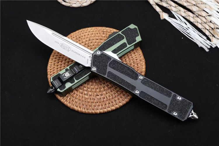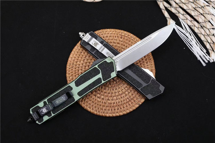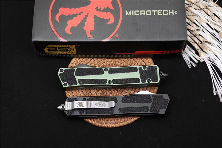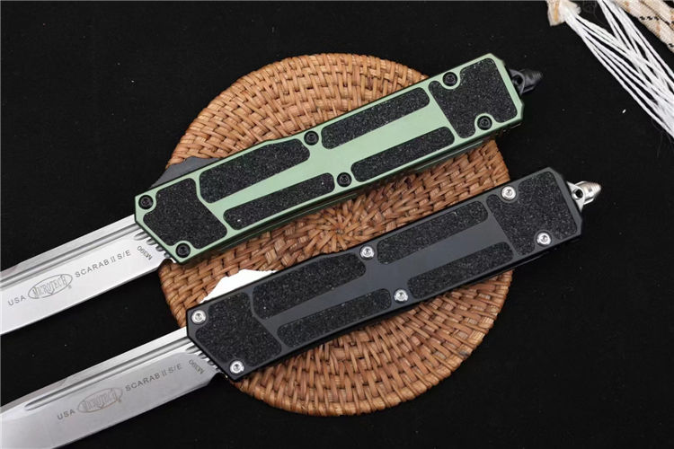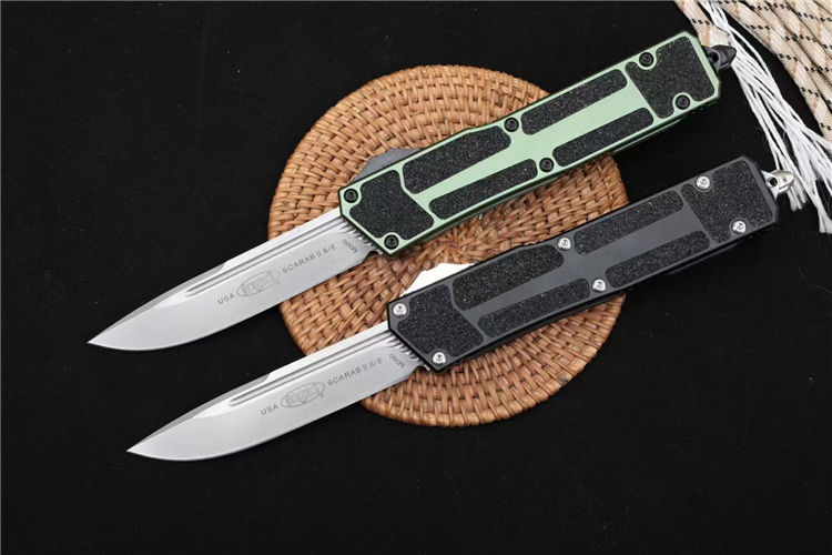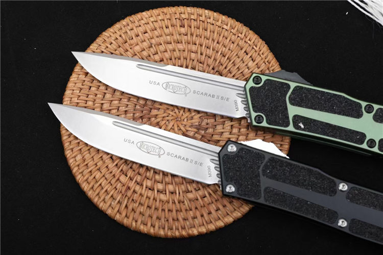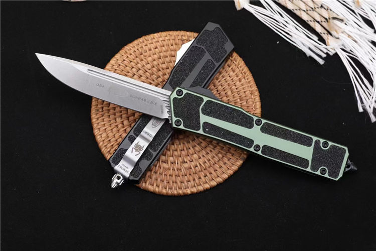 微技术海军甲虫2直出跳刀 全长:24.4cm 刃厚:0.4cm 柄厚:1.4cm 钢材:D2 柄材:航空铝+贴片沙 重量:159g 附件:尼龙套 拆刀工具 说明书整刀用,CNC,电脑锣,线切割制作而成,手工,精密度非常高,很值得收藏的一把刀