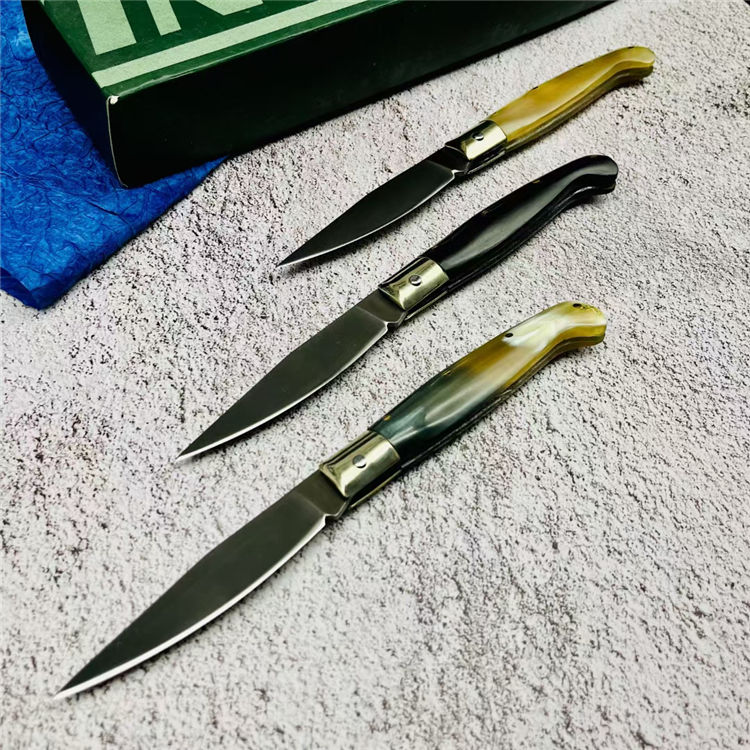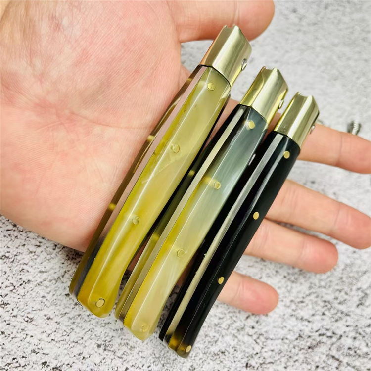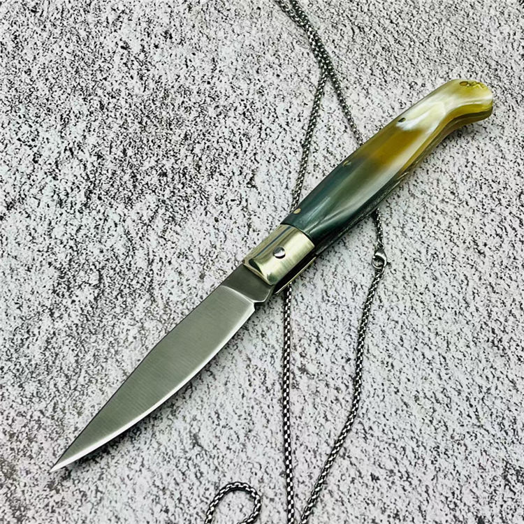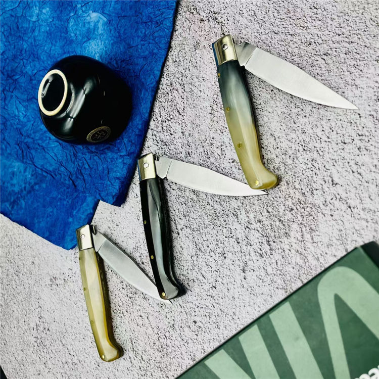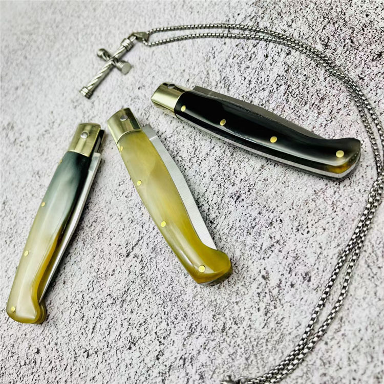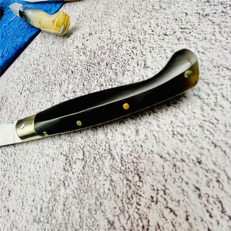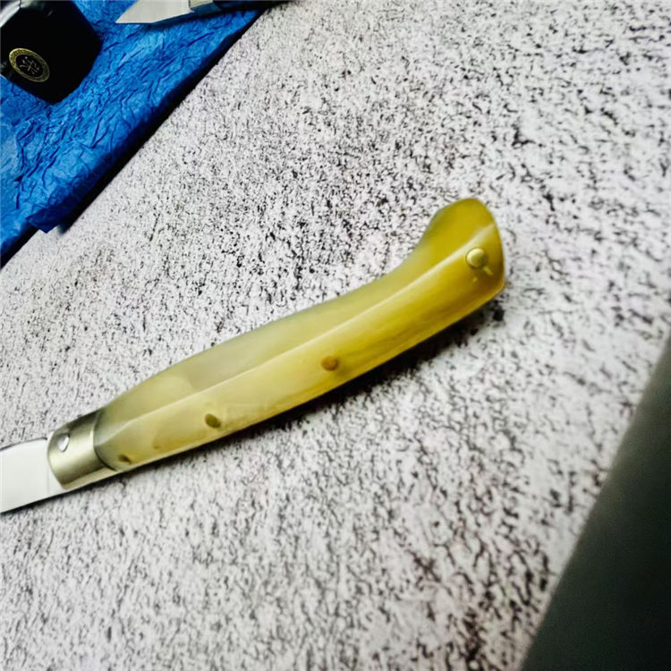 灵珀羊角折刀 全长:17.3cm 刃长:7.8cm 柄长:9.3cm 刃材:9cr18mov 柄材:天然骨柄 重量:55g 硬度:58HRC 表面处理:凌空油光处理 包装:原厂包装