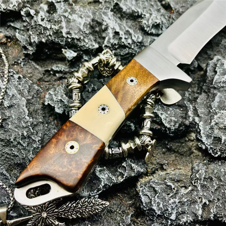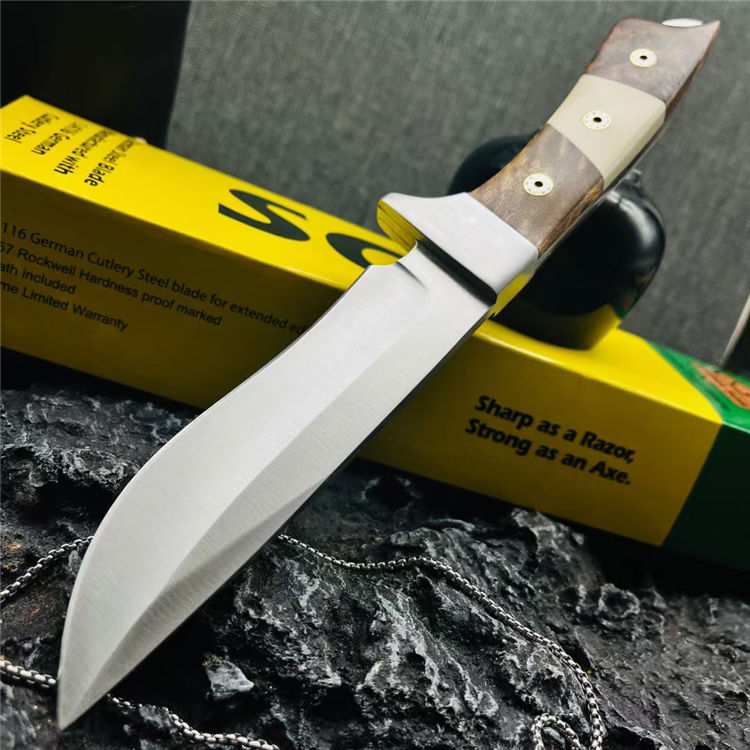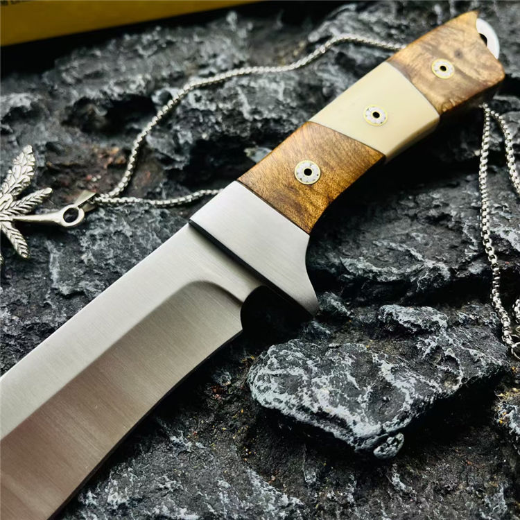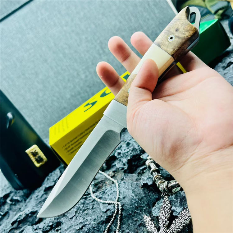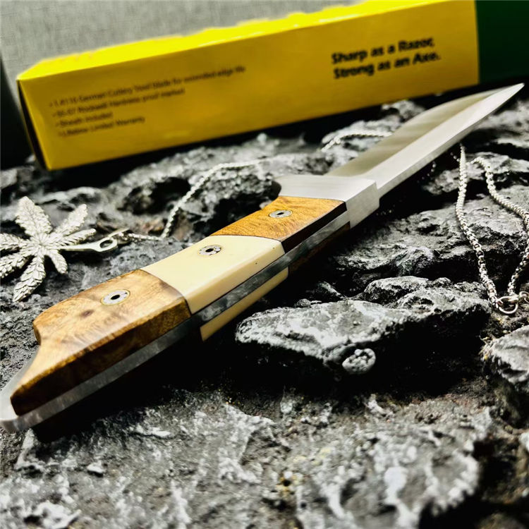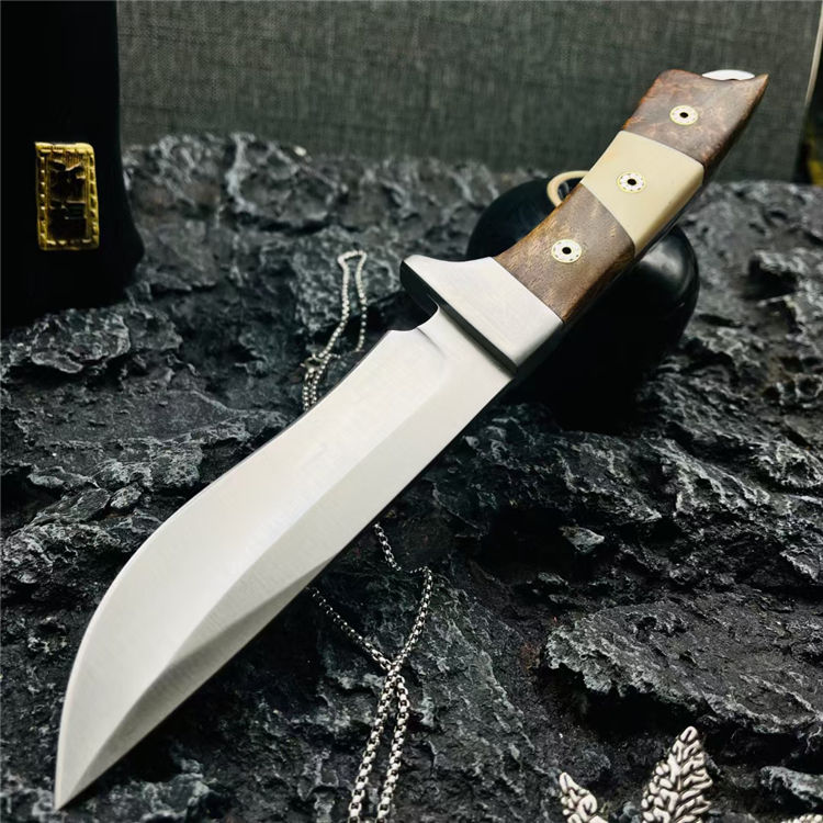 三眼棕直刀 全长:247mm 刃长:122mm 刃宽:1.4cm 刃材:N690钢(一体龙骨) 硬度:58-60HRC 刃厚:0.3mm 硬度:59HRC 净重:221g 柄材:黄檀木+不锈钢 表面处理:钢本石洗 包装:牛皮刀套