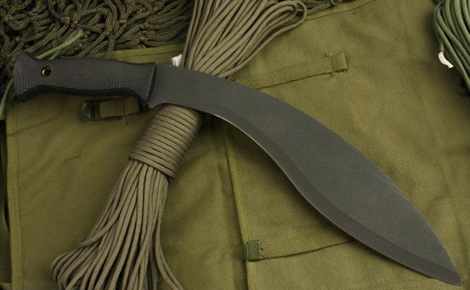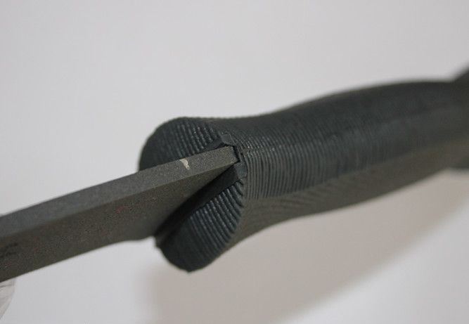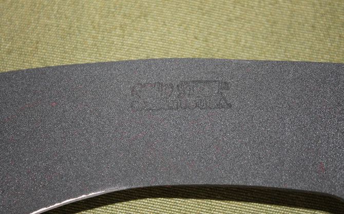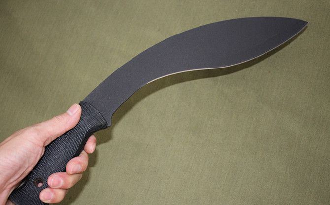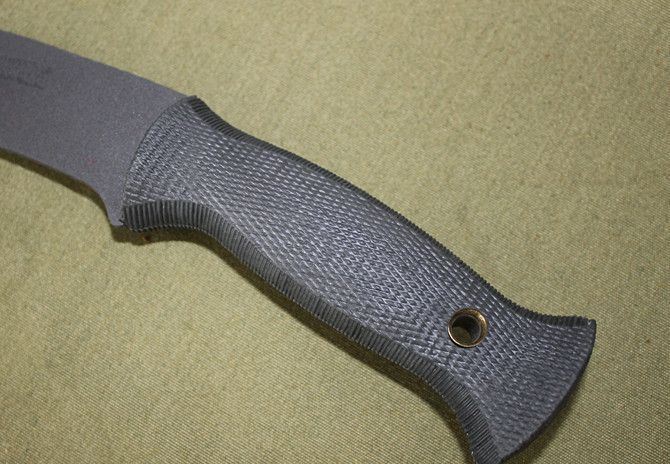 冷钢—喷砂狗腿2号 全长:43cm 刃长:31.5cm 柄长:12.5cm 刃厚:3.6mm 刃宽:6.2cm 刃材:5Cr13 柄材:ABS 硬度:55HRC 净重:520克 毛重:610克(含包装物) 表面处理:喷砂