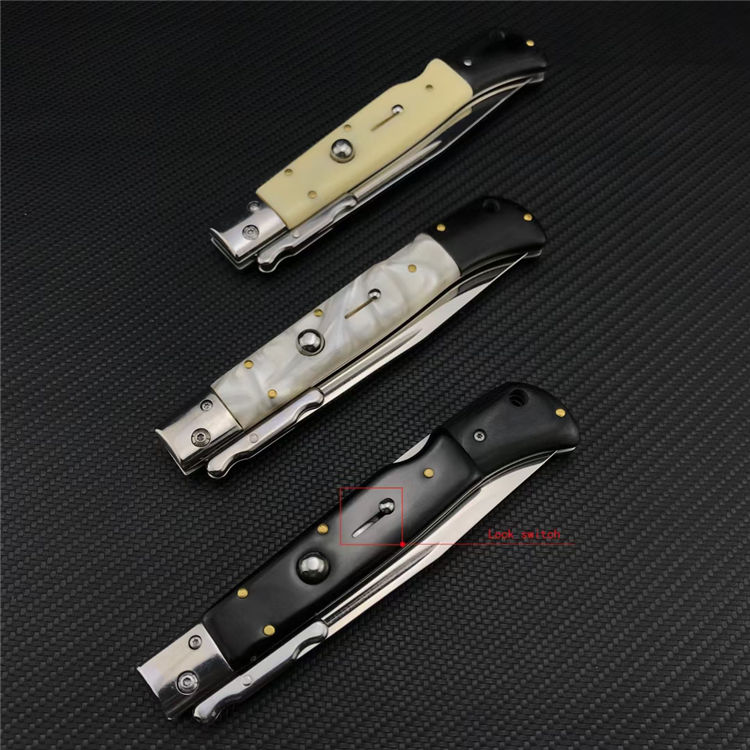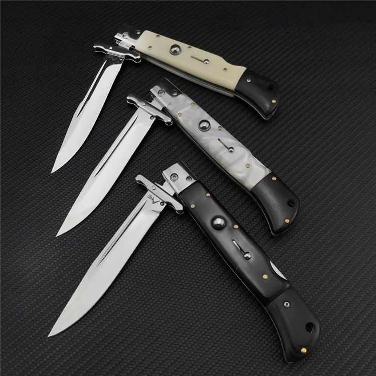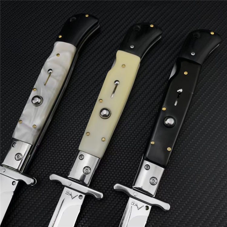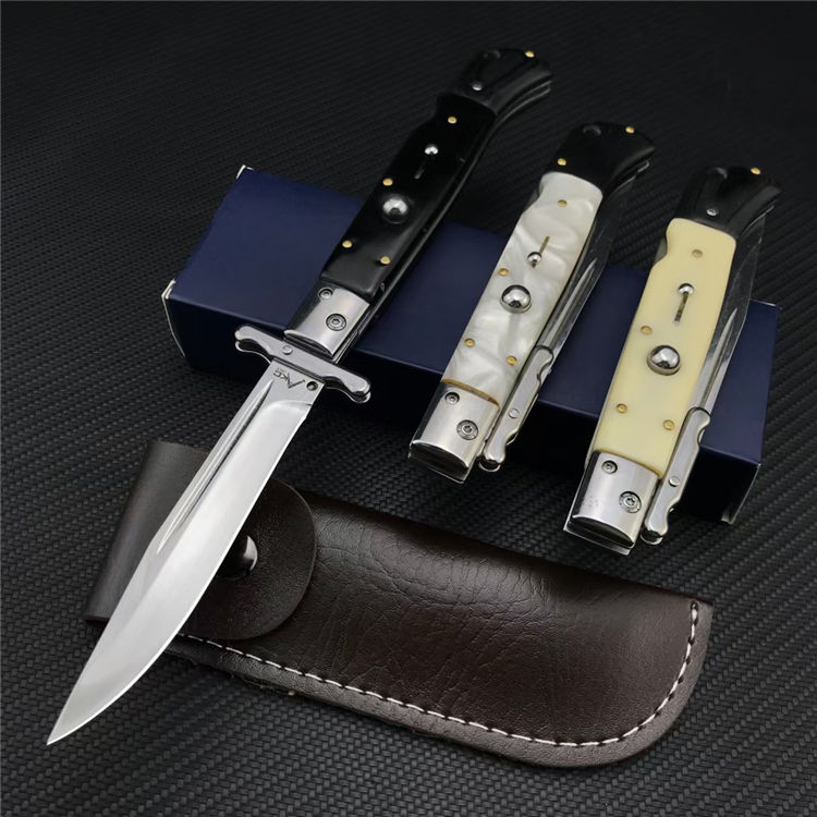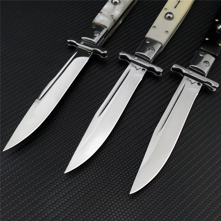 爱国者AKC侧开跳刀 总长:28CM 刃长:11.8CM 刃宽:1.8CM 刃厚:2.5MM 刃材:440C 柄长:15.2CM 柄材:贝壳+彩木,树脂+彩木,亚克力+彩木三款可选 柄宽:21MM 柄厚:18MM 净重:200G含刀鞘 刀鞘:牛皮鞘