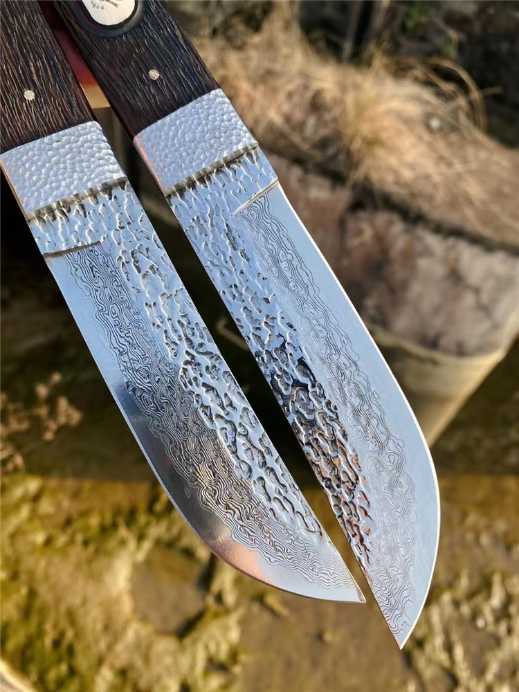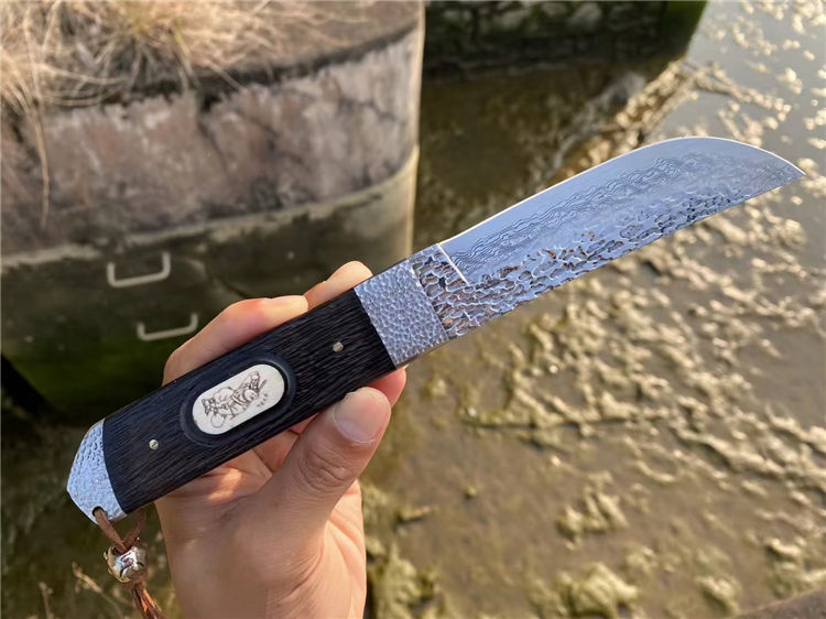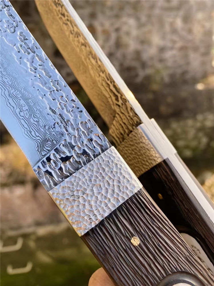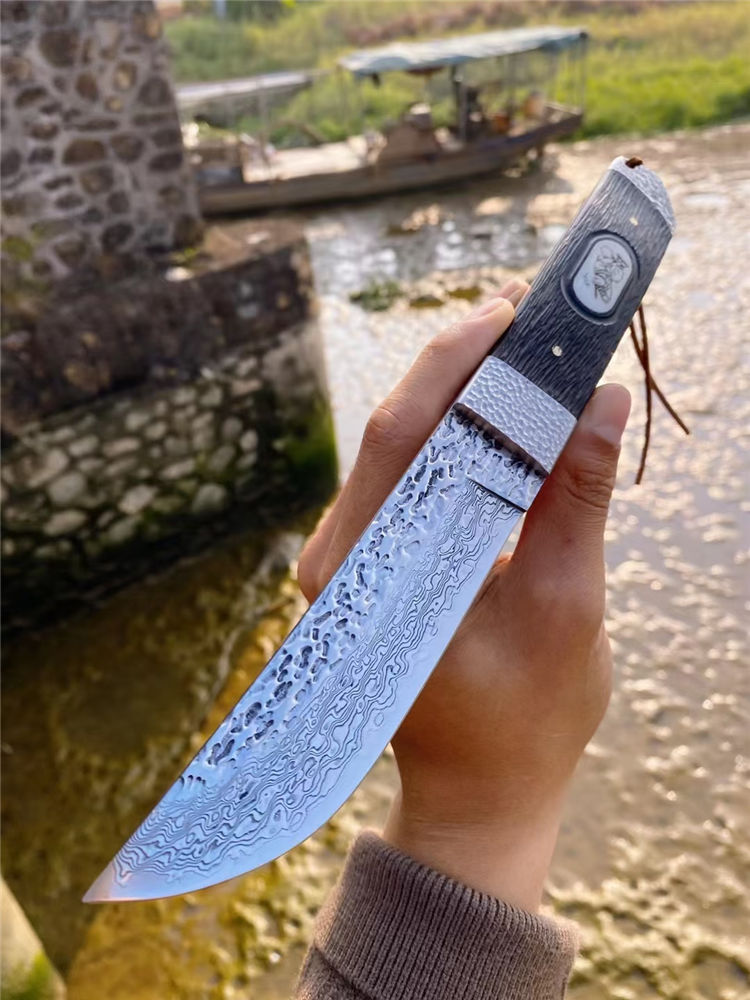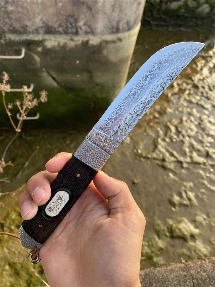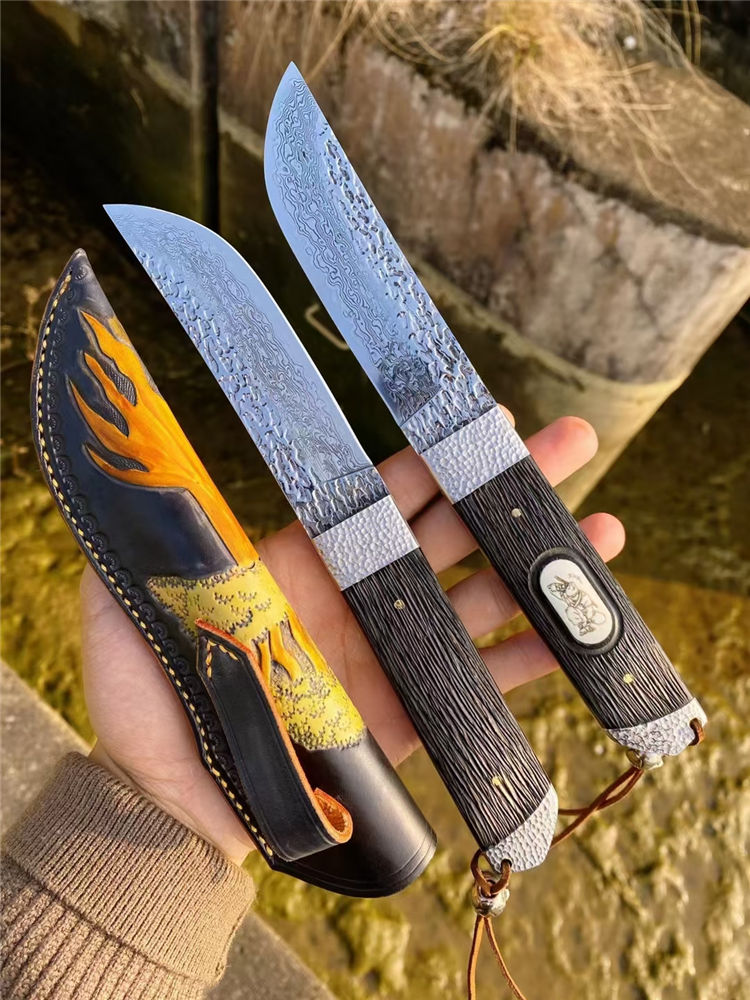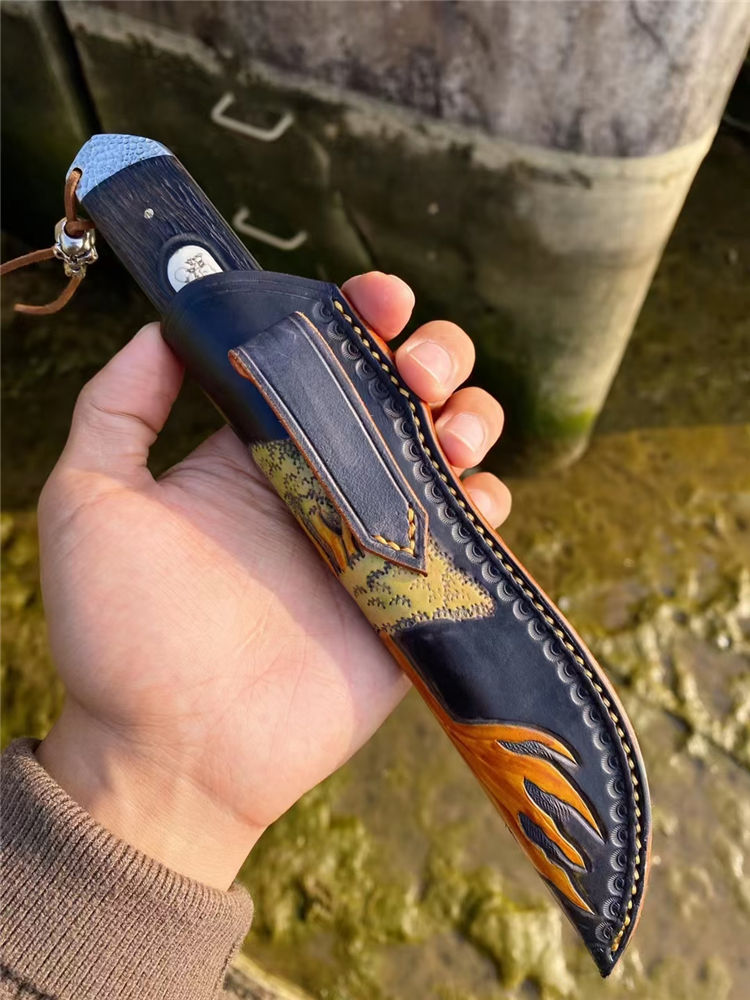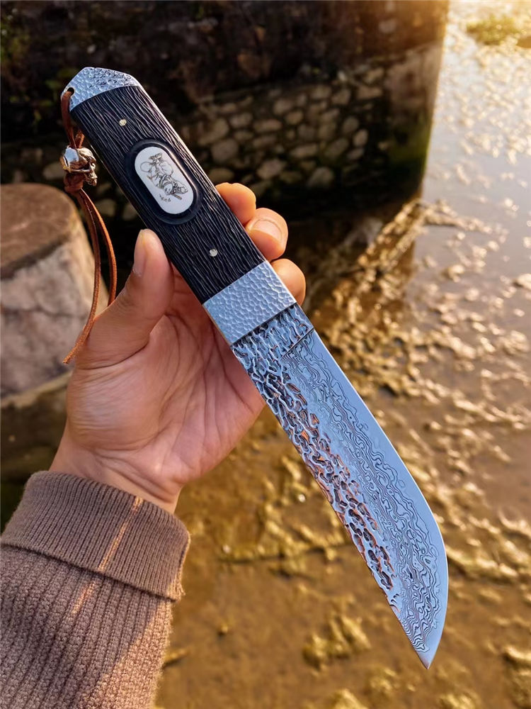 大马士革黑忍者武士刀 总长:25.2cm 刃长:13cm 手柄:12cm 刃材:进口锻造VG10大马士革钢 刃宽:3cm 厚度:4.2MM 柄材:复古钢头+黑檀木 硬度:60HRC 开刃方式:二次手工研磨 皮套:进口意大利手工雕花(生命之树)图案制作刀套